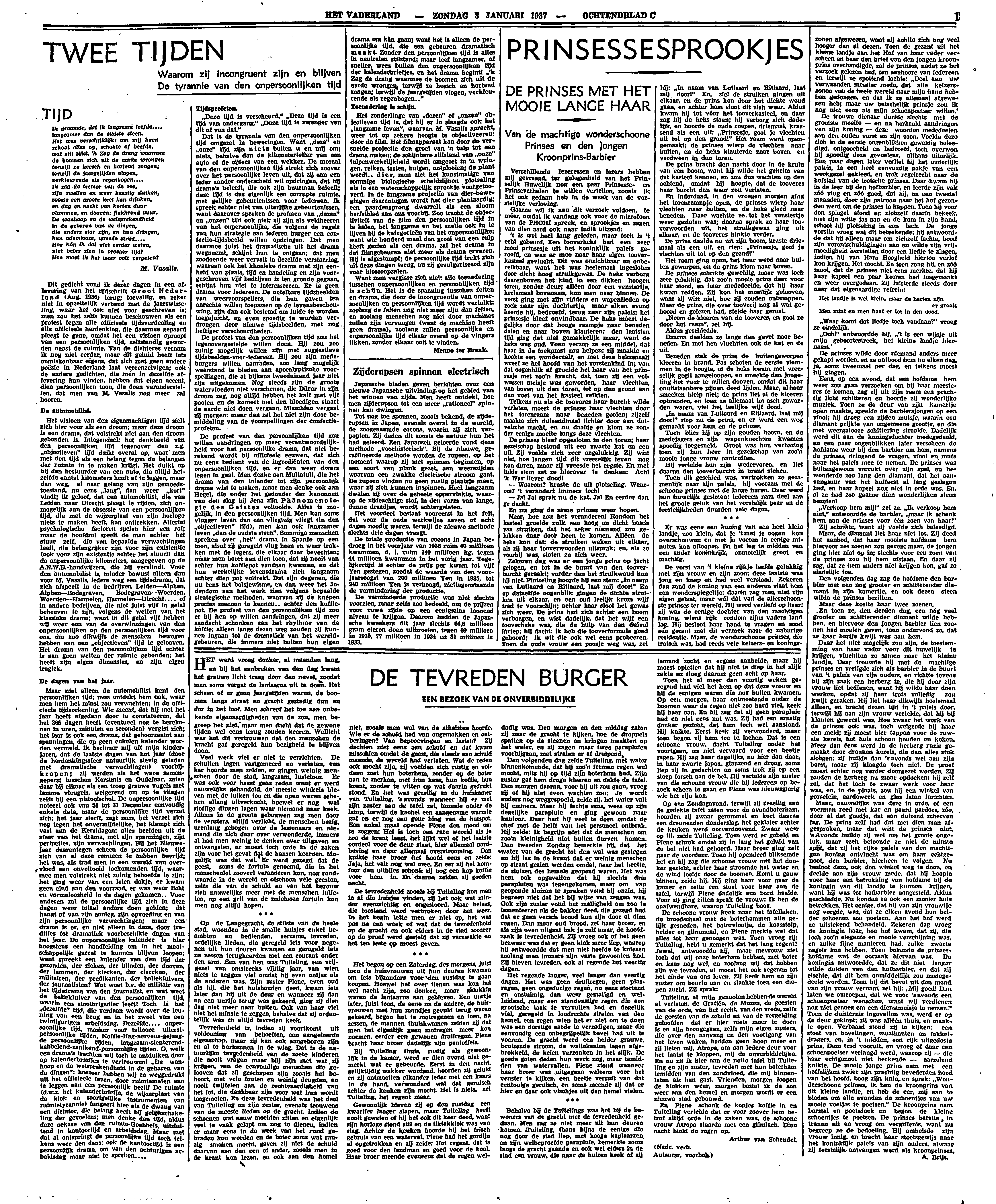 De profeet van den persoonlijken tijd zou willen aandringen op meer verantwoordelijkheid voor het persoonlijke drama, dat niet berekend wordt bij officieele eeuwen, dat zich nu eens bedient van de ingrediënten van den onpersoonlijken tijd, en er dan weer dwars tegen in gaat. Men denke aan Multatuli, die het drama van den inlander tot zijn persoonlijk drama wist te maken, maar men denke ook aan Hegel, die onder het gedonder der kanonnen van den slag bij Jena zijn Phänomenologie des Geistes voltooide. Alles is mogelijk, in den persoonlijken tijd. Men kan soms vlugger leven dan een vliegtuig vliegt (in den ‘objectieven’ tijd), men kan ook langzamer leven ‘dan de oudste steen’. Sommige menschen spreken over ‘het’ drama in Spanje op een toon, alsof zij geregeld vlug heen en weer trokken met de legers, die elkaar daar bevechten; maar men hoort aan dien toon, dat zij nooit van achter hun koffiepot vandaan kwamen, en dat hun werkelijke levensdrama zich langzaam achter dien pot voltrekt. Dat zijn degenen, die nu eens het bolsjewisme, en dan weer het Jodendom aan het werk zien volgens bepaalde strategische methoden, waarvan zij de knepen precies meenen te kennen.. achter den koffiepot. De profeet van den persoonlijken tijd zou er bij hen op willen aandringen, dat zij meer aandacht schonken aan het rhythme van de koffie; alleen langs dezen weg zouden zij kunnen ingaan tot de dramatiek van het wereldgebeuren, die immers niet buiten hun eigen drama om kàn gaan; want het is alleen de persoonlijke tijd, die een gebeuren dramatisch maakt. Zonder den persoonlijken tijd is alles in neutralen stilstand; maar leef langzamer, of sneller, wees buiten den onpersoonlijken tijd der kalenderbriefjes, en het drama begint! ‘'k Zag de drang waarmee de boomen zich uit de aarde wrongen, terwijl ze heesch en hortend zongen; terwijl de jaargetijden vlogen, verkleurende als regenbogen..’