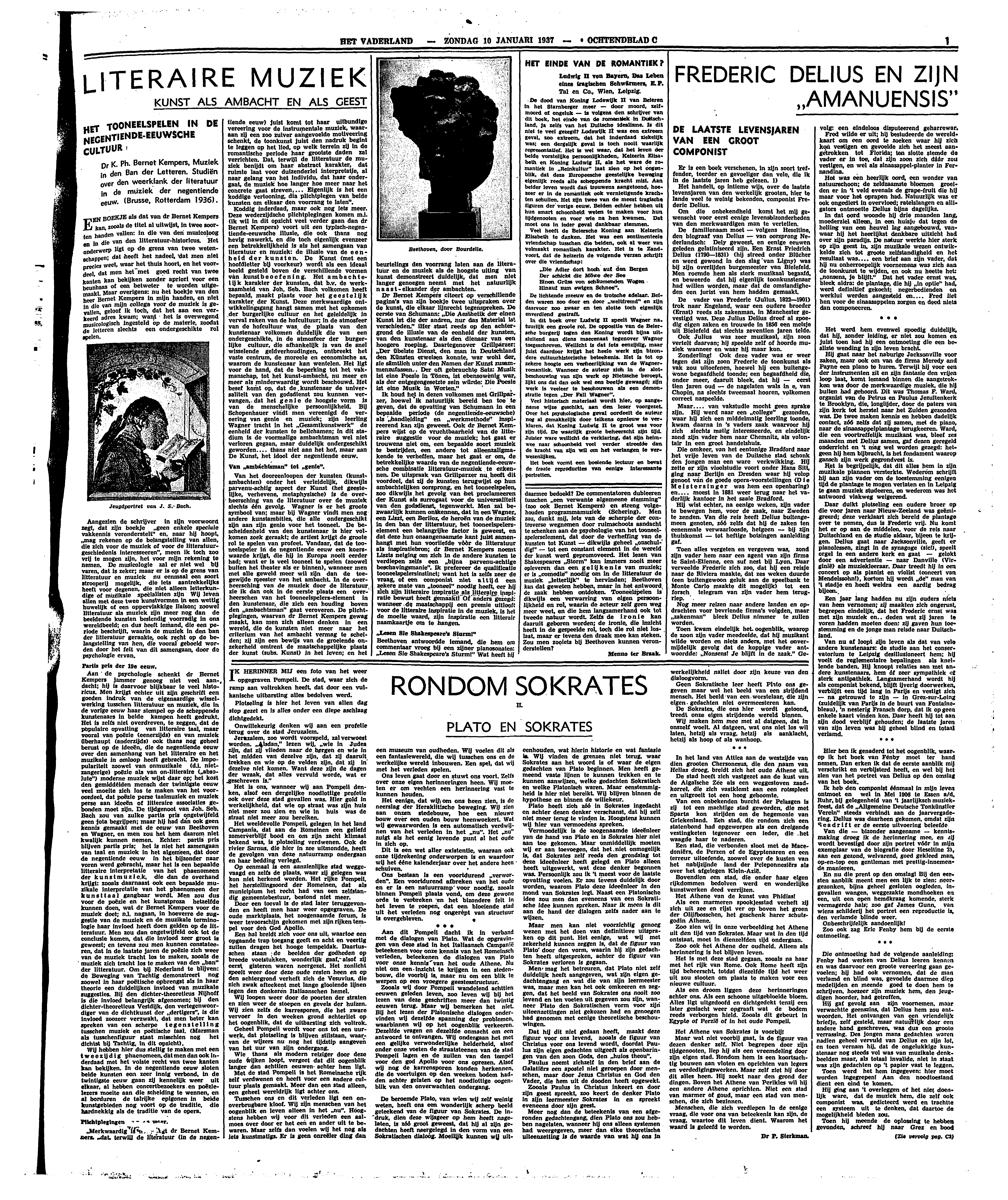Koddig inderdaad, maar ook nog iets meer. Deze wederzijdsche plichtplegingen komen m.i. (ik wil in dit opzicht veel verder gaan dan dr Bernet Kempers) voort uit een typisch-negentiende-eeuwsche illusie, die ook thans nog hevig nawerkt, en die toch eigenlijk evenzeer een betrekkelijkheid is als het samengaan van literatuur en muziek: de illusie van de eenheid der kunsten. De Kunst (met een hoofdletter bij voorkeur) wordt als een ideaal beeld gesteld boven de verschillende vormen van kunstbeoefening. Het ambachtelijk karakter der kunsten, dat b.v. de werkzaamheid van Joh. Seb. Bach volkomen heeft bepaald, maakt plaats voor het geestelijk karakter der Kunst. Deze merkwaardige ontwikkelingsgang hangt samen met het opkomen der burgerlijke cultuur en het geleidelijk in verval raken van de hofcultuur; in de atmosfeer van de hofcultuur was de plaats van den kunstenaar volkomen duidelijk die van een ondergeschikte, in de atmosfeer der burgerlijke cultuur, die afhankelijk is van de snel wisselende geldverhoudingen, ontbreekt het vaste centrum, de moreele en economische as, waarom de kunstenaar kan wentelen. Het ligt voor de hand, dat de beperking tot het vakmanschap, tot het kunst-ambacht, nu meer en meer als minderwaardig wordt beschouwd. Het besef komt op, dat de kunstenaar de universaliteit van den godsdienst zou kunnen vervangen, dat het genie de hoogste vorm is van de menschelijke persoonlijkheid. Bij Schopenhauer vindt men vereenigd de vereering van genie en muziek; zijn leerling Wagner tracht in het ‘Gesamtkunstwerk’ de eenheid der kunsten te belichamen; in dit stadium is de voormalige ambachtsman wel niet verloren gegaan, maar duidelijk ondergeschikt geworden.... thans niet aan het hof, maar aan De Kunst, het idool der negentiende eeuw.