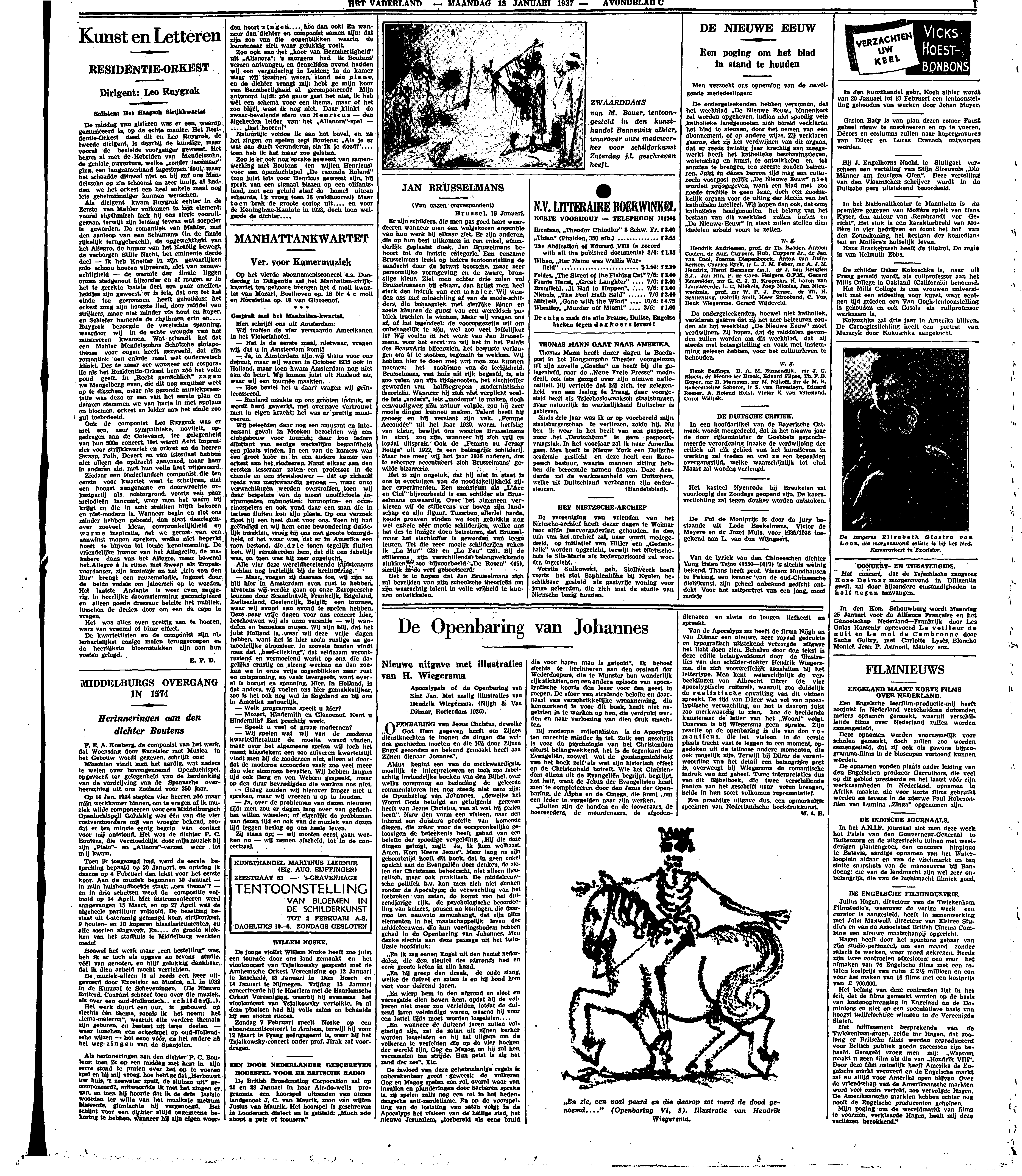 Van de Apocalyps nu heeft de firma Nijgh en van Ditmar een nieuwe, zeer royaal gedrukte en typografisch uitstekend verzorgde uitgave het licht doen zien. Behalve door den tekst is deze editie belangwekkend door de illustraties van den schilder-dokter Hendrik Wiegersma, die zich voortreffelijk aansluiten bij het lettertype. Men kent waarschijnlijk de verbeeldingen van Albrecht Dürer (de vier apocalyptische ruiters!), waaruit zoo duidelijk de realistische opvatting van dit visioen spreekt. De tijd van Dürer was vol van apocalyptische verwachting, en het is daarom juist zoo merkwaardig te zien, hoe de beeldende kunstenaar de letter van het ‘Woord’ volgt. Daarvan is bij Wiegersma geen sprake. Zijn reactie op de openbaring is die van den romanticus, die het visioen in de eerste plaats tracht vast te leggen in een moment, opgedoken uit de tallooze andere momenten, die ook mogelijk zijn. Terwijl bij Dürer de verantwoording van het detail een belangrijke post is, overweegt bij Wiegersma de romantische indruk van het geheel. Twee interpretaties dus van dit Bijbelboek, die twee verschillende kanten van het geschrift naar voren brengen, beide in hun soort volkomen representatief.