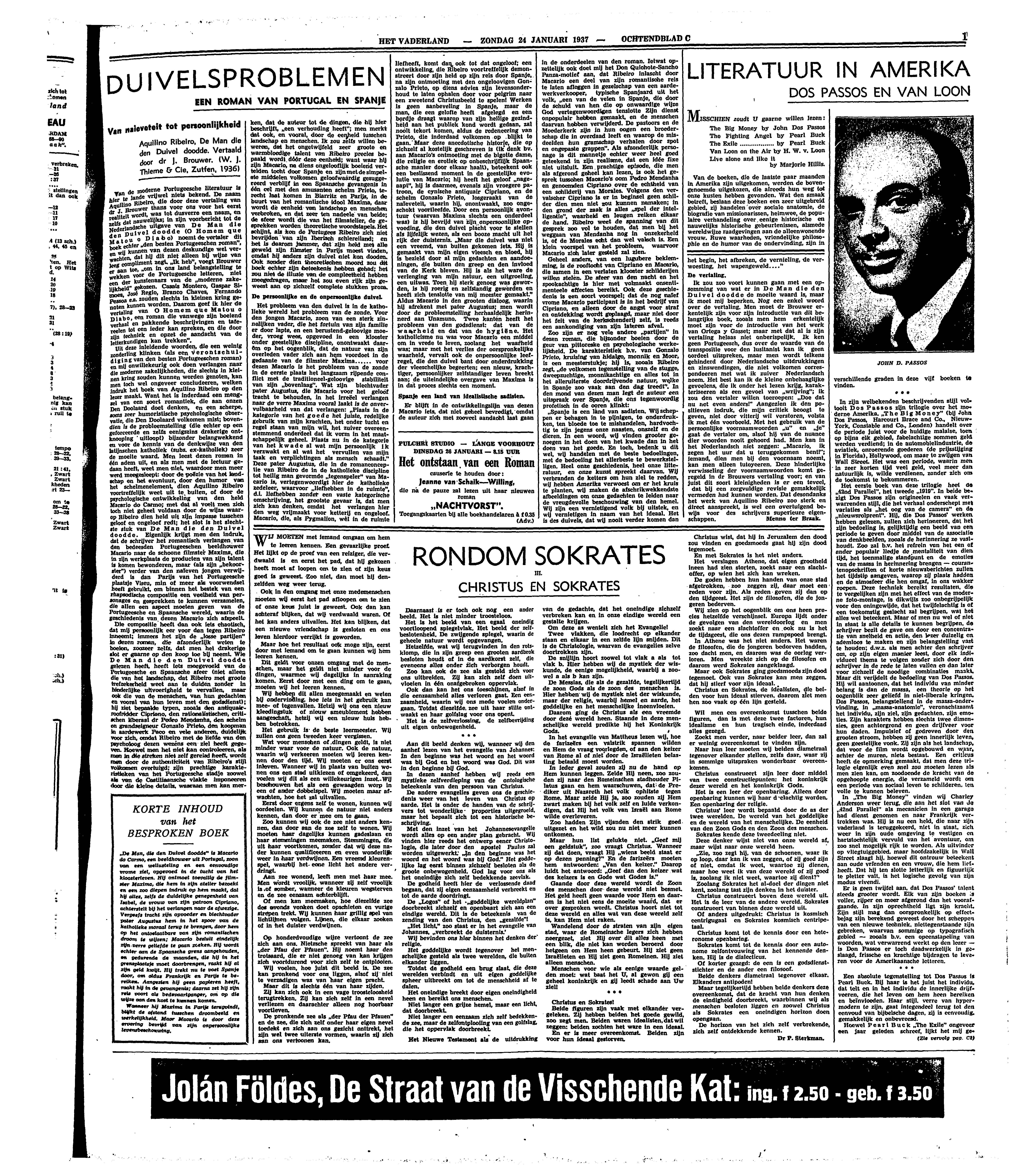 Die compositie heeft dan ook iets chaotisch, dat mij persoonlijk eer voor dan tegen Ribeiro inneemt; immers het zijn de ‘losse partijen’ in dezen roman, die afzonderlijk weten te boeien, zoozeer zelfs, dat men het drakerige slot er gaarne op den koop toe bij neemt. Wie De Man die den Duivel doodde gelezen heeft, heeft iets meegevoeld van de Portugeesche en Spaansche sfeer (niet alleen die van het landschap, dat Ribeiro met groote trefzekerheid weet aan te duiden zonder in hinderlijke uitvoerigheid te vervallen, maar ook die van de menschen, van hun gedachten en vooral van hun leven met den godsdienst); hij ziet bepaalde typen, zooals den antiquairroofridder Cipriano, den rationalistischen, critischen liberaal dr Pedro Mendanha, den schelm en grandseigneur Gonzalo Prieto, den koopman in aardewerk Paco en vele anderen, duidelijk voor zich, omdat Ribeiro met de liefde van den psycholoog dezen wezens een ziel heeft gegeven. Hoewel men het niet kan controleeren, als men in die streken niet zelf gereisd heeft, wordt men door de authenticiteit van Ribeiro's stijl volkomen overtuigd; zijn prachtige karakteristieken van het Portugeesche stadje zoowel als van de Castiliaansche vlakte imponeeren door die kleine details, waaraan men kan merken, dat de auteur tot de dingen, die hij hier beschrijft, ‘een verhouding heeft’; men merkt dat ook, en vooral, door de eenheid tusschen landschap en menschen. Ik zou zelfs willen beweren, dat het ongetwijfeld zeer groote en warmbloedige talent van Ribeiro precies bepaald wordt dóór deze eenheid; want waar hij zijn Macario, na diens ongelooflijk boeiend vertelden tocht door Spanje en zijn met de simpelste middelen volkomen geloofwaardig gesuggereerd verblijf in een Spaansche gevangenis in één cel met den amusanten schelm Prieto, terecht laat komen in Biarritz en Parijs, in de buurt van het romantische idool Maxima, daar wordt de eenheid van landschap en menschen verbroken, en dat zeer ten nadeele van beide; de sfeer wordt die van het filmatelier, de gesprekken worden theoretische woordstapels. Het schijnt, als kon de Portugees Ribeiro zich niet bevrijden van zijn Iberisch schiereiland; en het is daarom jammer, dat zijn held met alle geweld zijn filmster in Parijs moest vinden, omdat hij anders zijn duivel niet kon dooden. Ook zonder dien theoretischen moord zou dit boek echter zijn beteekenis hebben gehad; het zou niet de illusie van de compleetheid hebben meegedragen, maar het zou even rijk zijn geweest aan op zichzelf complete stukken proza.