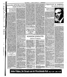 Het probleem van den duivel is in de katholieke wereld het probleem van de zonde. Voor den jongen Macario, zoon van een sterk zinnelijken vader, die het fortuin van zijn familie er door lapte, en een berustend-geloovige moeder, vroeg wees, opgevoed in een klooster onder geestelijke discipline, onontwaakt daarom op het oogenblik, dat de natuur van zijn overleden vader zich aan hem voordoet in de gedaante van de filmster Maxima...... voor dezen Macario is het probleem van de zonde in de eerste plaats het langzaam rijpende conflict met de traditioneel-geloovige stabiliteit van zijn ‘bovenlaag’. Wat zijn biechtvader pater Augustus, die Macario voor het geloof tracht te behouden, in het irreëel verlangen naar de verre Maxima vooral laakt is de onvervulbaarheid van dat verlangen: ‘Plaats in de kategorie van het goede het juiste, redelijke gebruik van mijn krachten, het onder tucht en regel staan van mijn wil, het zuiver overeenstemmend onderdeel dat ik vorm in het maatschappelijk geheel. Plaats nu in de kategorie van het kwade al wat mijn persoonlijk ik verzwakt en al wat het vervullen van mijn taak en verplichtingen als mensch schaadt.’ Deze pater Augustus, die in de romanconceptie van Ribeiro de in de katholieke discipline tot heilig man gevormde ‘tegenspeler’ van Macario is, vertegenwoordigt hier de katholieke zedeleer, waarvoor ‘liefhebben in de ruimte’, d.i. liefhebben zonder een vaste kategorische omschrijving, het grootste gevaar is, dat men zich kan denken, omdat het verlangen hier den weg vrijmaakt voor ketterij en ongeloof. Macario, die, als Pygmalion, wèl in de ruimte liefheeft, komt dan ook tot dat ongeloof; een ontwikkeling, die Ribeiro voortreffelijk demonstreert door zijn held op zijn reis door Spanje, na zijn ontmoeting met den ongeloovigen Gonzalo Prieto, op diens advies zijn levensonderhoud te laten ophalen door voor pelgrim naar een zweetend Christusbeeld te spelen! Werken is geen aanbeveling in Spanje, maar de man, die een gelofte heeft afgelegd en een bordje draagt waarop van zijn heilige gezindheid aan het publiek kond wordt gedaan, zal nooit tekort komen, aldus de redeneering van Prieto, die inderdaad volkomen op blijkt te gaan. Maar deze anecdotische historie, die op zichzelf al kostelijk geschreven is (ik denk bv. aan Macario's ontmoeting met de bigotte dame, die religie en erotiek op onbeschrijflijk Spaansche manier door elkaar haalt), beteekent ook een beslissend moment in de geestelijke evolutie van Macario; hij heeft het geloof ‘nageaapt’, hij is daarmee, evenals zijn vroegere patroon, de cynische antiquair Cipriano, en de schelm Gonzalo Prieto, losgeraakt van de naïeveteit, waarin hij, onontwaakt, zoo ongeschokt voortleefde. Door een persoonlijk avontuur (waarvan Maxima slechts een onderdeel was) is hij bevrijd van zijn onpersoonlijke opvoeding, die den duivel placht voor te stellen als lijfelijk wezen, als een booze macht uit het rijk der duisternis. ‘Maar die duivel was niet een vreemd, van buiten gekomen iets. Hij is gemaakt van mijn eigen vleesch en bloed, hij is bezield door al mijn gedachten en aandoeningen, die buiten den greep en den invloed van de Kerk bleven. Hij is als het ware de verlenging van mijn natuur, een uitgroeiing een uitwas. Toen hij sterk genoeg was geworden, is hij roerig en zelfstandig geworden en heeft zich tenslotte van mij meester gemaakt.’ Aldus Macario in den grooten dialoog, waarin hij afrekent met pater Augustus; men wordt door de probleemstelling herhaaldelijk herinnerd aan Unamuno. Twee kanten heeft het probleem van den godsdienst: dat van de waarheid en dat van de hygiëne. Het katholicisme nu was voor Macario een middel om in vrede te leven, zoolang het waarheid was; maar met het verlies der oorspronkelijke waarheid, vervalt ook de onpersoonlijke leefregel, die den duivel bant door onderdrukking der vleeschelijke begeerten; een nieuw, krachtiger, persoonlijker zelfstandiger leven breekt aan; de uiteindelijke overgave van Maxima is in dat proces slechts een moment.
