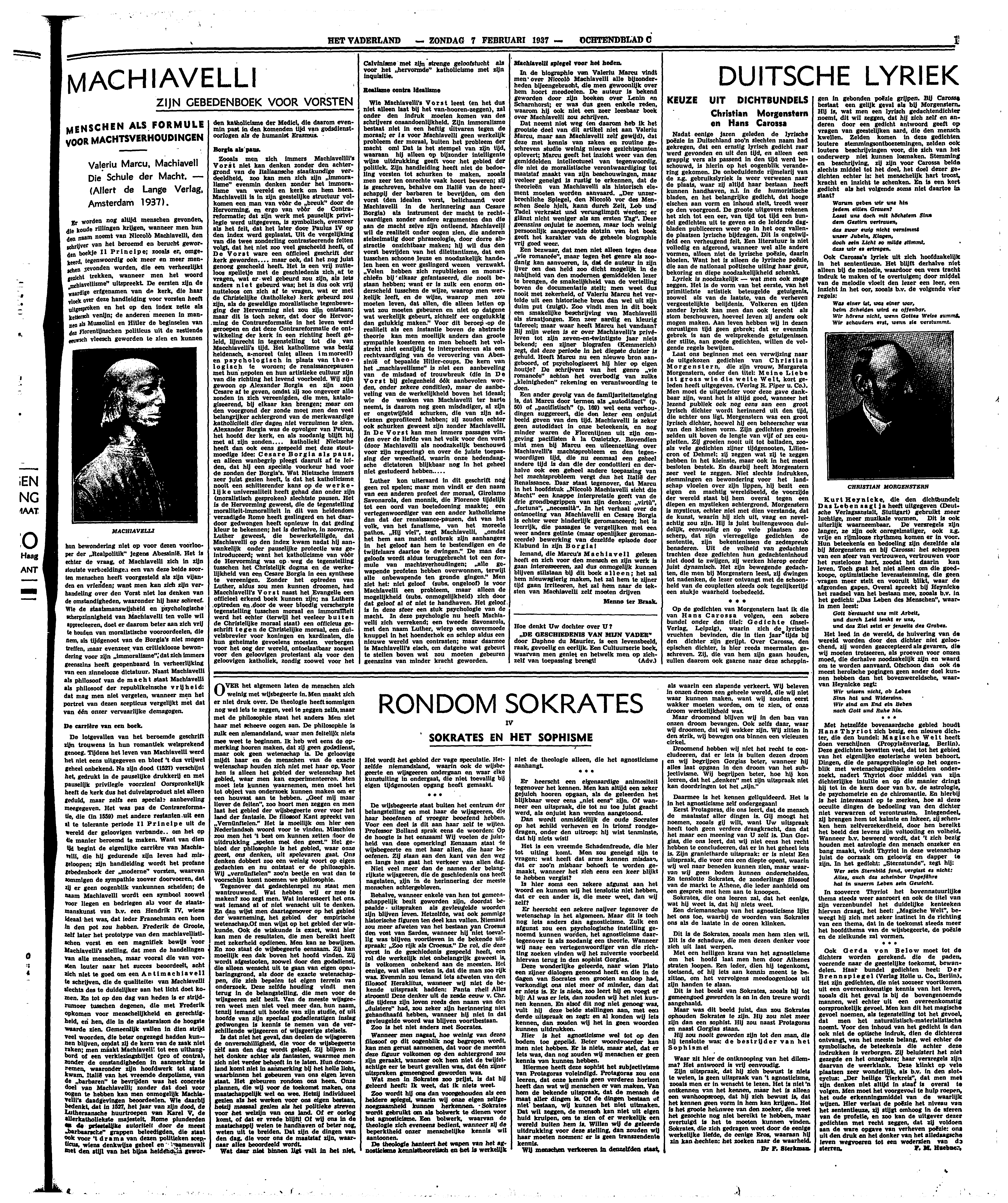 Een ander gevolg van de familjariteitsneiging is, dat Marcu door termen als ‘autodidact’ (p. 50) of ‘pacifistisch’ (p. 169) wel eens verhoudingen suggereert die den lezer een onjuist beeld geven van den tijd. Machiavelli is zeker geen autodidact in onze beteekenis, en nog minder waren de Florentijnen uit zijn omgeving pacifisten à la Ossietzky. Bovendien mist men bij Marcu een uiteenzetting over Machiavelli's machtsprobleem en den tegenwoordigen tijd, die nu eenmaal een geheel andere tijd is dan die der condottieri en derhalve ook een geheel andere toepassing van het machtsprobleem vergt dan het Italië der Renaissance. Daar staat tegenover, dat Marcu in het hoofdstuk ‘Niccolò Machiavelli sicht die Macht’ een knappe interpretatie geeft van de drie grondbegrippen van zijn denken: ‘virtù’, ‘fortuna’, ‘necessità’. In het verhaal over de ontmoeting van Machiavelli en Cesare Borgia is echter weer hinderlijk geromanceerd; het is leerrijk, die passages te vergelijken met een weer anders getinte (maar openlijker geromanceerde) bewerking van dezelfde episode door Klabund in zijn Borgia!