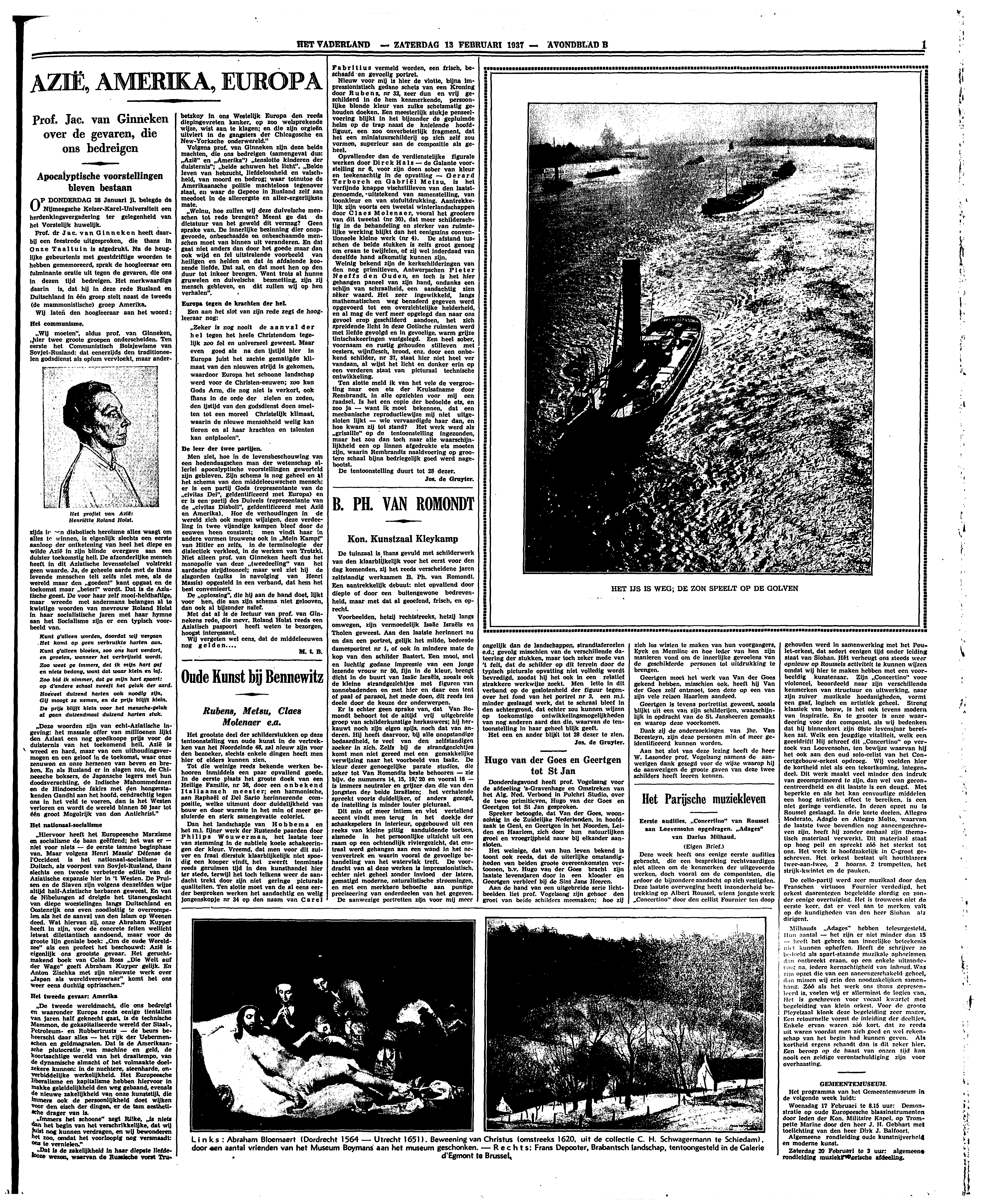 ‘Hiervoor heeft het Europeesche Marxisme en socialisme de baan geëffend; het was er - niet voor niets - de eerste tamme beginphase van. Maar volgens Henri Massis' Défense de l'Occident is het nationaal-socialisme in Duitsch, als voorpost van Sovjet-Rusland, thans slechts een tweede verbeterde editie van de Aziatische expansie hier in 't Westen. De Pruisen en de Slaven zijn volgens denzelfden wijze altijd half-Aziatische barbaren geweest. En van de Nibelungen af dreigde het titanengeslacht van diepe woestelingen langs Duitschland en Oostenrijk ons even noodlottig te overrompelen als het de aanval van den Islam op Weenen deed. Wat hiervan zij, onze Abraham Kuyper heeft in zijn, voor de concrete feiten wellicht ietwat dilettantisch aandoend, maar voor de groote lijn geniale boek: “Om de oude Wereldzee” als een profeet het beschouwd: Azië is eigenlijk ons grootste gevaar. Het geruchtmakend boek van Colin Ross “Die Welt auf der Wage” geeft Abraham Kuyper gelijk. En Anton Zischka met zijn nieuwste werk over “Japan als wereldveroveraar” komt het ons weer eens duchtig opfrisschen.’