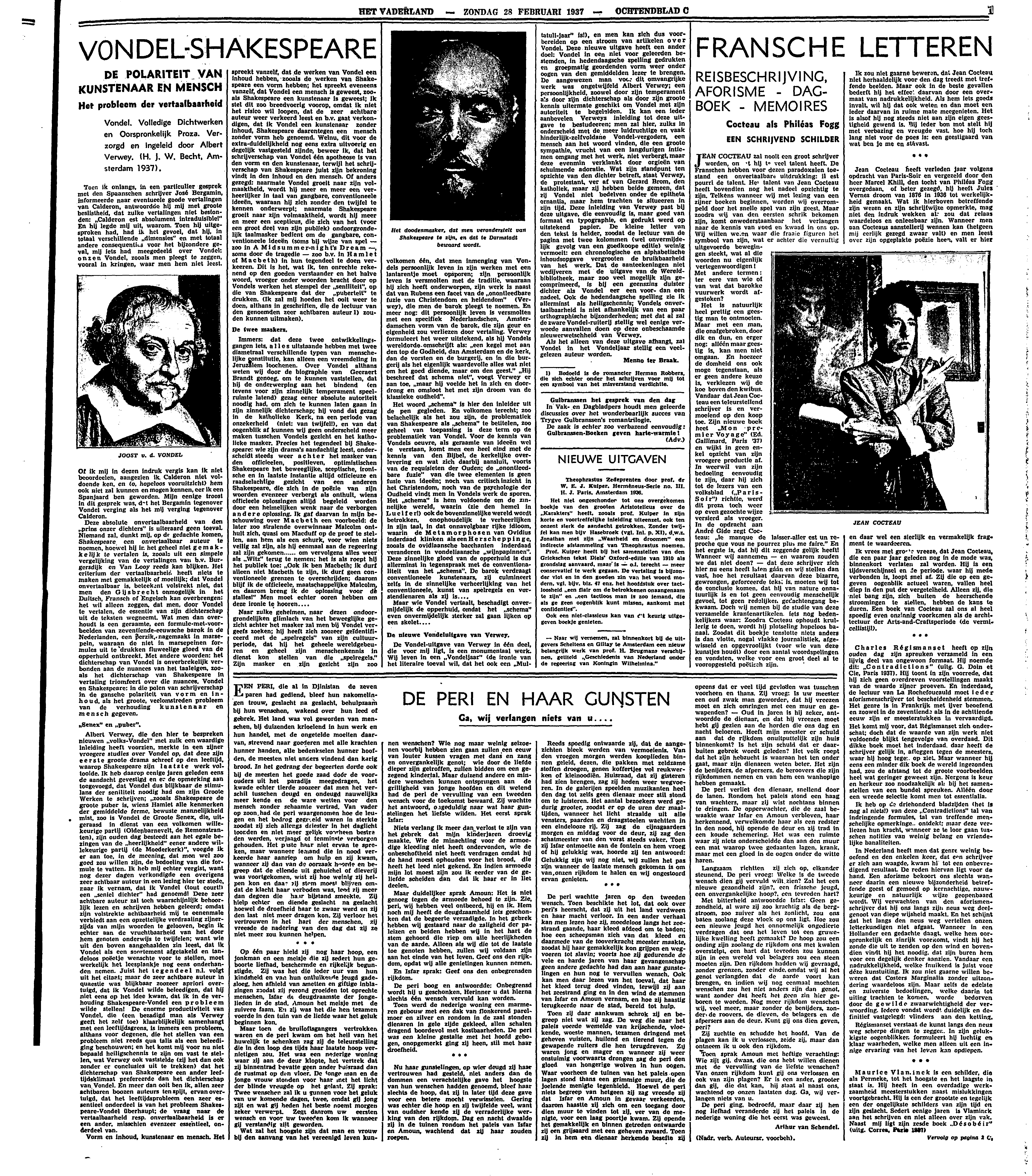 Toen ik onlangs, in een particulier gesprek met den Spaanschen schrijver José Bergamin, informeerde naar eventueele goede vertalingen van Calderon, antwoordde hij mij met groote beslistheid, dat zulke vertalingen niet bestonden: ‘Calderon est absolument intraduisible!’ En hij legde mij uit, waarom. Toen hij uitgesproken had, had ik het gevoel, dat hij, in totaal verschillende ‘dimensies’ en met totaal andere consequenties voor het bijzondere geval, mij iets had meegedeeld over Vondel: onzen Vondel, zooals men pleegt te zeggen, vooral in kringen, waar men hem niet leest. Of ik mij in dezen indruk vergis kan ik niet beoordeelen, aangezien ik. Calderon niet voldoende ken, en (o, hopeloos vooruitzicht) hem ook niet zal kunnen en mogen kennen, eer ik een Spanjaard ben geworden. Mijn eenige troost in dit gesprek was, dat het Bergamin tegenover Vondel verging als het mij verging tegenover Calderon.