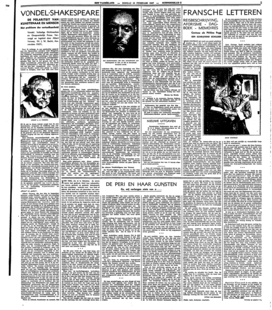 De Vondel-uitgave van Verwey in één deel, die voor mij ligt, is een monumentaal werk. Wij leven in een ‘Vondeljaar’ (de ironie van het literaire toeval wil, dat het ook een ‘Multatuli-jaar’ is!), en men kan zich dus voorbereiden op een stroom van artikelen over Vondel. Deze nieuwe uitgave heeft een ander doel: Vondel in een niet voor geleerden bestemden, in hedendaagsche spelling gedrukten en groepmatig geordenden vorm weer onder oogen van den gemiddelden lezer te brengen. De aangewezen man voor dit omvangrijke werk was ongetwijfeld Albert Verwey; een persoonlijkheid, zoowel door zijn temperament als door zijn dichterschap als door zijn groote kennis uitermate geschikt om Vondel met zijn autoriteit te begeleiden. Ik kan een ieder aanbevelen Verweys inleiding tot deze uitgave te bestudeeren; men zal hier, zulks in onderscheid met de meer luidruchtige en vaak hinderlijk-zelfvoldane Vondel-vergoders, een mensch aan het woord vinden, die een groote sympathie, vrucht van een langdurigen intiemen omgang met het werk, niet verbergt, maar deze evenmin verklankt door orgieën van schuimende adoratie. Wat zijn standpunt ten opzichte van den dichter betreft, staat Verwey, de protestant, ver af van Gerard Brom, den katholiek, maar zij hebben beide gemeen, dat zij Vondel niet bedelven onder de epitheta ornantia, maar hem trachten te situeeren in zijn tijd. Deze inleiding van Verwey past bij deze uitgave, die eenvoudig is, maar goed van formaat en typographie, en gedrukt werd op uitstekend papier. De kleine letter van den tekst is helder, zoodat de lectuur van de pagina met twee kolommen (wel onvermijdelijk gevolg van een goedkoope editie) weinig vermoeit: een chronologische en alphabetische inhoudsopgave vergrooten de bruikbaarheid van het werk. Dat de aanteekeningen niet wedijveren met de uitgave van de Wereldbibliotheek, maar zoo veel mogelijk zijn gecomprimeerd, is bij een geenszins duister dichter als Vondel eer een voor- dan een nadeel. Ook de hedendaagsche spelling zie ik allerminst als heiligschennis; Vondels onvertaalbaarheid is niet afhankelijk van een paar orthographische bijzonderheden; met dat al zal de zware Vondel-ruiterij stellig wel eenige verwoede aanvallen doen op deze onbeschaamde nieuwerwetschheid van Verwey.