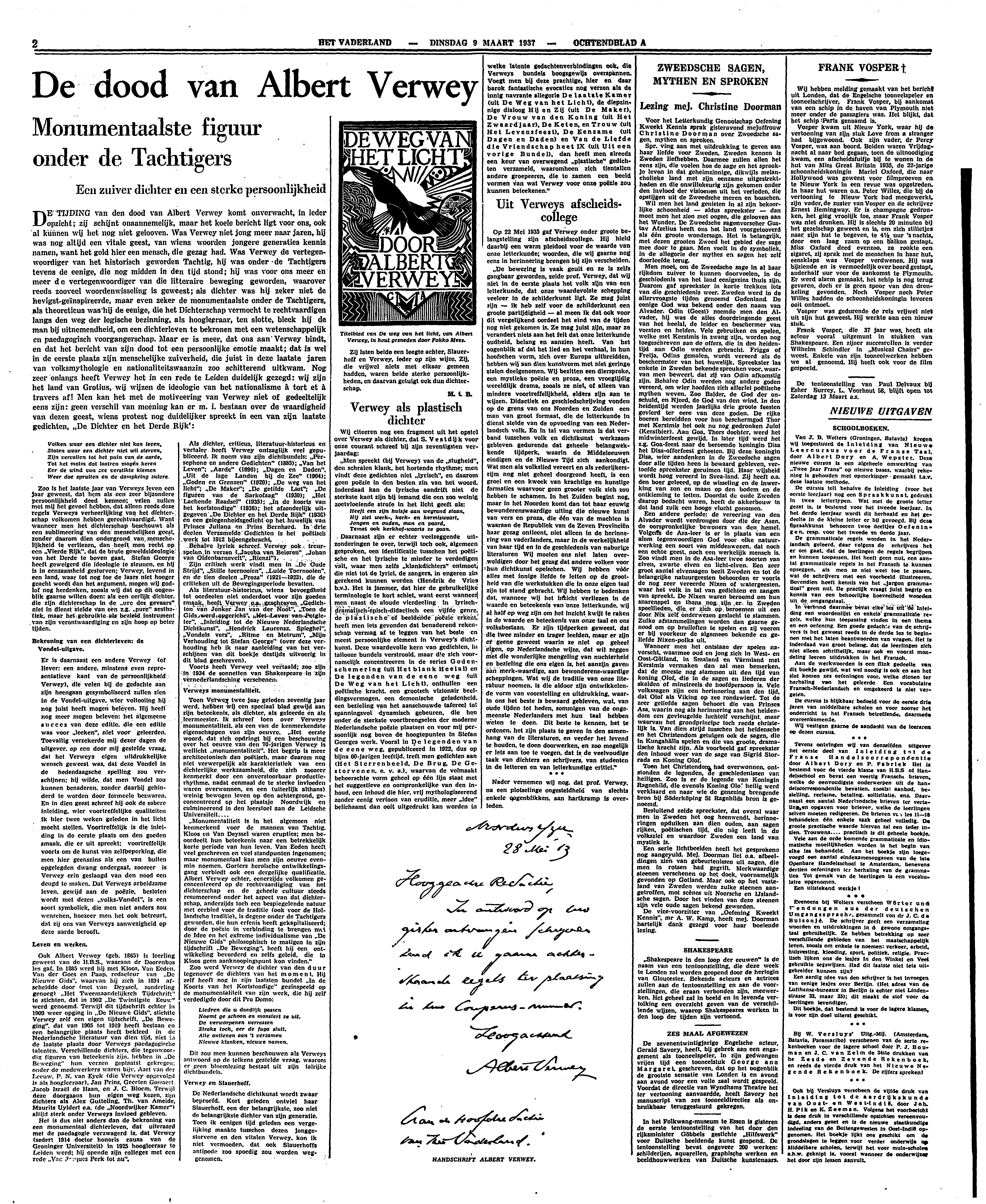 DE TIJDING van den dood van Albert Verwey komt onverwacht, in ieder opzicht; zij schijnt onaannemelijk, maar het koele bericht ligt voor ons, ook al kunnen wij het nog niet gelooven. Was Verwey niet jong meer naar jaren, hij was nog altijd een vitale geest, van wiens woorden jongere generaties kennis namen, want het gold hier een mensch, die gezag had. Was Verwey de vertegenwoordiger van het historisch geworden Tachtig, hij was onder de Tachtigers tevens de eenige, die nog midden in den tijd stond; hij was voor ons meer en meer de vertegenwoordiger van die litteraire beweging geworden, waarover reeds zooveel woordenwisseling is geweest; als dichter was hij zeker niet de hevigst-geïnspireerde, maar even zeker de monumentaalste onder de Tachtigers, als theoreticus was hij de eenige, die het Dichterschap vermocht te rechtvaardigen langs den weg der logische bezinning, als hoogleeraar, ten slotte, bleek hij de man bij uitnemendheid, om een dichterleven te bekronen met een wetenschappelijk en paedagogisch voorgangerschap. Maar er is meer, dat ons aan Verwey bindt, en dat het bericht van zijn dood tot een persoonlijke emotie maakt; dat is wel in de eerste plaats zijn menschelijke zuiverheid, die juist in deze laatste jaren van volksmythologie en nationaliteitswaanzin zoo schitterend uitkwam. Nog zeer onlangs heeft Verwey het in een rede te Leiden duidelijk gezegd: wij zijn het land van Grotius, wij wijzen de ideologie van het nationalisme à tort et à travers af! Men kan het met de motiveering van Verwey niet of gedeeltelijk eens zijn: geen verschil van meening kan er m.i. bestaan over de waardigheid van dezen geest, wiens protest nog duidelijker spreekt in een van zijn laatste gedichten, ‘De Dichter en het Derde Rijk’: