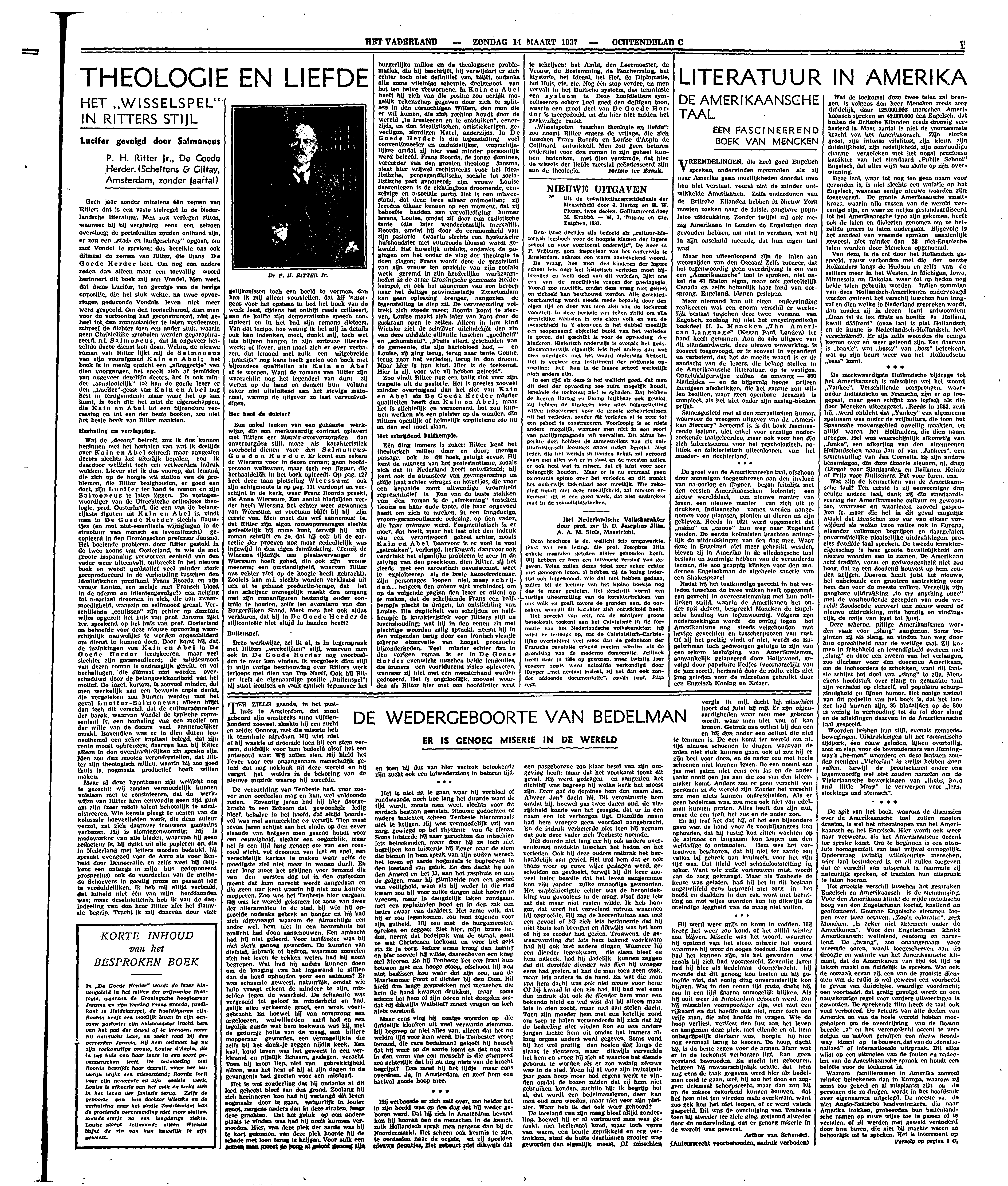 Geen jaar zonder minstens één roman van Ritter: dat is een vaste stelregel in de Nederlandsche literatuur. Men zou verlegen zitten, wanneer hij bij vergissing eens een seizoen oversloeg; de portefeuilles zouden onthand zijn, er zou een ‘stad- en landgeschrey’ opgaan, om met Vondel te spreken; dus bereikte ons ook ditmaal de roman van Ritter, die thans De Goede Herder heet. Om nog een andere reden dan alleen maar een toevallig woord herinnert dit boek mij aan Vondel. Men weet, dat diens Lucifer, ten gevolge van de hevige oppositie, die het stuk wekte, na twee opvoeringen gedurende Vondels leven niet meer werd gespeeld. Om den tooneelhemel, dien men voor de vertooning had geconstrueerd, niet geheel tot den rommelzolder te laten verdoemen, schreef de dichter toen een ander stuk, waarin geen Christelijke symbolen werden geparaphraseerd, n.l. Salmoneus, dat in ongeveer hetzelfde decor dienst kon doen. Welnu, de nieuwe roman van Ritter lijkt mij de Salmoneus van zijn voorafgaand Kain en Abel; het boek is in menig opzicht een ‘afleggertje’ van dien voorganger, het speelt zich af temidden van ongeveer dezelfde decors, het is ook minder ‘aanstootelijk’ (a) kan de goede lezer er den ‘Lucifer’-geest van Kain en Abel nog best in terugvinden); maar waar het op aan komt, is toch dit: het mist de eigenschappen, die Kain en Abel tot een bijzondere verrassing en tot een der beste boeken, zoo niet het beste boek van Ritter maakten.