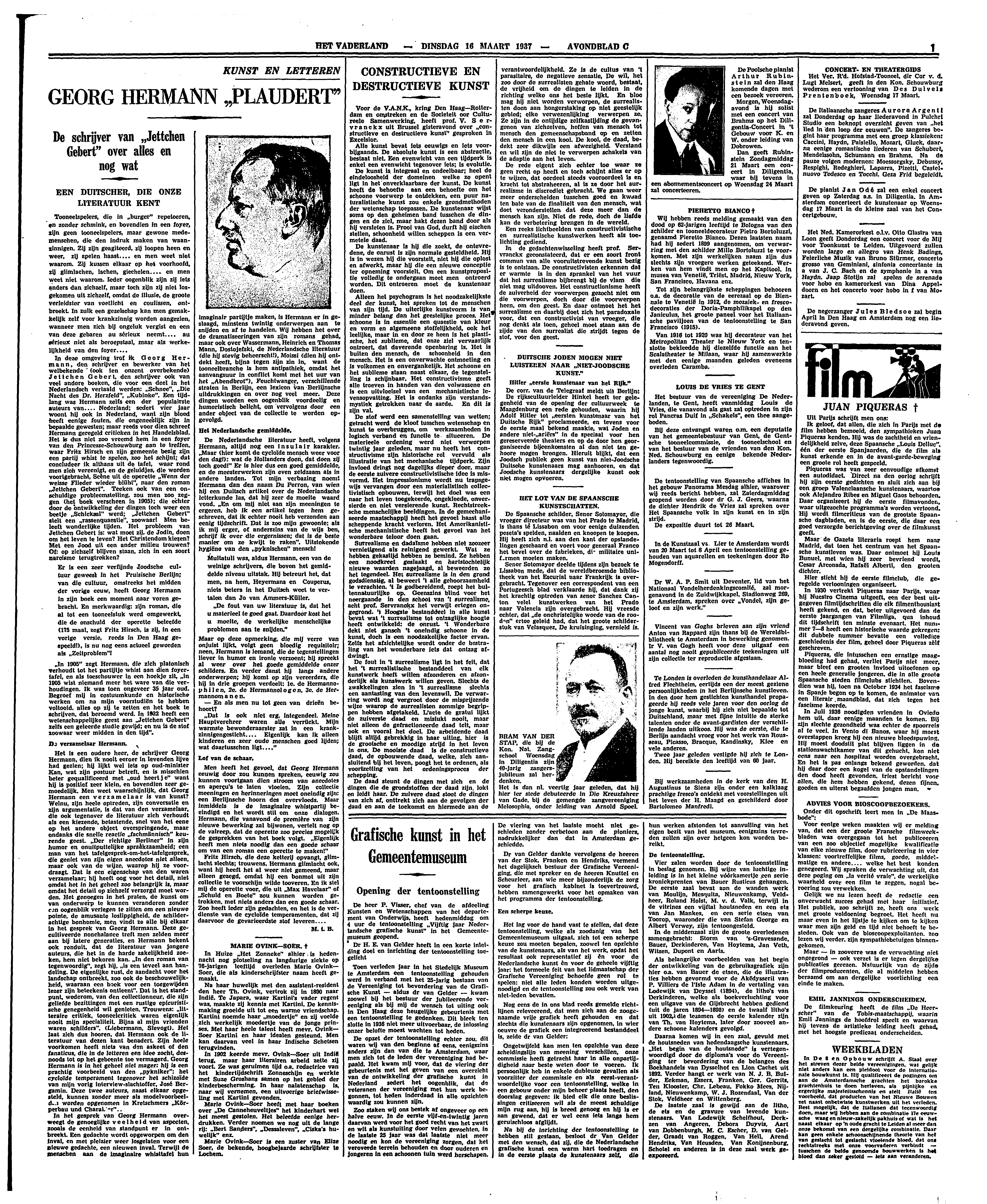 In deze omgeving trof ik Georg Hermann, den schrijver en bewerker van het welbekende (ook ten onzent overbekende) Jettchen Gebert, den schrijver ook van veel andere boeken, die voor een deel in het Nederlandsch vertaald werden: ‘Schnee’, ‘Die Nacht des Dr. Herzfeld’, ‘Kubinke’. Een tijdlang was Hermann zelfs een der populairste auteurs van.... Nederland; sedert vier jaar woont hij ook in Nederland, want zijn bloed heeft eenige fouten, die ongeneeslijk zijn in bepaalde gewesten; maar reeds voor dien schreef Hermann geregeld critieken in het Handelsblad. Het is dus niet zoo vreemd hem in een foyer van den Princesse-Schouwburg aan te treffen, waar Fritz Hirsch en zijn gemeente bezig zijn een partij whist te spelen, zoo het schijnt; dat concludeer ik althans uit de tafel, waar rond men zich vereenigt, en de geluidjes, die worden voortgebracht, Scène uit de operette ‘Wenn der weisse Flieder wieder blüht’, naar den roman ‘Jettchen Gebert’. Teeken ook van een onschuldige probleemstelling, zou men zoo zeggen (het boek verscheen in 1905); die echter door de ontwikkeling der dingen toch weer een beetje ‘Schicksal’ werd; ‘Jettchen Gebert’ stelt een ‘rassenquaestie’, zoowaar! Men beleeft wonderlijke tijden. Het probleem van Jettchen Gebert is: wat moet zij, de Jodin, doen om het leven te leven? Het Christendom kiezen? Met een Jood uit een ander milieu trouwen? Of: op zichzelf blijven staan, zich in een soort narcisme terugtrekken?
