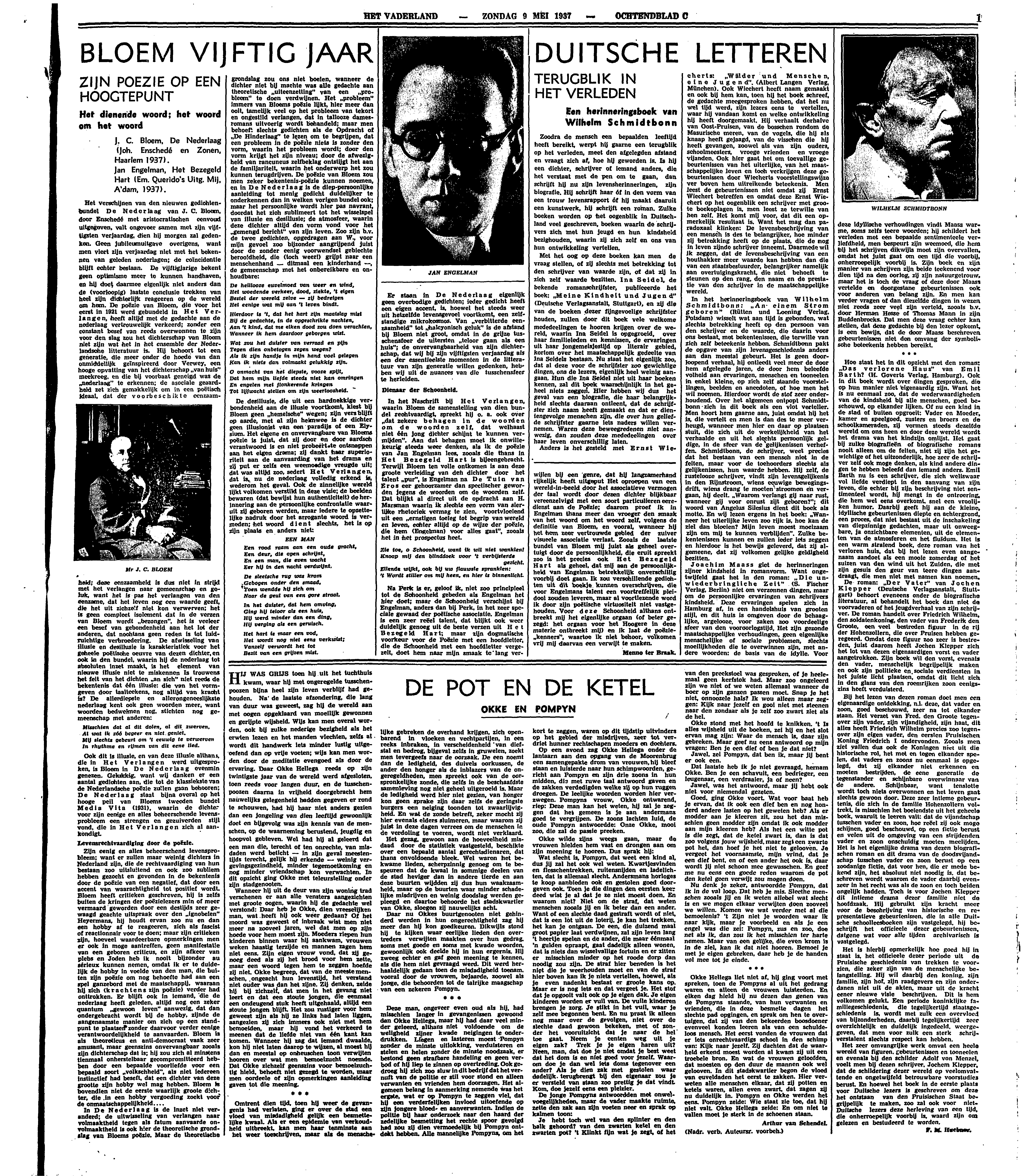 Het verschijnen van den nieuwen gedichtenbundel De Nederlaag van J.C. Bloem, door Enschedé met aristocratischen eenvoud uitgegeven, valt ongeveer samen met zijn vijftigsten verjaardag, dien hij morgen zal gedenken. Geen jubileumuitgave overigens, want men viert zijn verjaardag niet met het bekennen van geleden nederlagen; de coïncidentie blijft echter bestaan. De vijftigjarige bekent geen optimisme meer te kunnen handhaven, en hij doet daarmee eigenlijk niet anders dan de (voorloopig) laatste conclusie trekken van heel zijn dichterlijk reageeren op de wereld om hem. De poëzie van Bloem, die voor het eerst in 1921 werd gebundeld in Het Verlangen, heeft altijd met de gedachte aan de nederlaag vertrouwelijk verkeerd; zonder een constant besef van reeds overwonnen te zijn voor den slag zou het dichterschap van Bloem niet zijn wat het in het ensemble der Nederlandsche litteratuur is. Hij behoort tot een generatie, die meer onder de hoede van dan onmiddellijk geïnspireerd door Verwey, een hooge opvatting van het dichterschap ‘van huis’ meekreeg, en die bij voorbaat geneigd was de ‘nederlaag’ te erkennen; de asociale geaardheid zet zich gemakkelijk om in een poëtisch ideaal, dat der voorbeschikte eenzaamheid; deze eenzaamheid is dus niet in strijd met het verlangen naar gemeenschap en geluk, want het is pas het verlangen van den eenzame, dat het leven nog een waarde geeft, die het uit zichzelf niet kon verwerven; het is geen compleet isolement dat in de verzen van Bloem wordt ‘bezongen’, het is veeleer een besef van gebondenheid aan het lot der anderen, dat nochtans geen reden is tot luidruichtige verbroedering. De afwisseling van illusie en desillusie is karakteristiek voor het geheele poëtische oeuvre van dezen dichter, en ook in den bundel, waarin hij de nederlaag tot absoluten inzet maakt, is het element van nieuwe illusie niet te miskennen Is trouwens het feit van het dichten ‘an sich’ niet reeds de bekentenis dat één illusie: die van het vormgeven door taalteekens, nog altijd van kracht is? De allerdiepste en allerongeneeslijkste nederlaag kent ook geen woorden meer, want woorden bedwelmen nog, stichten nog gemeenschap met anderen: