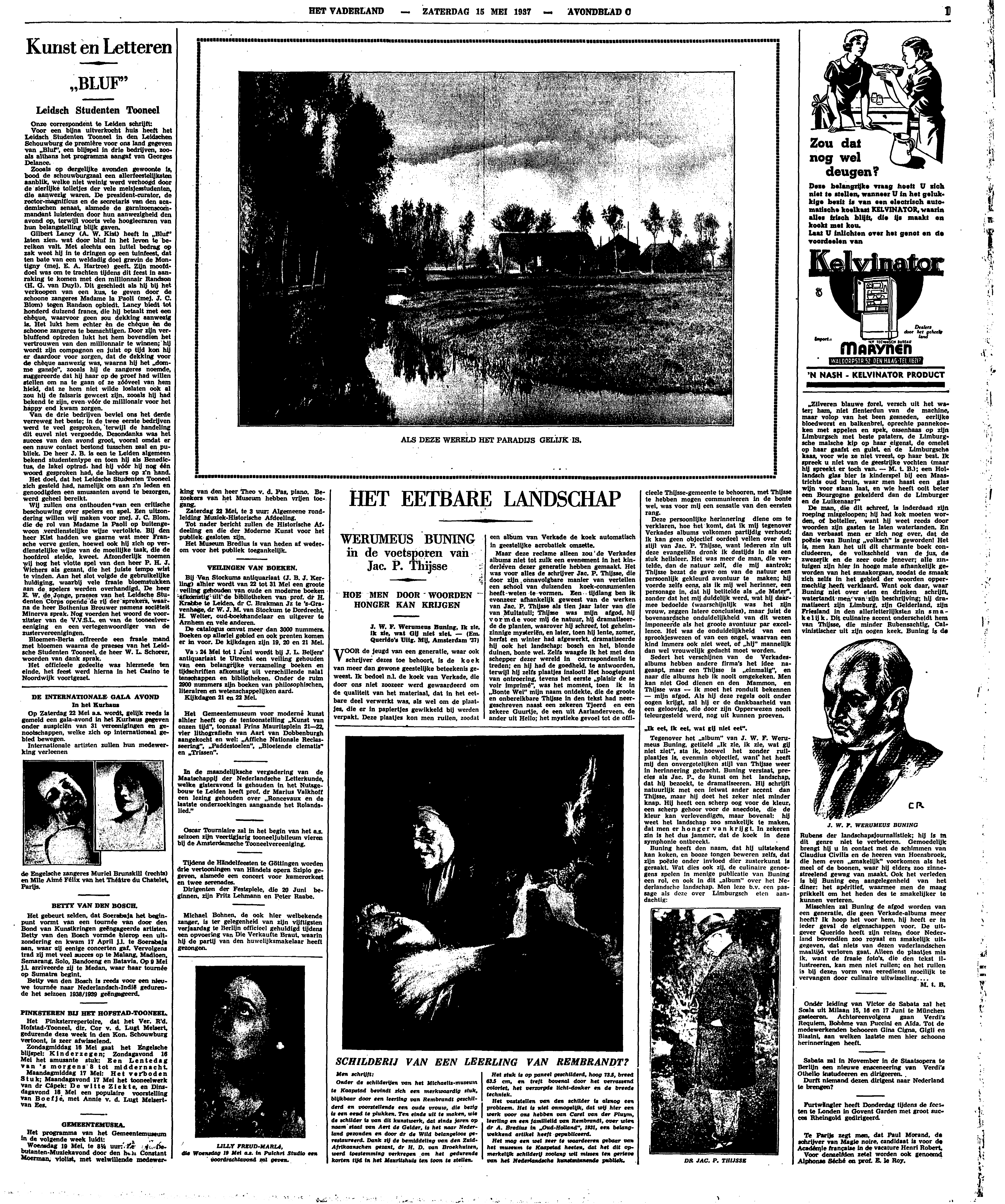 De man, die dit schreef, is inderdaad zijn roeping misgeloopen; hij had kok moeten worden, of bottelier, want hij weet reeds door woorden zijn gasten te laten watertanden. En dan verbaast men er zich nog over, dat de poëzie van Buning ‘volksch’ is geworden! Het is, men kan het uit dit charmante boek concludeeren, de volkschheid van de jus, de zwezerik en de zeer oude jenever; alle zintuigen zijn hier in hooge mate afhankelijk geworden van het smaakorgaan, zoodat de smaak zich zelfs in het gebied der woorden oppermachtig heeft verklaard. Want ook daar, waar Buning niet over eten en drinken schrijft, watertandt men van zijn beschrijving; hij dramatiseert zijn Limburg, zijn Gelderland, zijn Friesland in den allerletterlijksten zin smakelijk. Dit culinaire accent onderscheidt hem van Thijsse, die minder Rubensachtig, Calvinistischer uit zijn oogen keek. Buning is de Rubens der landschapsjournalistiek; hij is in dit genre niet te verbeteren. Gemoedelijk brengt hij u in contact met de schimmen van Claudius Civilis en de heeren van Hoensbroek, die hem even ‘smakelijk’ voorkomen als het meel of de boonen, waar hij elders zoo zinnestreelend gewag van maakt. Ook het verleden is bij Buning een aangelegenheid van het diner: het apéritief, waarmee men de maag prikkelt om het heden des te smakelijker te kunnen verteren.