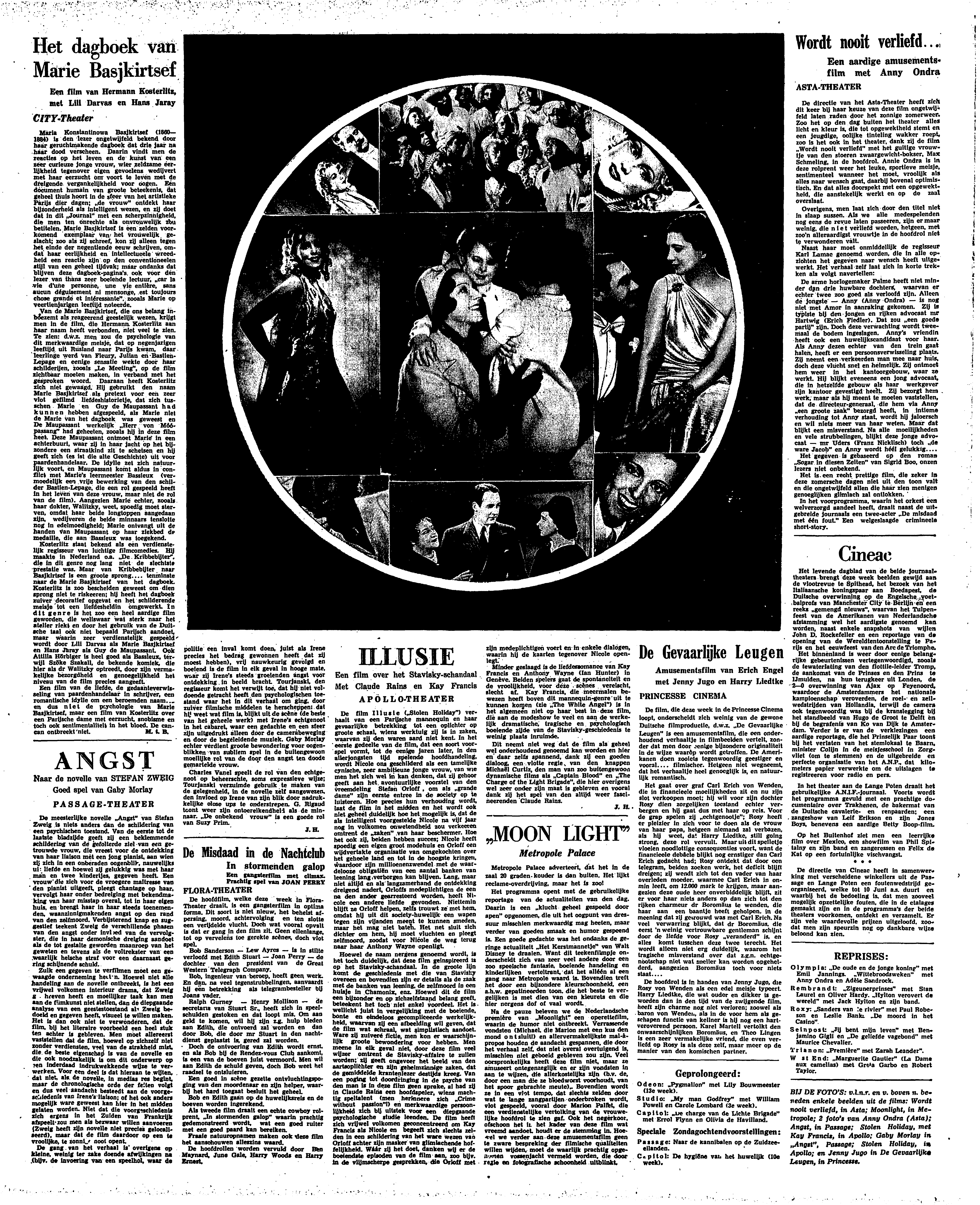 Kosterlitz staat bekend als een verdienstelijk regisseur van luchtige filmcomedies. Hij maakte in Nederland o.a. ‘De Kribbebijter’, die in dit genre nog lang niet de slechtste prestatie was. Maar van Kribbebijter naar Basjkirtsef is een groote sprong.... tenminste naar de Marie Basjkirtsef van het dagboek. Kosterlitz is zoo bescheiden geweest om dien sprong niet te riskeeren; hij heeft het dagboek zuiver decoratief opgevat en het schilderende meisje tot een liefdesheldin omgewerkt. In dit genre is het zoo een heel aardige film geworden, die weliswaar wat sterk naar het atelier riekt en door het gebruik van de Duitsche taal ook niet bepaald Parijsch aandoet, maar waarin zeer verdienstelijk, gespeeld wordt door Lili Darvas als Marie Basjkirtsef en Hans Jaray als Guy de Maupassant. Ook Attilla Hörbiger is heel goed als Bassieux, terwijl Szöke Szakall, de bekende komiek, die hier als dr Walitzky optreedt, door zijn vermakelijke bezorgdheid en genoegelijkheid het niveau van de film precies aangeeft.
