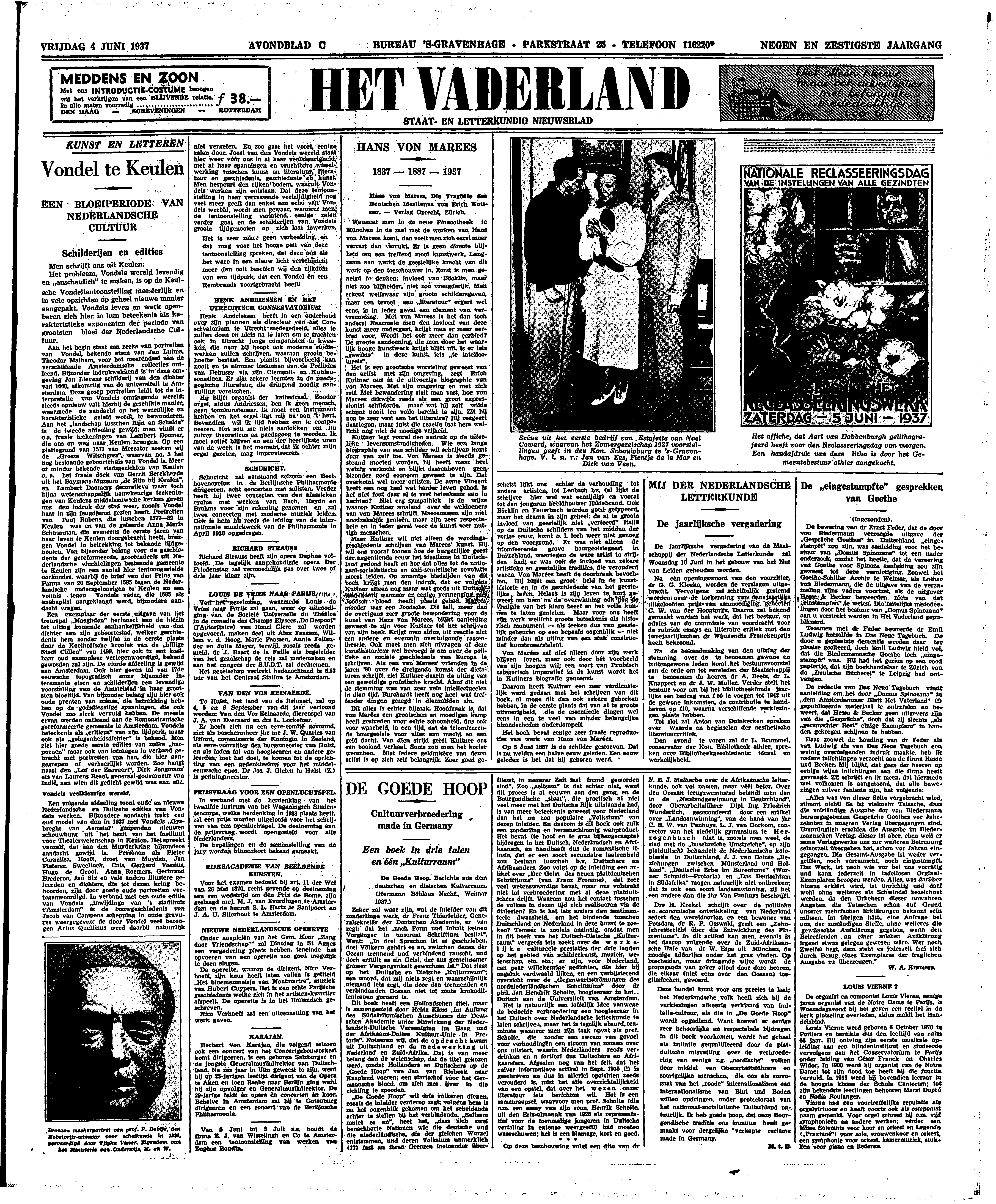 ‘De Goede Hoop’ wil drie volkeren dienen, zooals de inleider verderop zegt; volgens hem is nu het oogenblik gekomen om het scheidende achter te stellen bij het verbindende. ‘Seltsam mutet es an’, heet het, ‘dass zich zwel benachbarte Nationen wie die deutsche und die niederländische, die der gleichen Wurzel entstammen, und deren Volkstum unmerklich (??) fast an ihren Grenzen ineinander übersfliesst, in neuerer Zeit fast fremd geworden sind’. Zoo ‘seltsam’ is dat echter niet, want dit proces is al eeuwen aan den gang, en de Bourgondische ‘staat’, die practisch al niet veel meer met het Duitsche Rijk uitstaande had, is van meer beteekenis geweest voor Nederland dan het nu zoo populaire ‘Volkstum’ van dezen inleider. En daarom is dit boek ook zulk een zonderling en hersenschimmig wanproduct. Het bevat (te hooi en te gras bijeengeraapte) bijdragen in het Duitsch, Nederlandsch en Afrikaansch, en handhaaft dus de romantische illusie, dat er een soort secundaire taaleenheid zou bestaan tusschen b.v. Duitschers en Afrikaanders. Zoo volgt op de inleiding een artikel over ‘Der Geist des neuen plattdeutschen Schrifttums’ (van Franz Fromme), dat zeer veel wetenswaardigs bevat, maar ons volstrekt niet tot verbroedering met al deze platduitschers drijft. Waarom zou het contact tusschen de volken in dezen tijd zich realiseeren via de dialecten? En is het iets anders dan sentimenteele dwaasheid, om het bindende tusschen Duitschland en Nederland in deze buurt te zoeken? Temeer is zooiets onzinnig, omdat men in dit boek van het Duitsch-Dietsche ‘Kulturraum’ vergeefs iets zoekt over de werkelijke cultureele prestaties der drie landen op het gebied van schilderkunst, muziek, wetenschap, etc. etc.; er zijn, voor Nederland, een paar willekeurige gedichten, die hier bij ongeluk verdwaald lijken, en een verbijsterend overzicht over de ‘Gegenwartsströmungen des nordniederländischen Schrifttums’ door dr phil. Jan Hendrik Scholte, hoogleeraar in het.. Duitsch aan de Universiteit van Amsterdam.