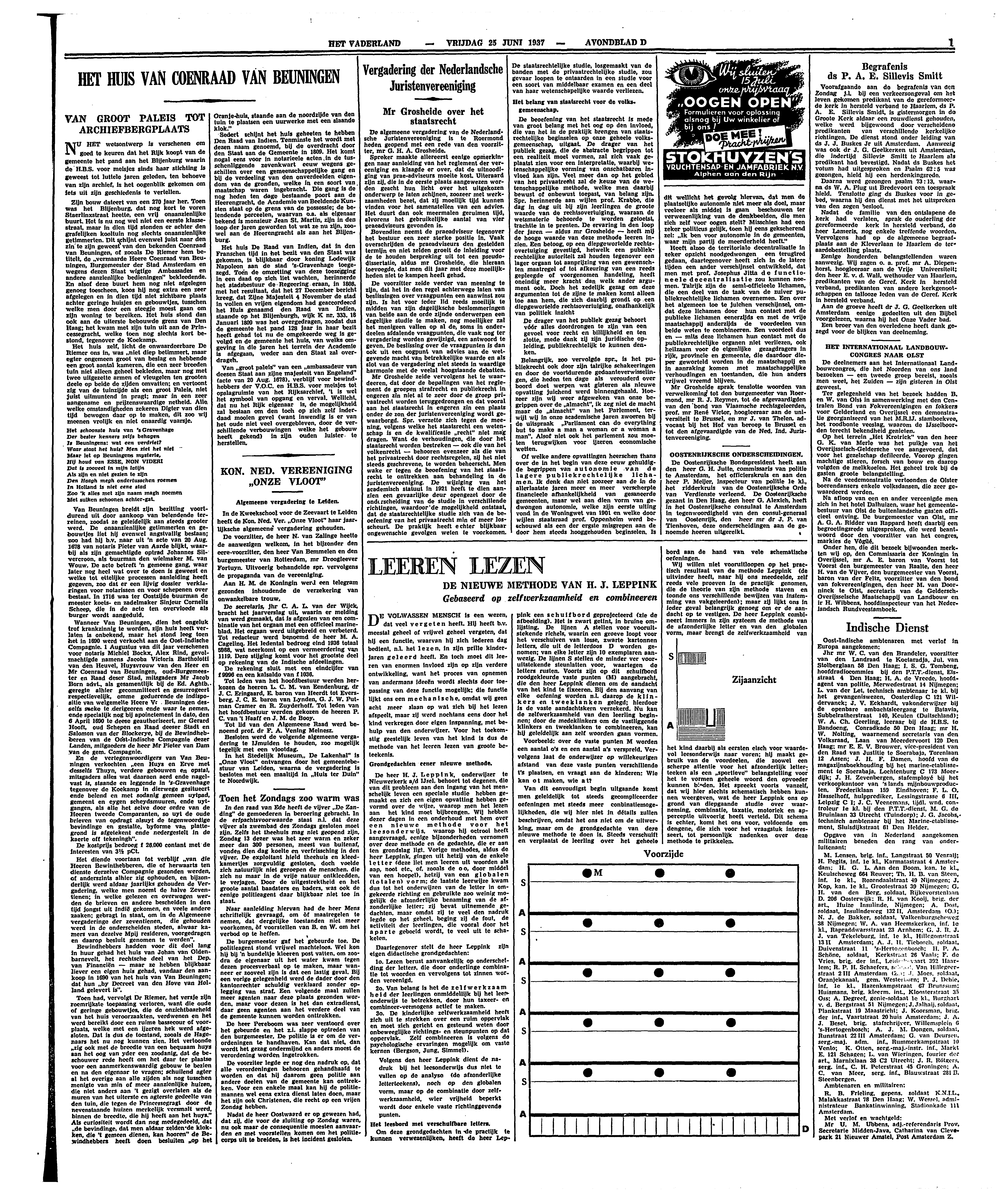 De heer H.J. Leppink, onderwijzer te Nieuwerkerk a/d IJsel, behoort tot degenen, die van dit probleem aan den ingang van het menschelijk leven een speciale studie hebben gemaakt en zich een eigen opvatting hebben gevormd over de wijze, waarop men het lezen aan het kind moet bijbrengen. Wij hebben dezer dagen in een onderhoud met hem over een nieuwe methode voor het leesonderwijs, waarop hij octrooi heeft aangevraagd, eenige bijzonderheden vernomen over deze methode en de gedachte, die er aan ten grondslag ligt. Vorige methodes, aldus de heer Leppink, gingen uit hetzij van de enkele letter (deze liet men leeren uit woorden als aap, noot etc., of, zooals de o o, door middel van een hoepel), hetzij van een globalen (totalen) vorm; de laatste leerwijze kwam dus tot het onderwijzen van de letter in omgekeerde richting en gebruikte zoo weinig mogelijk de afzonderlijke benaming van de afzonderlijke letter; zij bevat uitnemende gedachten, maar omdat zij te veel den nadruk legde op het geheel, beging zij de fout, de activiteit der leerlingen, die vooral door het aparte geboeid wordt, te veel uit te schakelen.