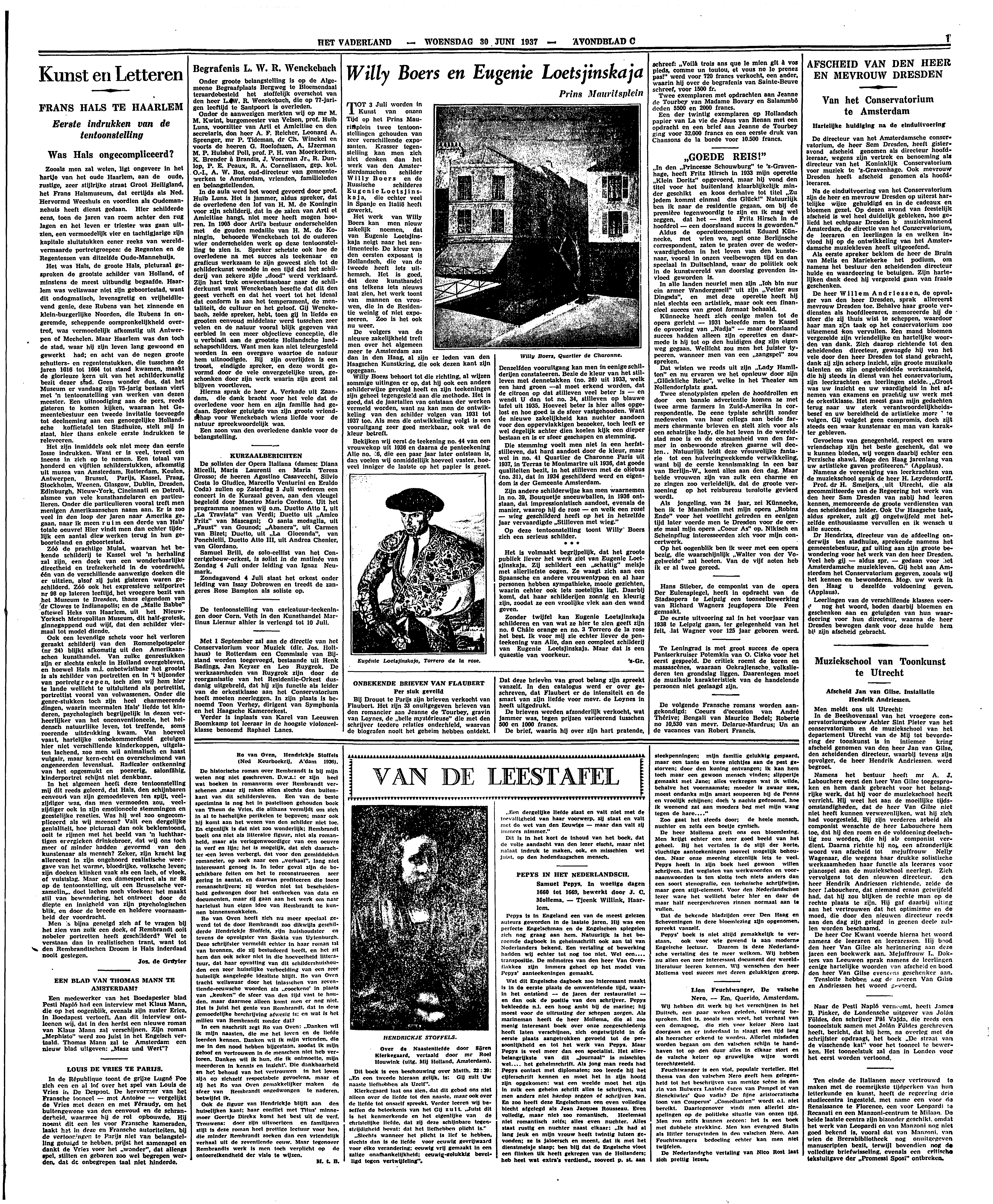 Ook de figuur van Hendrickje blijft aan den huiselijken kant: haar conflict met Titus' minnemoer Geertje Dirckx komt het best uit de verf. Trouwens: door zijn uitvoerigen en familjaren stijl is deze roman heel prettige lectuur voor hen die minder Rembrandt zoeken dan een vriendelijk verhaal uit de zeventiende eeuw. Maar tegenover Rembrandts werk is men toch verplicht op de ontoereikendheid der visie te wijzen.