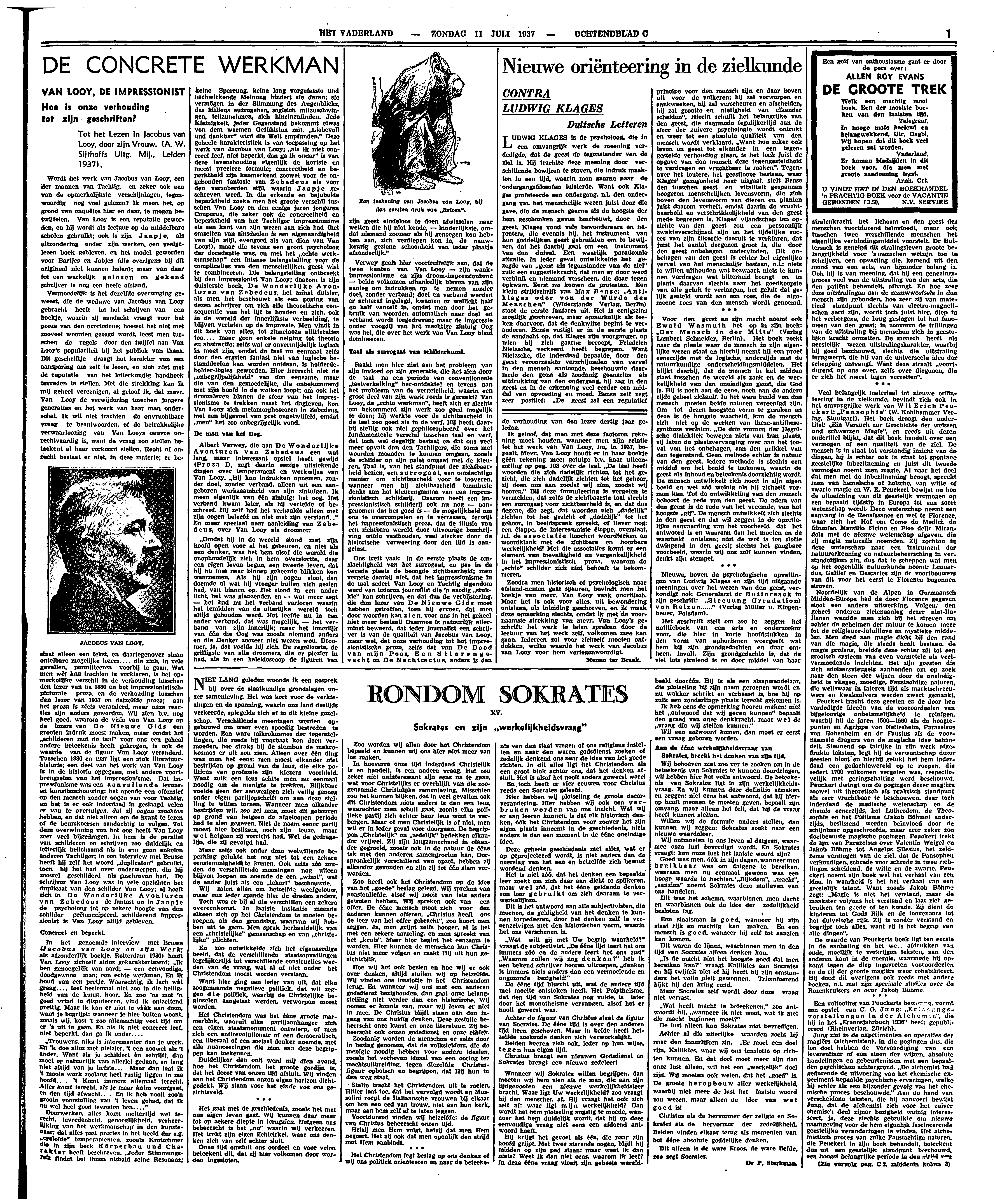 Vermoedelijk is het dezelfde overweging geweest, die de weduwe van Jacobus van Looy gebracht heeft tot het schrijven van een boekje, waarin zij aandacht vraagt voor het proza van den overledene; hoewel het niet met zooveel woorden gezegd wordt, leest men tusschen de regels door den twijfel aan Van Looy's populariteit bij het publiek van thans. Dit geschriftje draagt het karakter van een aansporing om zelf te lezen, en zich niet met de reputatie van het letterkundig handboek tevreden te stellen. Met die strekking kan ik mij geheel vereenigen, al geloof ik, dat mevr. Van Looy de verwijdering tusschen jongere generaties en het werk van haar man onderschat. Ik wil niet trachten de onvruchtbare vraag te beantwoorden, of de betrekkelijke verwaarloozing van Van Looys oeuvre onrechtvaardig is, want de vraag zoo stellen beteekent al haar verkeerd stellen. Recht of onrecht bestaat er niet, in deze materie; er bestaat alleen een tekst, en daartegenover staan ontelbare mogelijke lezers.... die zich, in vele gevallen, permitteeren voorbij te gaan. Wat men wèl kan trachten te verklaren, is het opmerkelijke verschil in de verhouding tusschen den lezer van na 1880 en het impressionistisch-picturale proza, en de verhouding tusschen den lezer van 1937 en datzelfde proza; aan het proza is niets veranderd, maar onze reacties zijn anders geworden. Wij zien b.v. nog heel goed, waarom de visie van Van Looy op de lezers van De Nieuwe Gids een grooten indruk moest maken, maar omdat het ‘schilderen met de taal’ voor ons een geheel andere beteekenis heeft gekregen, is ook de waarde van de figuur Van Looy veranderd. Tusschen 1880 en 1937 ligt een stuk literatuurhistorie; een deel van het werk van Van Looy is in de historie opgegaan, met andere voortbrengselen van het impressionisme. Dat impressionisme was een aanvallende levens- en kunstbeschouwing; het opende een offensief op den mensch zonder oogen van voor Tachtig, en het is er ook inderdaad in geslaagd velen er van te overtuigen, dat zij oogen mochten hebben, en dat niet alleen om de krant te lezen of de beurskoersen aandachtig te volgen. Tot deze overwinning van het oog heeft Van Looy zeer veel bijgedragen. In hem is de parallel van schilderen en schrijven zoo duidelijk en letterlijk belichaamd als in een geen enkelen anderen Tachtiger; in een interview met Brusse heeft hij zelf het woord ‘duplicaten’ gebruikt, toen hij het had over onderwerpen, die hij zoowel geschilderd als geschreven had. De schrijver Van Looy was in vele opzichten het duplicaat van den schilder Van Looy; al heeft zich in De Wonderlijke Avonturen van Zebedeus de fantast en in Jaapje de psycholoog tot op zekere hoogte van den schilder geëmancipeerd, schilderend impressionist is Van Looy altijd gebleven.