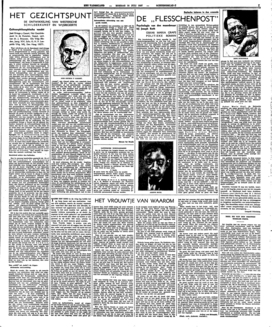 Voor schrijvers als de Spanjaard José Ortega y Gasset is de benaming cultuurphilosoof langzamerhand in zwang gekomen. Dat woord heeft een bepaalde nuance gekregen, die er oorspronkelijk niet in opgesloten schijnt; want iedere philosoof philosopheert over de cultuur, anders zou hij geen philosoof, d.w.z. cultuurmensch zijn. Het speciale begrip ‘cultuurphilosoof’, dat bezig is burgerrecht te krijgen, is echter ontstaan doordat de vak-philosophie niet in staat was haar heerschappij te handhaven als een monopoliepositie; er kwamen vreemde eenden in de bijt, rare snoeshanen met een voor vakphilosophen zeer verdachte belangstelling voor de verschijnselen van het actueele; deze tusschenfiguren, waarvan Spengler wel als een der markantste voorbeelden moet worden genoemd, moesten worden afgescheiden van de vaklieden en werden bijeengebracht onder den verzamelnaam ‘cultuurphilosoof’. Bij de kunstenaars kon men hen immers ook onmogelijk onder dak brengen, omdat zij de sfeer van het betoog en het wetenschappelijk argument niet verlieten; mochten zij ook al neiging toonen om de kunst boven de wetenschap te stellen, omdat zij in de kunst het scheppende, irrationeele en persoonlijke ontdekten tegenover de wetenschap als het constateerende, rationeele en onpersoonlijke, zij bleven zelf toch wat zij in wezen ook waren: philosophen, argumenteerende geesten. Toch verschafte hun deze duidelijke voorkeur voor de kunst, en dientengevolge voor den persoonlijken, artistieken stijl, een zekere populariteit bij een grooter publiek dan dat van de vakphilosophen; zoo naderden zij hier en daar het predikantsberoep, werden beroemd of berucht als goede of slechte raadgevers in cultureele zaken, werden dus dikwijls ook het slachtoffer van hun reputatie en door het publiek vereenzelvigd mèt die reputatie. Spengler werd gedoodverfd als de ondergang van het avondland. Ortega y Gasset als de opstand der horden (massa's); de cultuurphilosoof loopt het risico, dat hij de man wordt van één boek en er nooit meer aan ontsnapt. En toch leert men deze menschensoort der cultuurphilosophen vaak beter kennen, wanneer men hen in minder vermaarde geschriften tracht te volgen: Spengler b.v. in Preussentum und Sozialismus, of Ortega in een kleine studie, die dezer dagen in het Nederlandsch werd vertaald, Het Gezichtspunt in de Kunsten. Ik noem deze studie alleen als voorbeeld, en verwijs den ev. belangstellenden lezer verder naar een artikel, dat ik destijds in deze courant over andere gebundelde opstellen van zijn hand schreef (Bespiegelingen over Leven en Liefde). Hoe minder de reputatie den mensch verdringt, hoe beter.