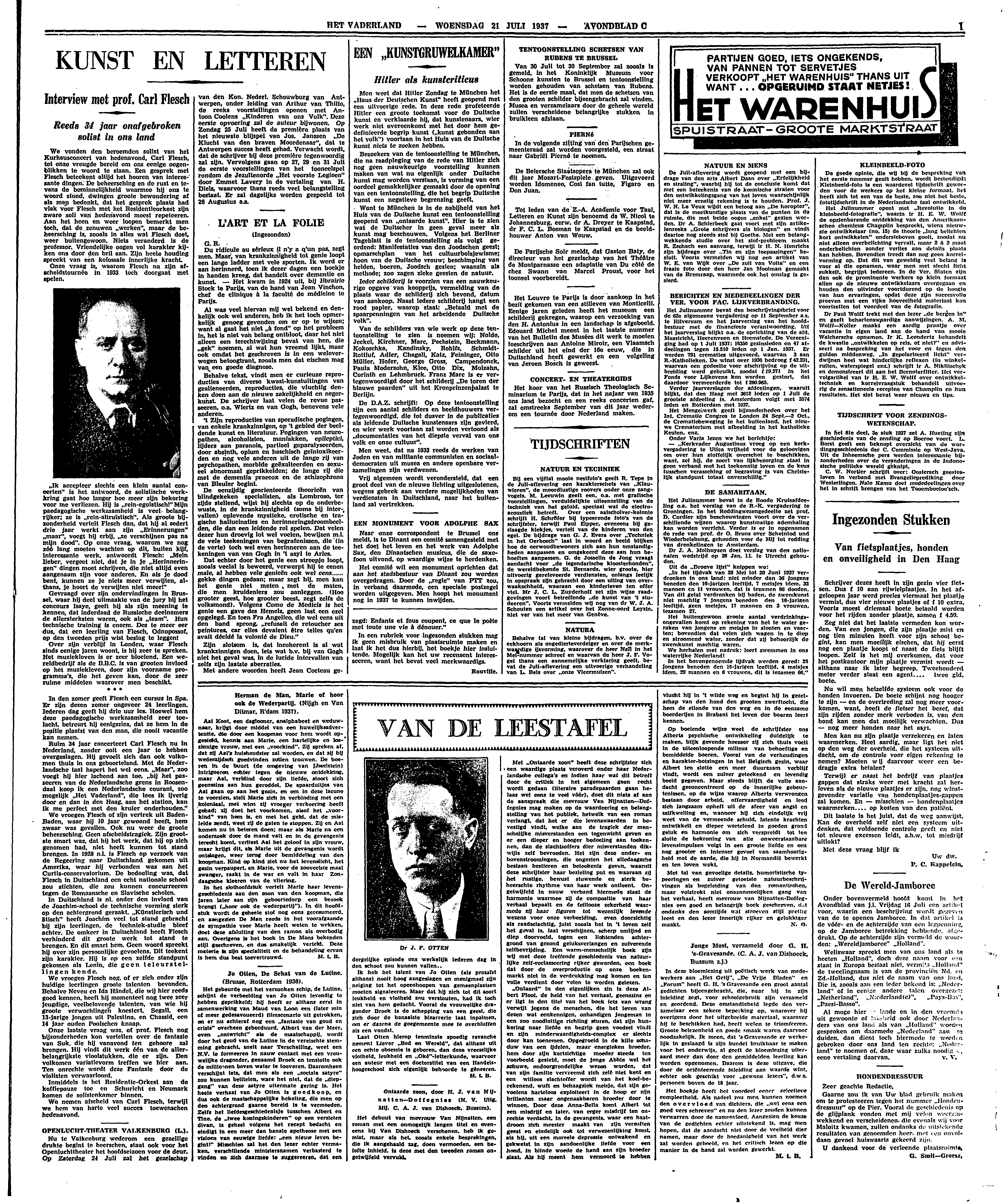 Het gebeurde met het verzonken schip, de Lutine, schijnt de verbeelding van Jo Otten levendig te hebben geprikkeld: hij heeft er althans eerst in samenwerking van Maud van Loon een (later min of meer gedesavoueerd) filmscenario uit getrokken, en er nu achteraf nog een ‘fantasie van goud en crisis’ overheen geborduurd. Albert van der Meer, even ‘ontwricht’ als de maatschappij, wordt door het goud van de Lutine in de vereischte stemming gebracht, snelt naar Terschelling, weet een N.V. te formeeren in nauw contact met een vrouwelijke dragonder, genaamd Broek en tenslotte ook de millioenen boven water te tooveren. Daaromheen verschijnt iets, dat men als een ‘sociale satyre’ zou kunnen betitelen, ware het niet, dat de ‘diepgang’ van deze satyre uitermate gering is. Het heele verhaal van Jo Otten is goedkoop, en dus ook de maatschappelijke hekeling, die men op den achtergrond gaarne bereid is te vermoeden. Zelfs het liefdesgeschiedenisje tusschen Albert en Tine, de ‘twee koningskinderen’ op een versleten divan, is geheel volgens het recept bedacht en eindigt in een meer dan banale apotheose met een visioen van eeuwige liefde: ‘een nieuw leven begint!’ Misschien zal het den lezer echter vermaken, verschillende ministersnamen verbasterd te vinden en zich daarmee te suggereeren, dat een dergelijke episode ons werkelijk iederen dag in den schoot zou kunnen vallen..