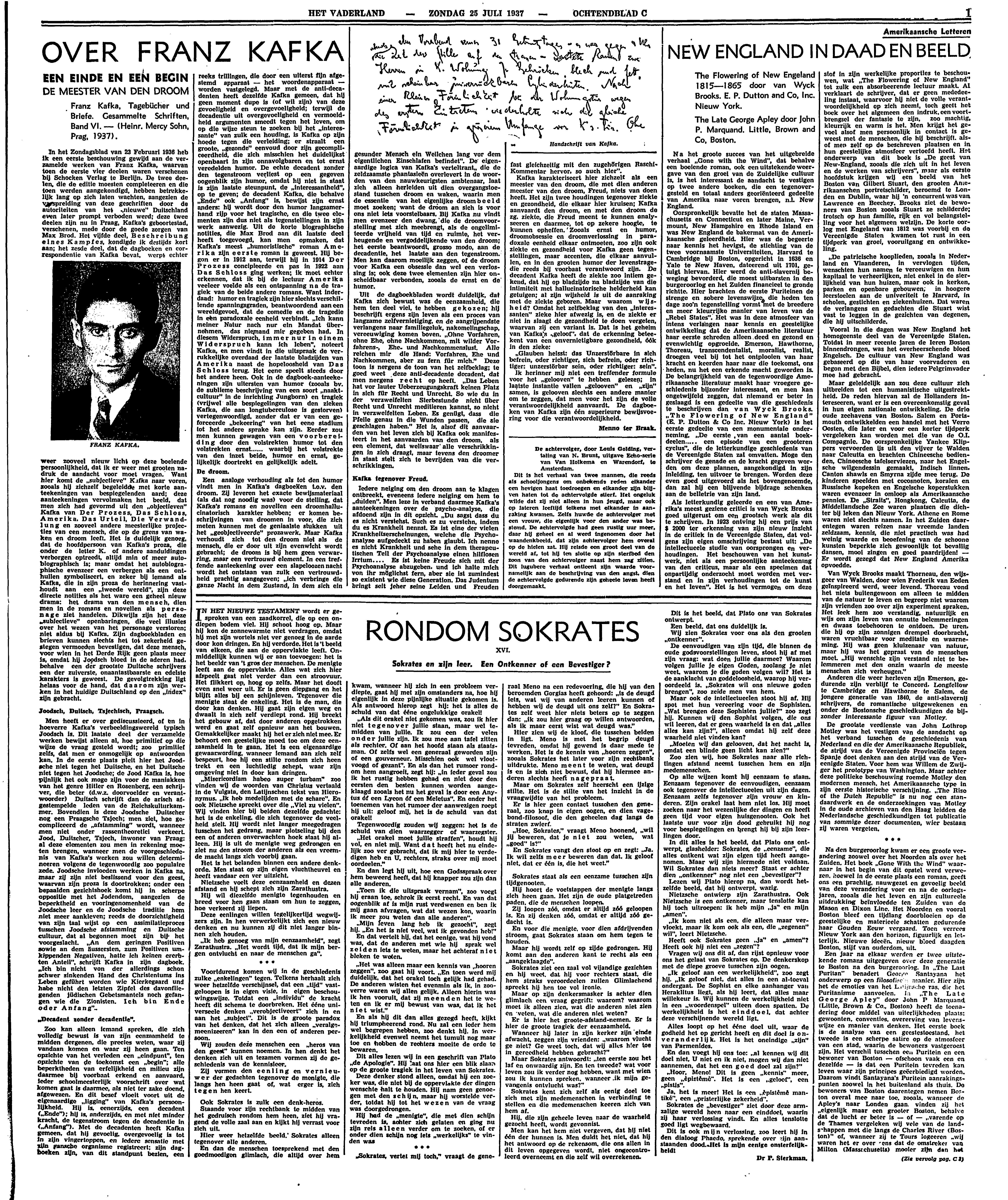 In het Zondagsblad van 23 Februari 1936 heb ik een eerste beschouwing gewijd aan de verzamelde werken van Franz Kafka, waarvan toen de eerste vier deelen waren verschenen bij Schocken Verlag te Berlijn. De twee deelen, die de editie moesten completeeren en die toen werden aangekondigd, hebben betrekkelijk lang op zich laten wachten, aangezien de verspreiding van deze geschriften door de autoriteiten van het ‘nieuwe’ Duitschland even later prompt verboden werd; deze twee deelen zijn nu in Praag, Kafka's geboortestad, verschenen, mede door de goede zorgen van Max Brod. Het vijfde deel, Beschreibung eines Kampfes, kondigde ik destijds kort aan; het zesde deel, dat de dagboeken en correspondentie van Kafka bevat, werpt echter weer zooveel nieuw licht op deze boeiende persoonlijkheid, dat ik er weer met grooten nadruk de aandacht voor moet vragen. Want hier komt de ‘subjectieve’ Kafka naar voren, zooals hij zichzelf begeleidde met korte aanteekeningen van bespiegelenden aard; deze aanteekeningen vervolmaken het beeld, dat men zich had gevormd uit den ‘objectieven’ Kafka van Der Prozess, Das Schloss, Amerika, Das Urteil, Die Verwandlung en zooveel andere meesterlijke projecties van een mensch, die op de grens van waken en droom leeft. Het is duidelijk genoeg, dat de hoofdpersoon van Kafka's proza, die onder de letter K. of andere aanduidingen verborgen optreedt, altijd min of meer autobiographisch is; maar omdat het autobiographische evenzeer een verbergen als een onthullen symboliseert, en zeker bij iemand als Kafka, die in zijn proza de herinnering vasthoudt aan een ‘tweede wereld’, zijn deze directe notities als het ware een geheel nieuw drama: het drama van den mensch, dien men in de romans en novellen als personage ziet handelen. Dikwijls zijn het deze ‘subjectieve’ openbaringen, die veel illusies over het wezen van het personage verstoren; niet aldus bij Kafka. Zijn dagboekbladen en brieven kunnen slechts het tot zekerheid gestegen vermoeden bevestigen, dat deze mensch, voor wien in het Derde Rijk geen plaats meer is, omdat hij Joodsch bloed in de aderen had, behalve een der grootste Duitsche schrijvers een der zuiverste, onaantastbaarste en edelste karakters is geweest. De gevolgtrekking ligt helaas voor de hand, dat daarom zijn werken in het huidige Duitschland op den ‘index’ zijn gebracht.