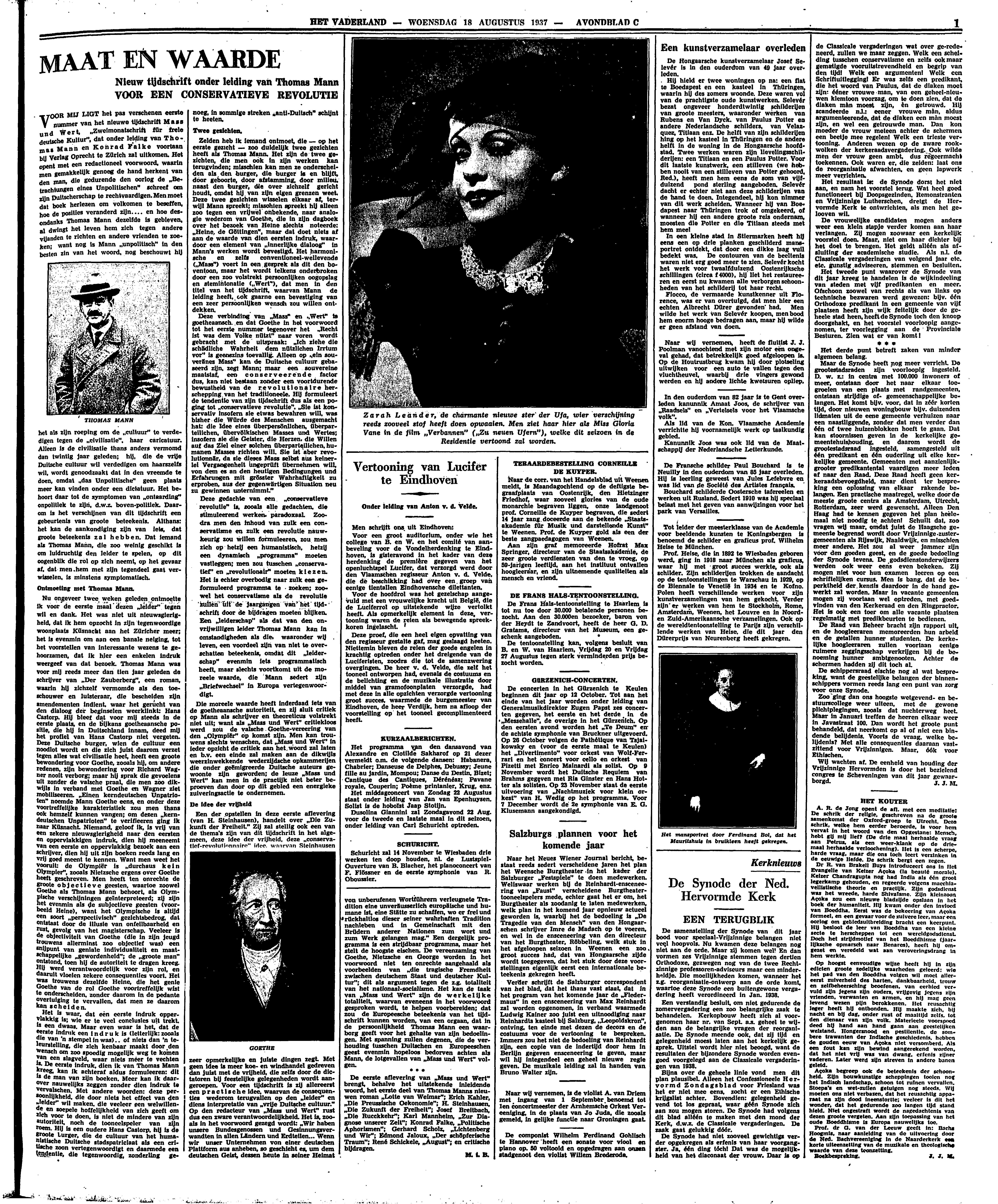 Zelden heb ik iemand ontmoet, die - op het eerste gezicht - zoo duidelijk twee gezichten heeft als Thomas Mann. Het zijn de twee gezichten, die men ook in zijn werken kan terugvinden; misschien kan men ze onderscheiden als den burger, die burger is en blijft, door geboorte, door afstamming, door milieu, naast den burger, die over zichzelf gericht houdt, omdat hij van zijn eigen grenzen weet. Deze twee gezichten wisselen elkaar af, terwijl Mann spreekt; misschien spreekt hij alleen zoo tegen een vrijwel onbekende, naar analogie wederom van Goethe, die in zijn dagboek over het bezoek van Heine slechts noteerde: ‘Heine, de Göttingen’, maar dat doet niets af aan de waarde van dien eersten indruk, waardoor een element van ‘innerlijke dialoog’ in Mann's werken wordt bevestigd. Het harmonische en zelfs conventioneel-wellevende (‘Mass’) voert in een gesprek als dit den boventoon, maar het wordt telkens onderbroken door een zoo volstrekt persoonlijken oogopslag en stemintonatie (‘Wert’), dat men in den titel van het tijdschrift, waarvan Mann de leiding heeft, ook gaarne een bevestiging van een zeer persoonlijken wensch zou willen ontdekken.