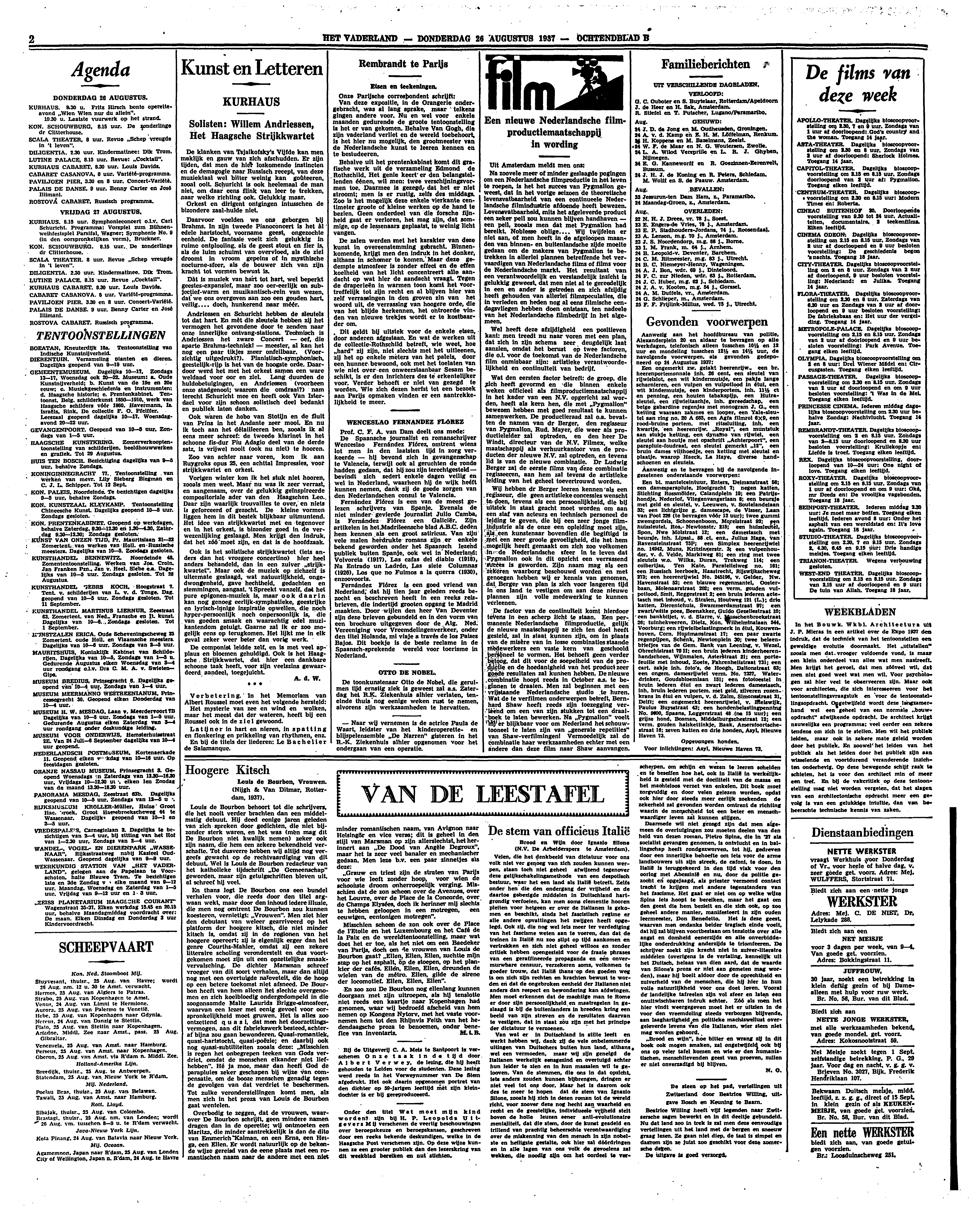 En thans legt De Bourbon ons een bundel verhalen voor, die reeds door den titel argwaan wekt, maar door den inhoud iedere illusie, die men nog omtrent De Bourbon zou kunnen koesteren, vernietigt: ‘Vrouwen’. Men ziet hier den debutant van weleer gearriveerd op het platform der hoogere kitsch, die niet minder kitsch is, omdat zij in de regionen van het hoogere opereert; zij is eigenlijk erger dan het genre Courths-Mahler, omdat zij een zekere litteraire scholing veronderstelt en dus voortgekomen moet zijn uit een opzettelijke smaakvervalsching. De dichter Marsman schreef vroeger van dit soort verhalen, maar dan altijd nog met een overtuigde naïeveteit, die de hoop op een betere toekomst niet afsneed. De Bourbon heeft van hem alleen het slechte overgenomen en zich koelbloedig ondergedompeld in die zoogenaamde Malte Laurids Brigge-atmosfeer, waarvan een lezer met eenig gevoel voor oorspronkelijkheid moet gruwen. Het is alles zoo ontzettend quasi, dat men het doorzettingsvermogen, aan dit fabriekswerk besteed, achteraf bijna zou gaan bewonderen. Quasi-romantiek, quasi-hartstocht, quasi-poëzie; en daarbij ook nog quasi-subtiliteiten zooals deze: ‘Misschien is regen het onbegrepen teeken van Gods verdriet, omdat de menschen elkander niet liefhebben’. Hé ja moe, maar dan heeft God de parapluies zeker geschapen bij wijze van compensatie, om de booze menschen genadig tegen de gevolgen van dat verdriet te beschermen. Tot zulke veronderstellingen komt men, als men zich in het proza van Louis de Bourbon gaat wentelen.