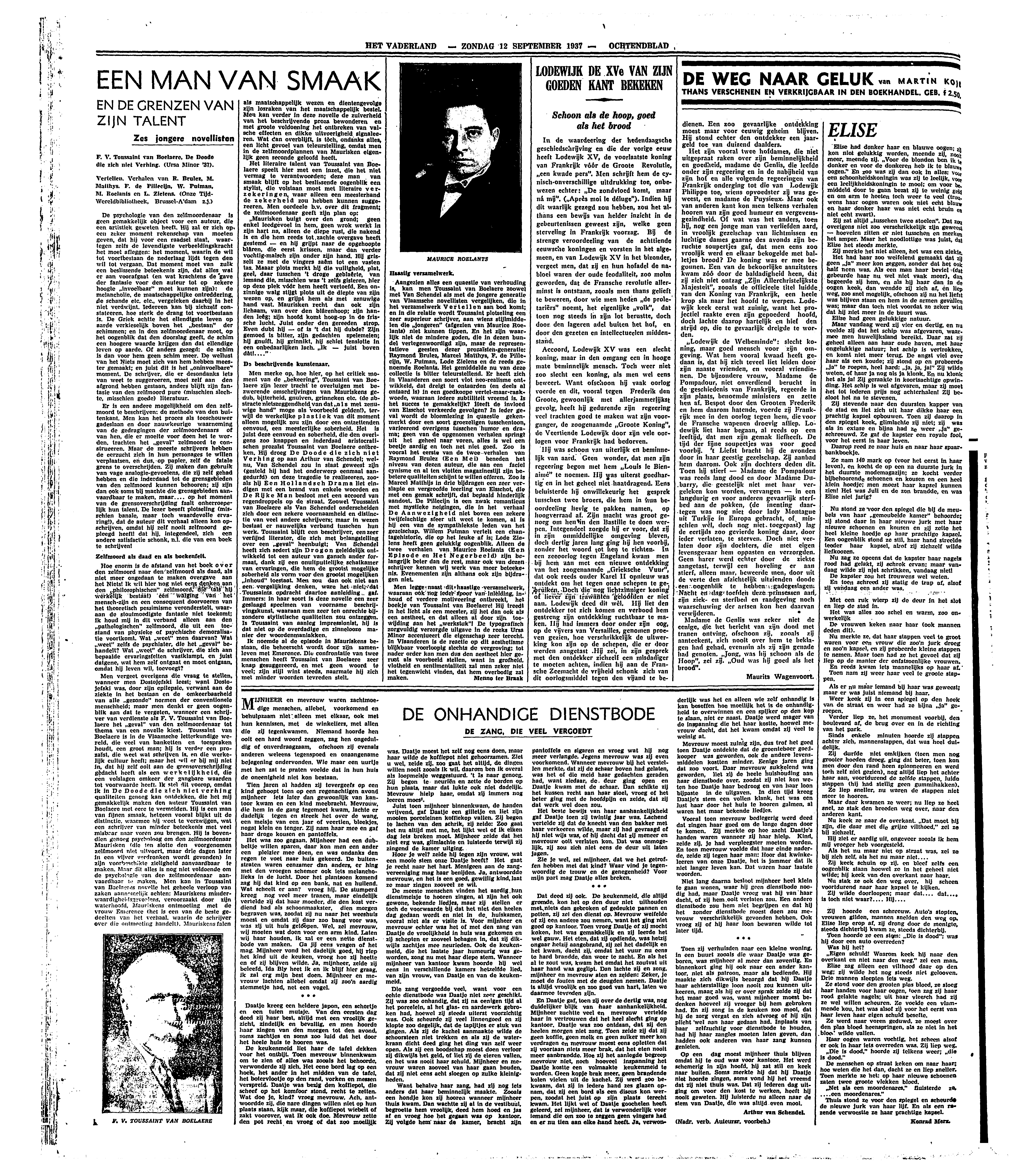 Het literaire talent van Toussaint van Boelaere speelt hier met een inzet, die het niet vermag te verantwoorden; deze man van smaak blijft op het beslissende oogenblik een stylist, die volstaan moet met literaire verzekeringen, waar alleen een meesterhand de zekerheid zou hebben kunnen suggereeren. Men oordeele b.v. over dit fragment; de zelfmoordenaar geeft zijn plan op:
