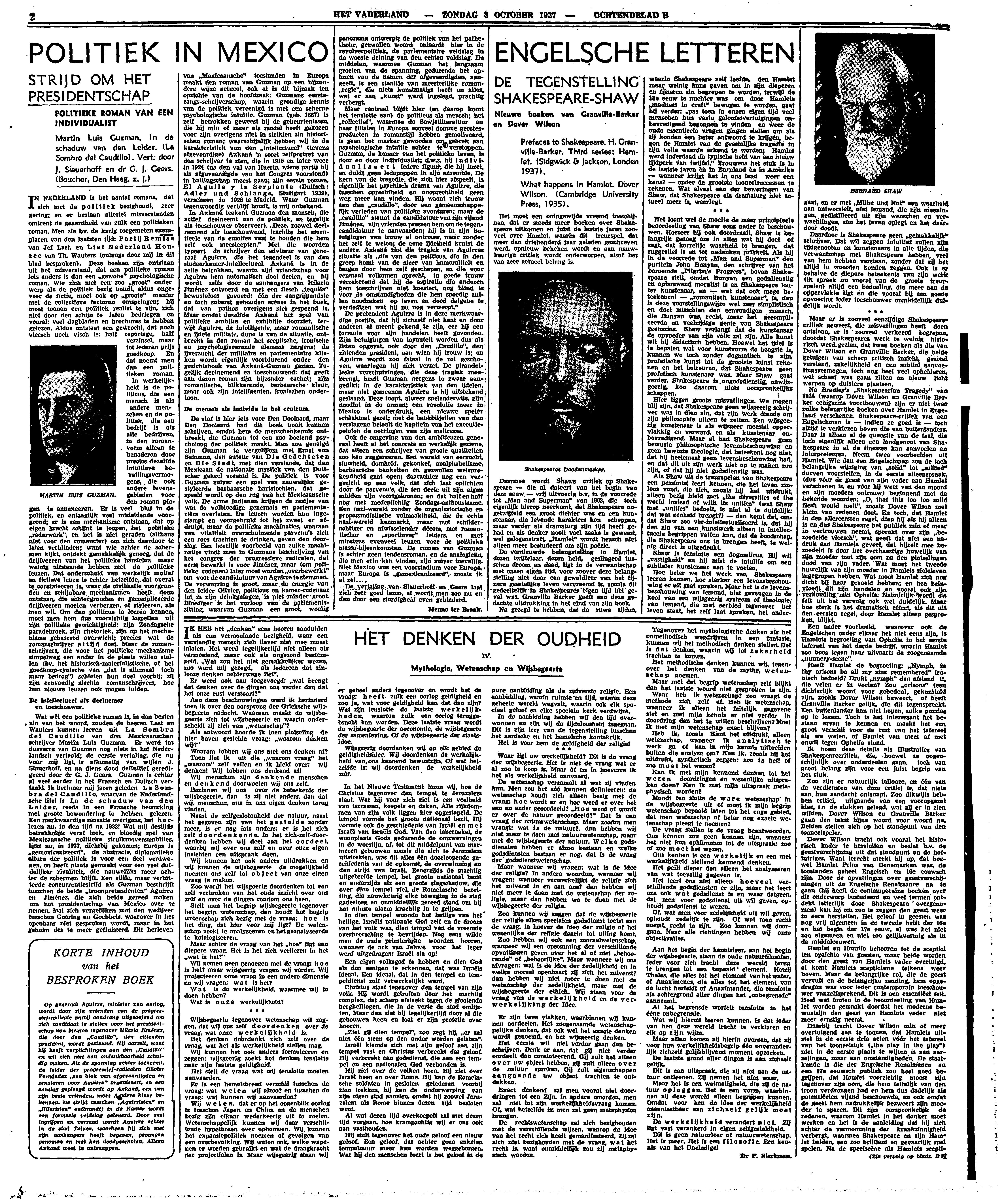 Wat wèl een politieke roman is, in den besten zin van het woord, zouden de heeren Last en Wauters kunnen leeren uit La Sombra del Caudillo van den Mexicaanschen schrijver Martin Luis Guzman. Er werd tot dusverre van Guzman nog niets in het Nederlandsch vertaald; de eerste vertaling, die nu voor mij ligt, is afkomstig van wijlen J. Slauerhoff, en na diens dood definitief geredigeerd door dr G.J. Geers. Guzman is echter al veel eerder in het Fransch en Duitsch vertaald. Ik herinner mij jaren geleden La Sombra del Caudillo, waarvan de Nederlandsche titel is In de schaduw van den Leider, reeds in een Fransche bewerking met groote bewondering te hebben gelezen. Een merkwaardige sensatie overigens, het herlezen nu, in den tijd na 1933! Wat mij destijds betrekkelijk veraf leek, en bloedig spel van Mexicaansche politieke struikrooversambities, lijkt nu, in 1937, dichtbij gekomen; Europa is ‘gemexicaniseerd’, de abstracte, diplomatieke allure der politiek is voor een deel verdwenen, en heeft plaats gemaakt voor een veel duidelijker rivaliteit, die nauwelijks meer achter de schermen blijft. Een stille, maar verbitterde concurrentiestrijd als Guzman beschrijft tusschen de beide ‘troonpretendenten’ Aguirre en Jiménez, die zich beide gereed maken om het presidentschap van Mexico over te nemen, laat zich vergelijken met den wedijver tusschen Goering en Goebbels, waarover in het openbaar niet gesproken wordt, maar in het geheim des te meer gefluisterd. Dit herleven van ‘Mexicaansche’ toestanden in Europa maakt den roman van Guzman op een bijzondere wijze actueel, ook al is dit bijzaak ten opzichte van de hoofdzaak: Guzmans eersterangs-schrijverschap, waarin grondige kennis van de politiek vereenigd is met een scherpe psychologische intuïtie. Guzman (geb. 1887) is zelf betrokken geweest bij de gebeurtenissen, die hij min of meer als model heeft gekozen voor zijn overigens niet in strikten zin historischen roman; waarschijnlijk hebben wij in de karakteristiek van den ‘intellectueel’ (tevens afgevaardige) Axkaná 'n soort zelfportret van den schrijver te zien, die in 1915 en later weer in 1924 (na den val van Huerta, wiens partij hij als afgevaardigde van het Congres voorstond) in ballingschap moest gaan; zijn eerste roman, El Aguila y la Serpiente (Duitsch: Adler und Schlange, Stuttgart 1932), verscheen in 1928 te Madrid. Waar Guzman tegenwoordig verblijf houdt, is mij onbekend.