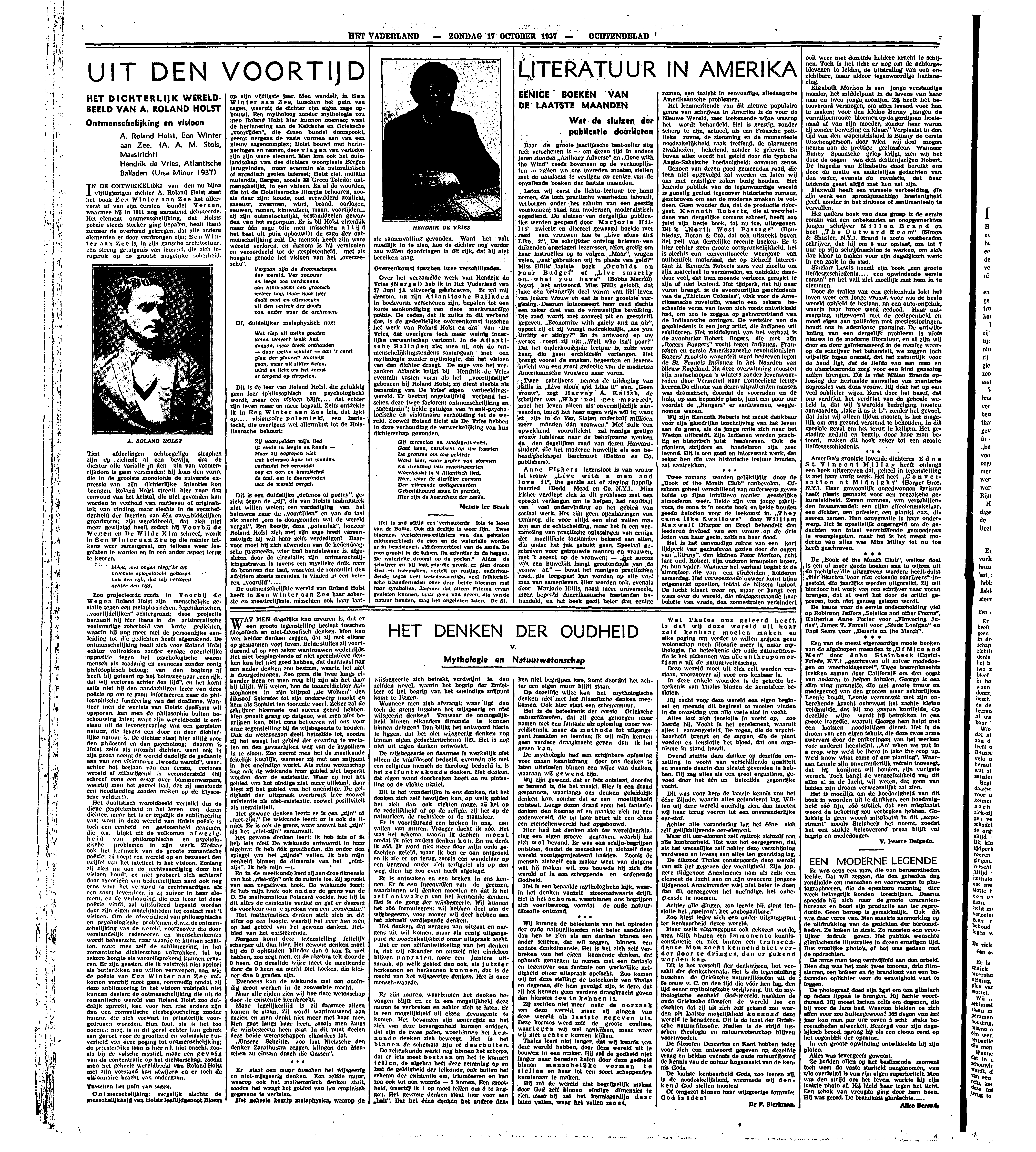 Over het verzamelde werk van Hendrik de Vries (Nergal) heb ik in Het Vaderland van 27 Juni j.l. uitvoerig geschreven. Ik zal mij daarom, nu zijn Atlantische Balladen in boekvorm verschenen zijn, bepalen tot een korte aankondiging van deze merkwaardige poëzie. De reden, dat ik zulks in dit verband doe, is de gedeeltelijke overeenkomst tusschen het werk van Roland Holst en dat van De Vries, dat overigens toch maar weinig innerlijke verwantschap vertoont. In de Atlantische Balladen ziet men nl. ook de ontmenschelijkingstendens samengaan met een mythologie zonder mythologie, die het visioen van den dichter draagt. De sage van het verzonken Atlantis krijgt bij Hendrik de Vries evenmin vasten vorm als het ‘voortijdelijk’ gebeuren bij Roland Holst; zij dient slechts als benaming van De Vries' eigen verbeeldingswereld. Er bestaat ongetwijfeld verband tusschen deze twee factoren: ontmenschelijking en ‘sagenpuin’; beide getuigen van 'n anti-psychologische en visionnaire verhouding tot de wereld. Zoowel Roland Holst als De Vries hebben in deze verhouding de verwerkelijking van hun dichterschap gevonden.