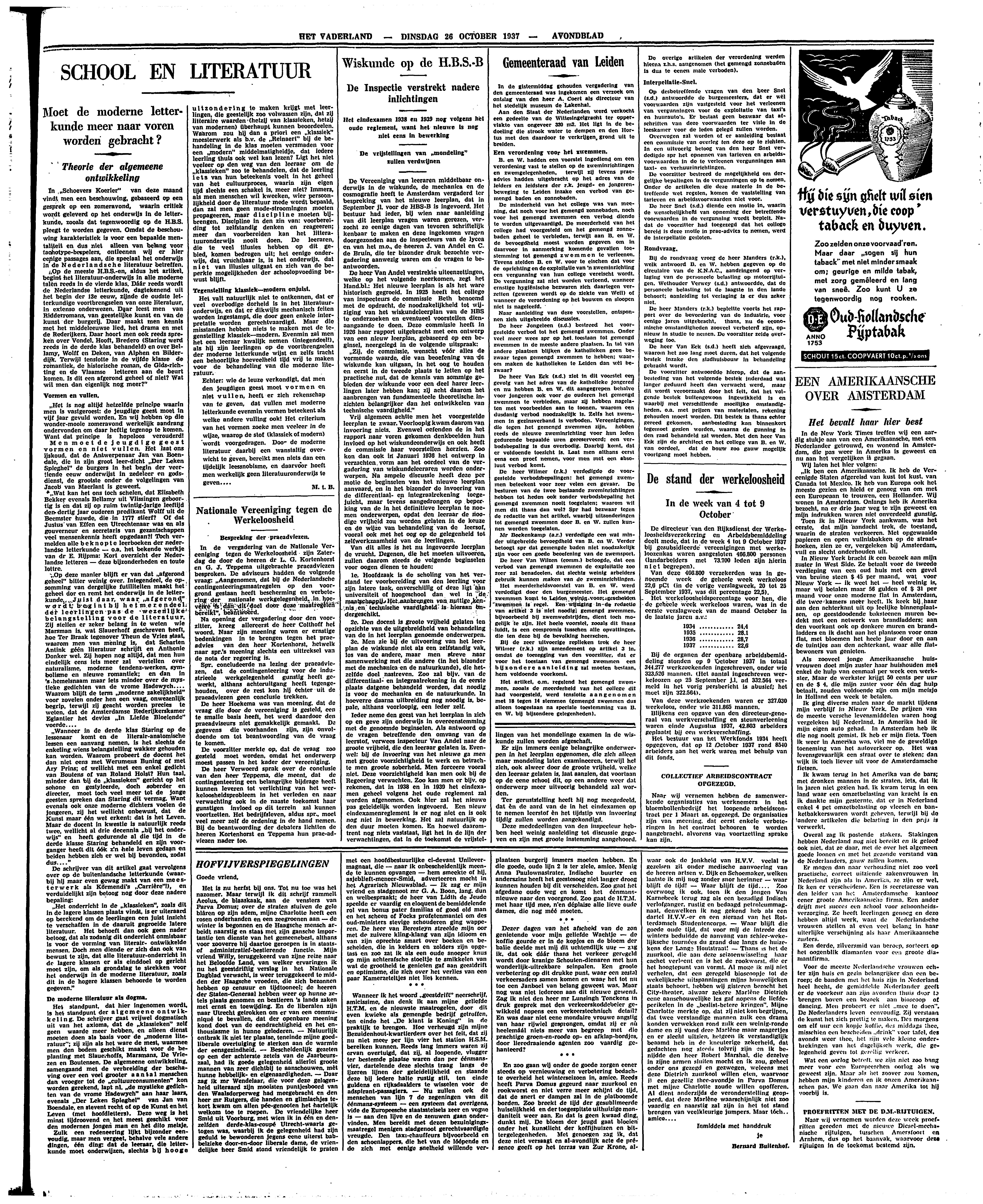 ‘Op de meeste H.B.S.-en, aldus het artikel, begint het literatuur-onderwijs in alle moderne talen reeds in de vierde klas. Dáár reeds wordt de Nederlandse letterkunde, dagtekenend uit het begin der 13e eeuw, zijnde de oudste letterkundige voortbrengselen van onze literatuur, in extenso onderwezen. Daar leest men van Ridderromans, van geestelijke kunst en van de kunst der burgerij. Daar maakt men kennis met het middeleeuwse lied, het drama en met de Rederijkers. Daar hoort men ook reeds spreken over Vondel. Hooft, Bredero (Staring werd reeds in de derde klas behandeld) en over Bellamy, Wolff en Deken, van Alphen en Bilderdijk. Terwijl tenslotte in de vijfde klasse de romantiek, de historische roman, de Gids-richting en de Vlaamse letteren aan de beurt komen. Is dit een afgerond geheel of niet? Wat wil men dan eigenlijk nog meer?’