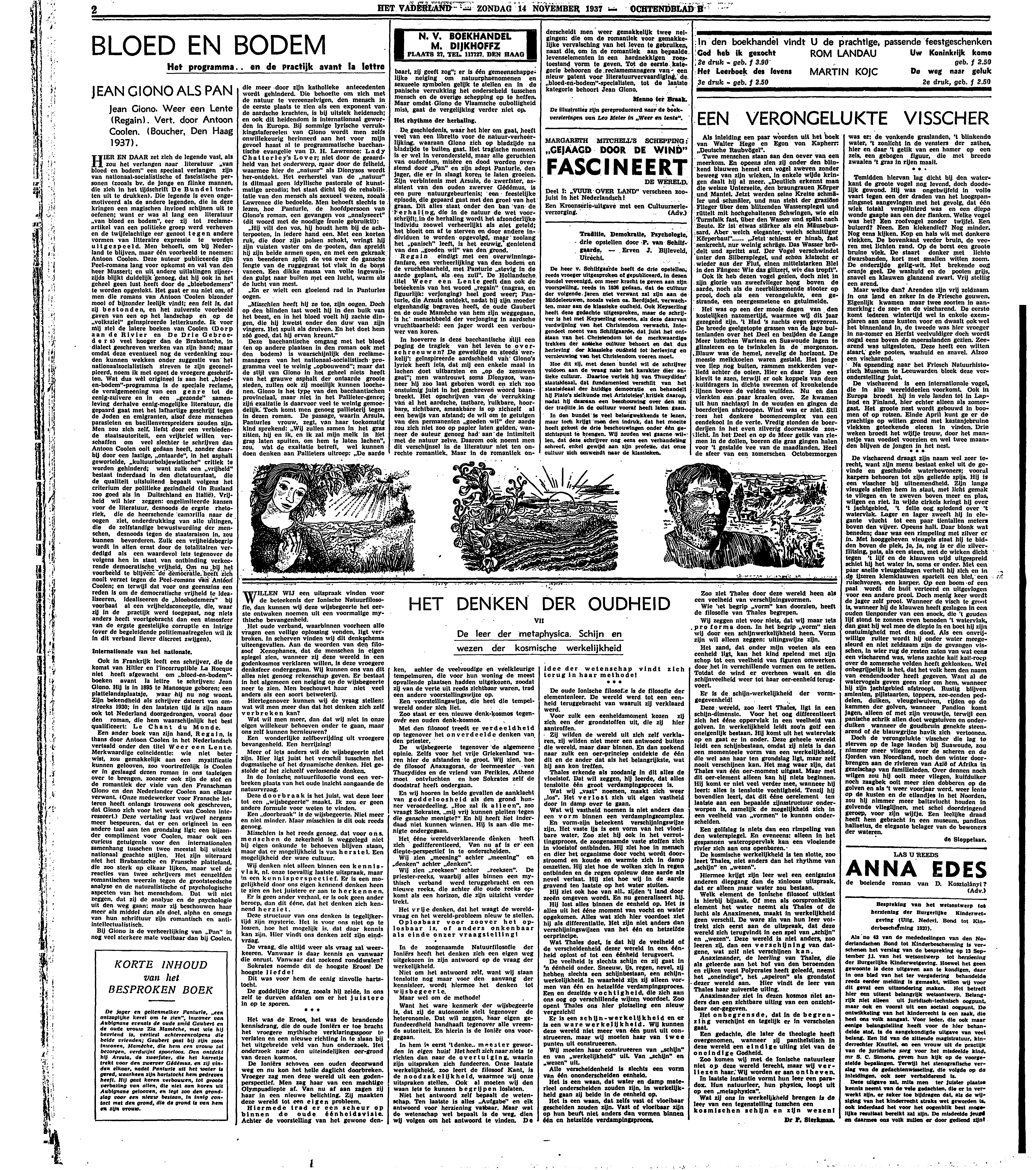 Ook in Frankrijk leeft een schrijver, die de komst van Hitler en l'incorruptible La Rocque niet heeft afgewacht om ‘bloed-en-bodem’-boeken avant la lettre te schrijven: Jean Giono. Hij is in 1895 te Manosque geboren; een plattelandsplaatsje, waar hij nu nog woont. Zijn bekendheid als schrijver dateert van omstreeks 1930; in den laatsten tijd is zijn naam ook tot Nederland doorgedrongen, vooral door den roman, die hem waarschijnlijk het best qualificeert: Le Chant du Monde.