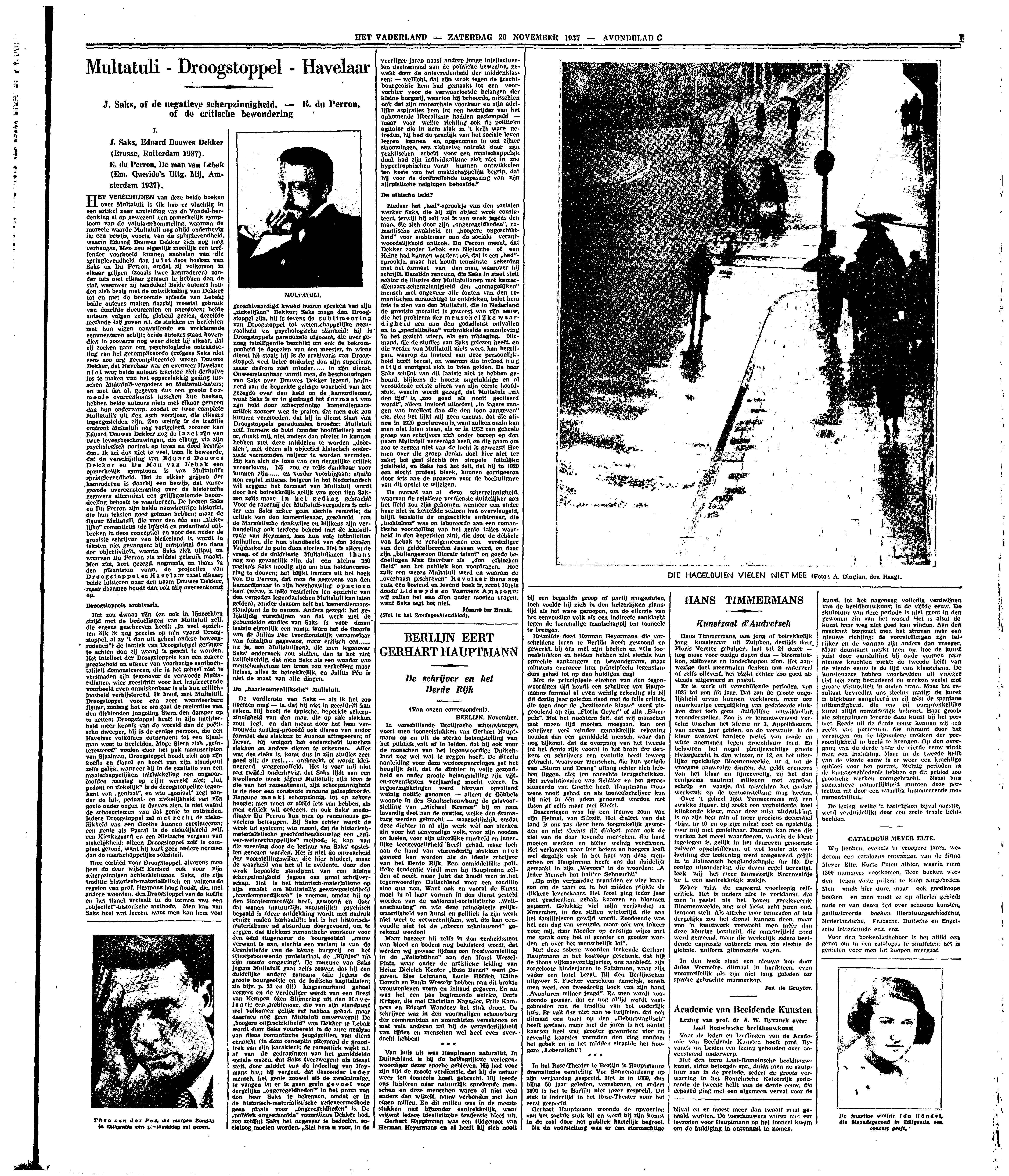 Dus: eerbied voor Droogstoppel, alvorens men hem de deur wijst! Eerbied ook voor zijn scherpzinnigen achterkleinzoon Saks, die zijn traditie historisch-materialistisch en volgens de regelen van prof. Heymans hoog houdt, die, met andere woorden, den Droogstoppel van de koffie en het flanel vertaalt in de termen van een ‘objectief’-historische methode. Men kan van Saks heel wat leeren, want men kan hem veel gerechtvaardigd kwaad hooren spreken van zijn ‘ziekelijken’ Dekker; Saks moge dan Droogstoppel zijn, hij is tevens de sublimeering van Droogstoppel tot wetenschappelijke accuraatheid en psychologische slimheid; hij is Droogstoppels paradoxale afgezant, die over genoeg intelligentie beschikt om ook de bekrompenheid te doorzien van den meester, in wiens dienst hij staat; hij is de archivaris van Droogstoppel, veel beter onderleg dan zijn superieur, maar daarom niet minder..... in zijn dienst. Onweerstaanbaar wordt men, de beschouwingen van Saks over Douwes Dekker lezend, herinnerd aan de beperkte geldige waarheid van het gezegde over den held en de kamerdienaar, want Saks is er in geslaagd het formaat van zijn held door scherpzinnige kamerdienaarscritiek zoozeer weg te praten, dat men ook zou kunnen vermoeden, dat hij in dienst staat van Droogstoppels paradoxalen broeder: Multatuli zelf. Immers de held (zonder hoofdletter) moet er, dunkt mij, niet anders dan plezier in kunnen hebben met deze middelen te worden ‘doorzien’, met dezen als objectief historisch onderzoek vermomden naijver te worden verraden. Hij kan zich de luxe van een dergelijke critiek veroorloven, hij zou er zelfs dankbaar voor kunnen zijn...... en verder voorbijgaan; aquila non captat muscas, hetgeen in het Nederlandsch wil zeggen: het formaat van Multatuli wordt door het betrekkelijk gelijk van geen tien Saksen zelfs maar in het geding gebracht! Voor de razernij der Multatuli-vergoders is echter een Saks zeker geen slechte remedie; de critiek van den kamerdienaar, geschoold aan de Marxistische denkwijze en blijkens zijn verhandeling ook terdege bekend met de klassificatie van Heymans, kan hun vele intimiteiten onthullen, die hun standbeeld van den Idealen Vrijdenker in puin doen storten. Het is alleen de vraag, of de doldrieste Multatulianen thans nog zoo gevaarlijk zijn, dat een kleine 350 pagina's Saks noodig zijn om hun heldenvereering te dooven; het blijkt immers uit het boek van Du Perron, dat men de gegevens van den kamerdienaar in zijn beschouwing opnemen kan (w.w.z. alle restricties ten opzichte van den vergoden legendarischen Multatuli kan laten gelden), zonder daarom zelf het kamerdienaarsstandpunt in te nemen. Anders gezegd: het gelijktijdig verschijnen van dat werk met de gebundelde studies van Saks is voor dezen laatste eigenlijk een ramp. Ware het de theorie van dr Julius Pée (verdienstelijk verzamelaar van feitelijke gegevens, maar critisch een...... nu ja, een Multatuliaan), die men tegenover Saks onderzoek zou stellen, dan is het niet twijfelachtig, dat men Saks als een wonder van menschenkennis ten troon zou verheffen; maar helaas, alles is betrekkelijk, en Julius Pée is niet de maat van alle dingen.