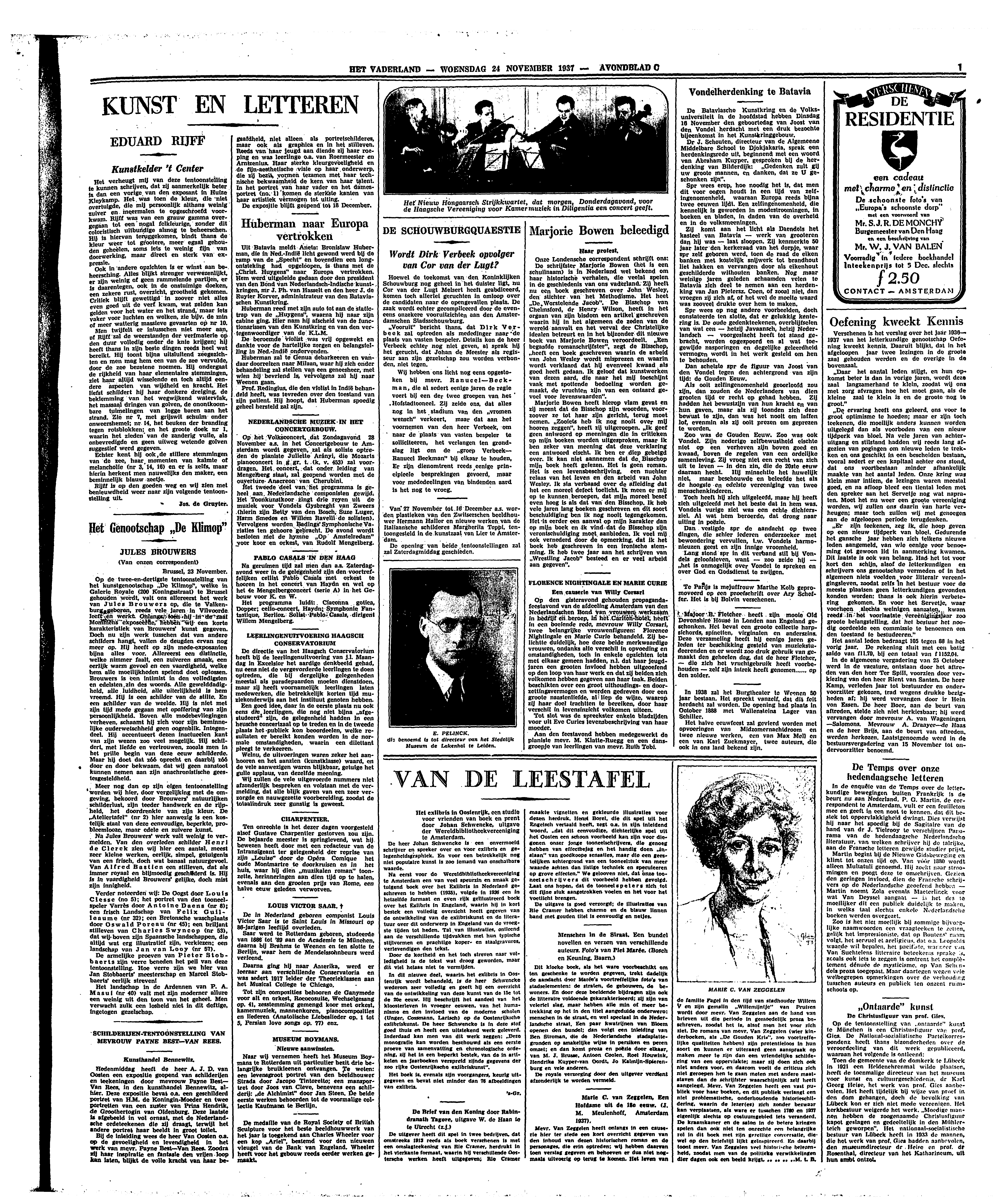 Mevr. Van Zeggelen heeft onlangs in een causerie hier ter stede een kort overzicht gegeven van den inhoud van dezen historischen roman en de personages, die erin optreden; wij hebben daarvan toen verslag gegeven en behoeven er dus niet nogmaals uitvoerig op terug te komen. Het leven van de familie Fagel in den tijd van stadhouder Willem V en zijn gemalin ‘Willemijntje’ van Pruisen wordt door mevr. Van Zeggelen aan de hand van brieven uit die periode in gemoedelijk proza beschreven, zoodat het is, alsof men het voor zich ziet. De romans van mevr. Van Zeggelen (wier kinderboeken, als ‘De Gouden Kris’, zoo voortreffelijke qualiteiten hebben) zijn pretentieloos in hun soort en kunnen er uiteraard geen aanspraak op maken meer te zijn dan een vriendelijke schildering van een oppervlakte; maar zij doen zich ook niet anders voor, en daarom voelt de criticus zich niet geroepen hen te gaan meten met andere maatstaven dan de schrijfster waarschijnlijk zelf heeft aangelegd. Mevr. Van Zeggelen heeft een vast publiek voor haar boeken, en dit publiek verlangt een niet problematische, onderhoudende historieschildering, waarin de lezer(es) zich zonder bezwaar kan verplaatsen, als ware er tusschen 1780 en 1937 eigenlijk slechts op costuumgebied iets veranderd. De kraamkamer en de salon in de betere kringen spelen dan ook niet ten onrechte een belangrijke rol in dit boek met zijn gezellige conversatie, die wel op den briefstijl lijkt geïnspireerd. En daarbij toont mevr. Van Zeggelen veel historische belezenheid, zoodat men van de politieke verwikkelingen dier dagen ook een beeld krijgt.........