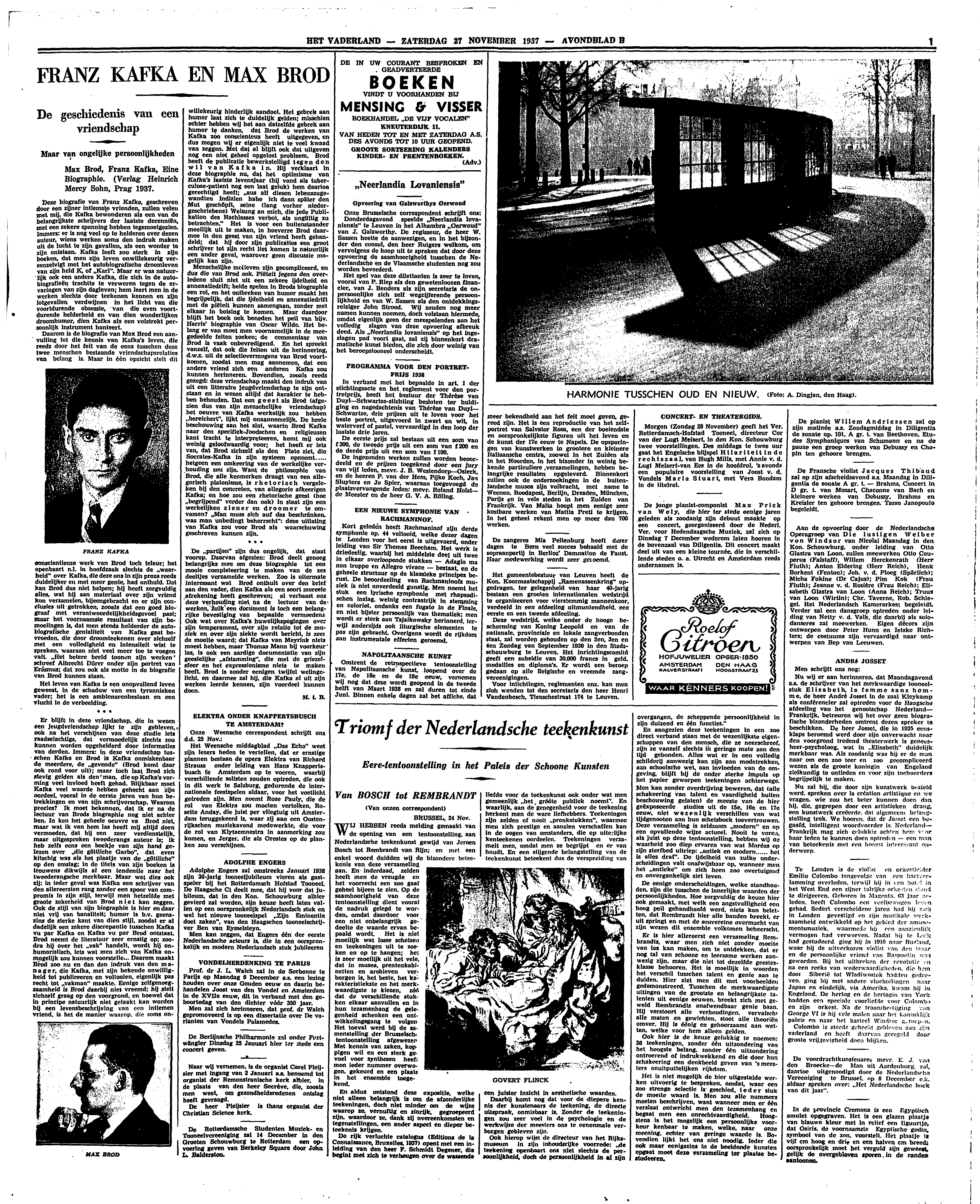 Deze biografie van Franz Kafka, geschreven door een zijner intiemste vrienden, zullen velen met mij, die Kafka bewonderen als een van de belangrijkste schrijvers der laatste decenniën, met een zekere spanning hebben tegemoetgezien. Immers: er is nog veel op te helderen over dezen auteur, wiens werken soms den indruk maken uit de lucht te zijn gevallen, als een wonder te zijn ontstaan. Kafka leeft zoo sterk in zijn boeken, dat men zijn leven onwillekeurig vereenzelvigt met het autobiografische droomleven van zijn held K, of ‘Karl’. Maar er was natuurlijk ook een andere Kafka, die zich in de autobiografieën trachtte te verweren tegen de ervaringen van zijn dagleven; hem leert men in de werken slechts door teekenen kennen en zijn lotgevallen verdwijnen in het licht van die voortdurende obsessie, van die even voortdurende helderheid en van dien wonderlijken droomhumor, dien Kafka als een volstrekt persoonlijk instrument hanteert.
