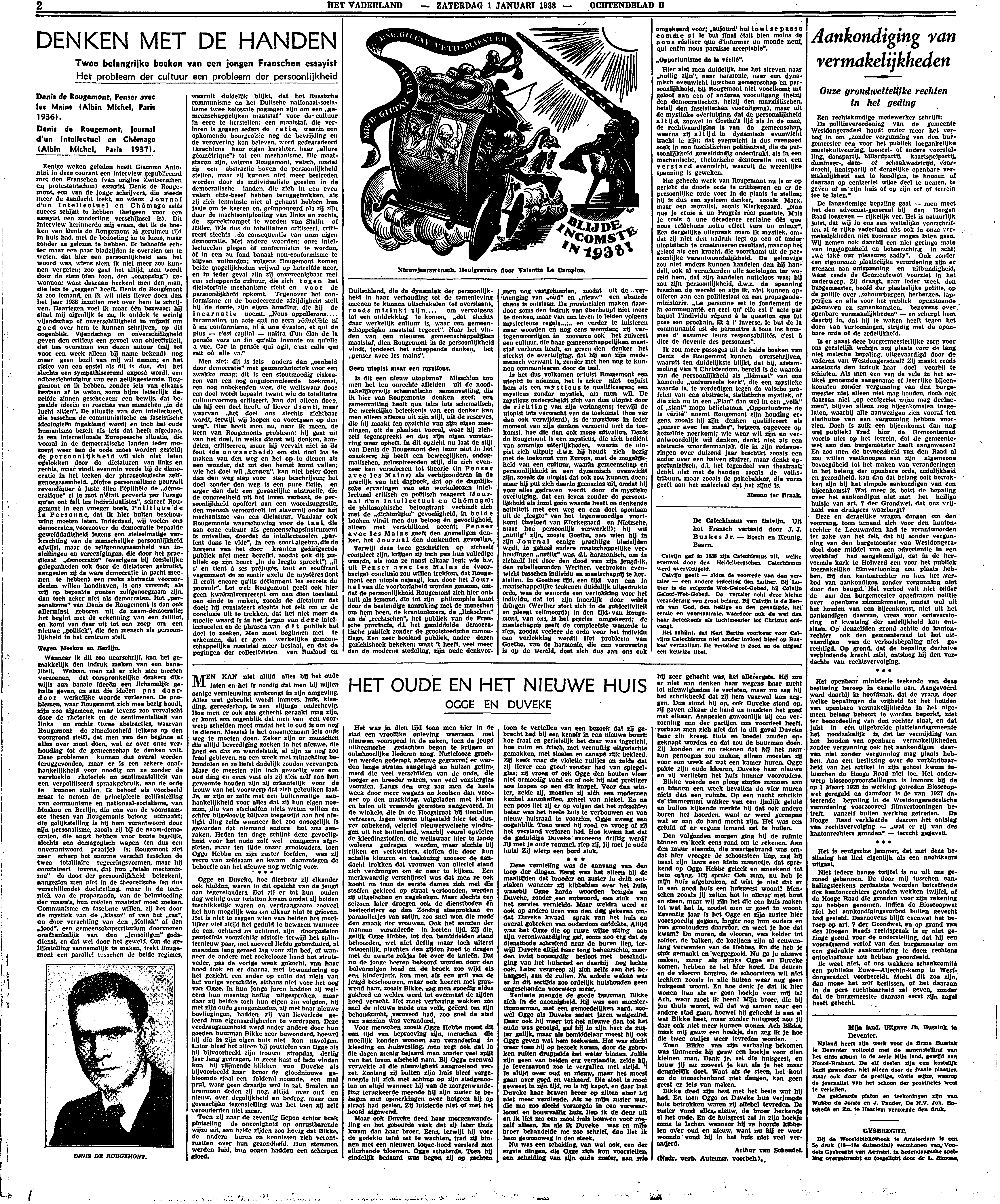 Eenige weken geleden heeft Giacomo Antonini in deze courant een interview gepubliceerd met den Franschen (van origine Zwitserschen en protestantschen) essayist Denis de Rougemont, een van de jonge schrijvers, die steeds meer de aandacht trekt, en wiens Journal d'un Intellectuel en Chômage zelfs succes schijnt te hebben (hetgeen voor een essayist een zonderling verschijnsel is). Dit interview herinnerde mij eraan, dat ik de boeken van Denis de Rougemont al geruimen tijd in huis had, met de bedoeling ze te lezen, maar zonder ze gelezen te hebben. Ik behoefde echter maar een paar bladzijden te overzien om te weten, dat hier een persoonlijkheid aan het woord was, wiens stem ik niet meer zou kunnen vergeten; zoo gaat het altijd, men wordt door de stem (den toon, den ‘oogopslag’) gewonnen: want daaraan herkent men den man, die iets te ‘zeggen’ heeft. Denis de Rougemont is zoo iemand, en ik wil niets liever doen dan het jaar 1938 inzetten met over hem te schrijven. Daartegen voel ik maar één bezwaar: hij staat mij eigenlijk te na, ik ontdek te weinig vijandschap of onverschilligheid in mijzelf om goed over hem te kunnen schrijven, op dit oogenblik. Vijandschap en onverschilligheid geven den criticus een gevoel van objectiviteit, dat ten overstaan van dezen auteur (mij tot voor een week alleen bij name bekend) nog maar geen bezit van mij wil nemen; en het risico van een opstel als dit is dus, dat het slechts een sympathiseerend exposé wordt, een adhaesiebetuiging van een gelijkgestemde. Rougemont en ik hebben, zonder iets van elkaars bestaan af te weten, soms bijna letterlijk dezelfde zinnen geschreven: een bewijs, dat bepaalde ideeën en reacties van menschen ‘in de lucht zitten’. De situatie van den intellectueel, die tusschen de communistische en fascistische ideologieën ingeklemd wordt en toch het oude humanisme beseft als iets dat heeft afgedaan, is een internationale Europeesche situatie, die vooral in de democratische landen ieder moment weer aan de orde moet worden gesteld; de persoonlijkheid wil zich niet laten opslokken door de dictaturen van links en rechts, maar vindt evenmin vrede bij de democratie in het teeken der phraseologische zelfgenoegzaamheid. ‘Notre personnalisme pourrait revendiquer à juste titre l'épithète de “démocratique” si le mot n'était perverti par l'usage qu'en ont fait les individualistes’, schreef Rougemont in een vroeger boek. Politique de la Personne, dat ik hier buiten beschouwing moeten laten. Inderdaad, wij voelen ons democraten, voorzoover de democratie bepaalde gewelddadigheid jegens een stelselmatige verkrachting van de menschelijke persoonlijkheid afwijst, maar de zelfgenoegzaamheid van instellingen en vereenigingen, die door het praedicaat ‘democratie’ (overigens bij feestelijke gelegenheden ook door de dictatoren gebruikt, aangezien zij de ware democratie in pacht meenen te hebben) een reeks abstracte vooroordeelen willen handhaven, is ons vreemd; als wij op bepaalde punten zelfgenoegzaam zijn, dan toch zeker niet als democraten. Het ‘personalisme’ van Denis de Rougemont is dan ook allerminst geboren uit de naam-democratie; het begint met de erkenning van een failliet, en komt van daar uit tot een roep om een nieuwe ‘politiek’, die den mensch als persoonlijkheid in het centrum stelt.