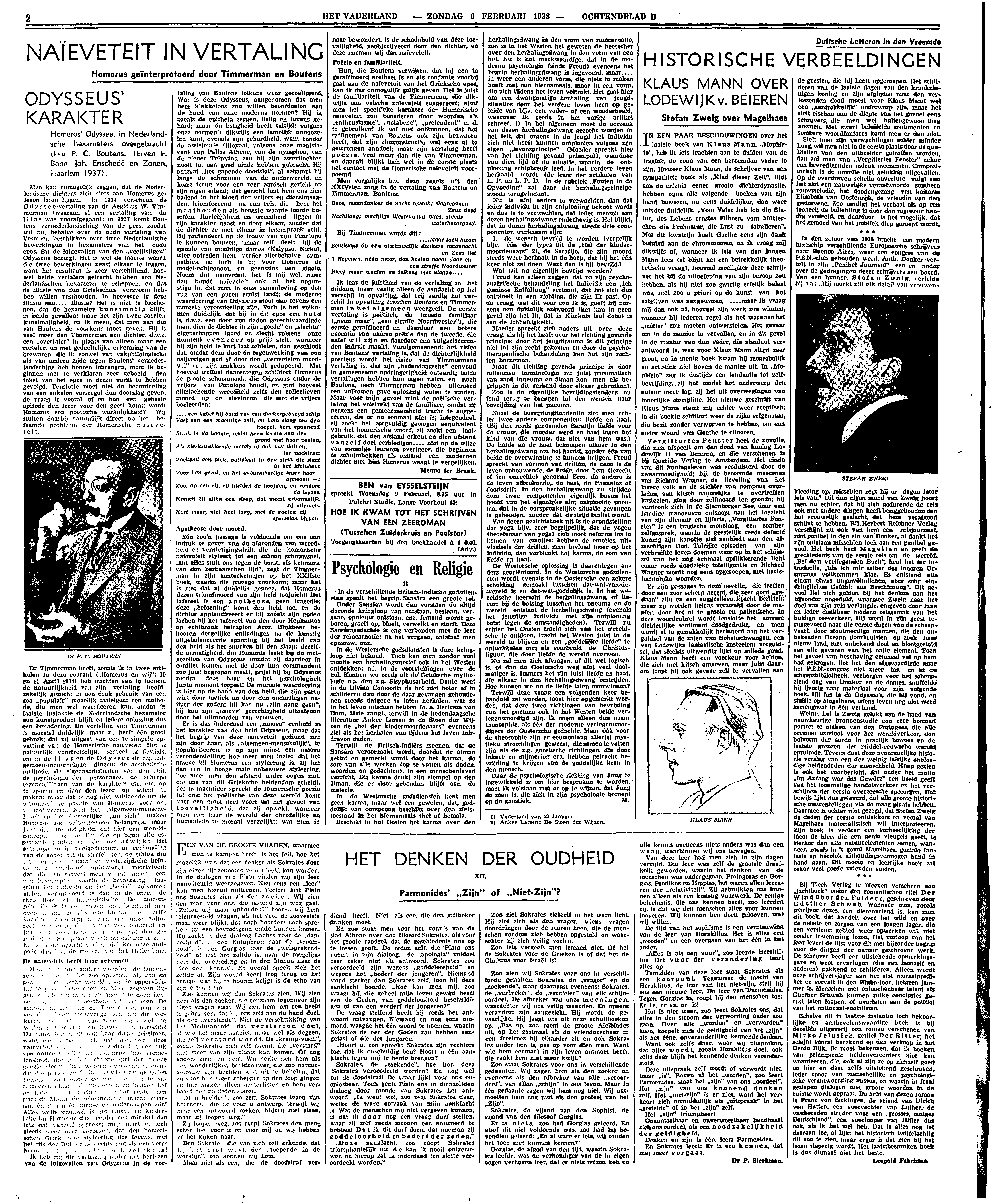 Dr Timmerman heeft, zooals ik in twee artikelen in deze courant (‘Homerus en wij’; 10 en 11 April 1934) heb trachten aan te toonen. de natuurlijkheid van zijn vertaling hoofdzakelijk gezocht in een druk gebruik van een zoo ‘populair’ mogelijk taaleigen; een methode, die men wel waardeeren kan, omdat in laatste Instantie de Nederlandsche hexameter een kunstproduct blijft en iedere oplossing dus een benadering. De vertaling van Timmerman is meestal duidelijk, maar zij heeft één groot gebrek: dat zij uitgaat van een te simpele opvatting van de Homerische naïeveteit. Het is natuurlijk voortreffelijk. schreef ik destijds. om in de Ilias en de Odyssee de z.g. ‘algemeen-menschelijke’ dingen: de aesthetische methode. de eigenaardigheden van den stijl. de psychologie der personages. de scherpe tegenstellingen van de karakters etc. etc. op te sporen en daar den lezer op attent te maken: maar dat is nog niet voldoende om de uitzonderlijke positie van Homerus voor ons te motiveeren. Niet het ‘algemeen-menschelijke’ en het dichterlijke ‘an sich’ maken Homerus zoo buitengewoon belangrijk, maar juist die omstandigheid[,] dat hier een wereldconceptie voor ons ligt[,] die op bijna alle essentieele punten van de onze afwijkt. Het anthropomorphe veelgodendom. de verhouding van de goden tot de sterfelijken, de ethiek die uit hun ‘concubinaat’ en wederzijdsche beïnvloeding (inclusief oplichterij voortvloeit: dat alles en zooveel meer vormt samen een wereldconceptie waarin de betrekking tusschen het individu en het ‘heelal’ volkomen anders verantwoord is dan in de onze, de christelijke of humanistische. De homerische Griek is een wezen, dat begiftigd met overeenkomstige physieke [functies] en zelfs karaktereigenschappen, zich van onze cultureele [waarde]bepalingen niet veel aantrekt en kenn[nelijk] [geen] no[tie] [heeft] van wat den gemiddelden Europeaan voorkomt cultuur te zijn; hij is [in] d[it] opzicht veel duidelijker onze antipode dan b.v. de mensch van het Hellenisme.