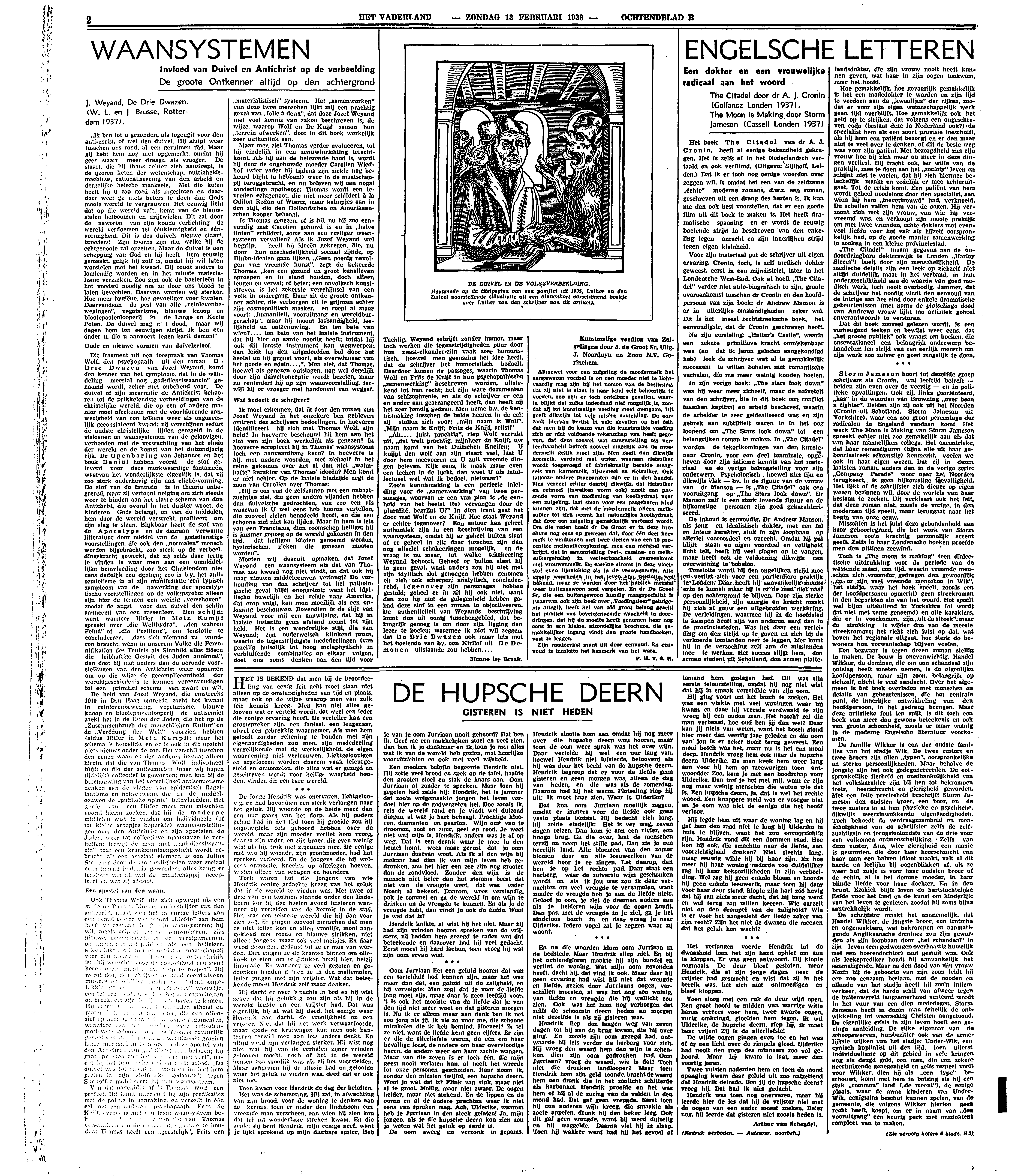 Zoo'n kennismaking is een perfecte inleiding voor de ‘samenwerking’ van twee personages, waarvan er een van plan is ‘de eenheid van het heelal (te) vervangen door de pluralité, begrijpt U?’ In dien trant gaat het door met Wolf en de Knijf. Hoe staat Weyand er echter tegenover? Een auteur kan geheel authentiek zijn in een beschrijving van een waansysteem, omdat hij er geheel buiten staat of er geheel in zit; daar tusschen zijn dan nog allerlei schakeeringen mogelijk, en de vraag is nu maar, tot welke schakeering Weyand behoort. Geheel er buiten staat hij in geen geval, want anders zou hij niet met zijn idyllisch slot genoegen hebben genomen en zich ook scherper, analytisch, concludeerend, tegenover zijn personages hebben gesteld; geheel er in zit hij ook niet, want dan zou hij niet de gelegenheid hebben gehad deze stof in een roman te objectiveeren. De authenticiteit van Weyands beschrijving komt dus uit eenig tusschengebied, dat belangrijk genoeg is om door zijn ligging den lezer te boeien; waarmee ik niet wil zeggen, dat De Drie Dwazen ook maar iets met het boeiende van bv. een Kirilof uit De Demonen uitstaande zou hebben....
