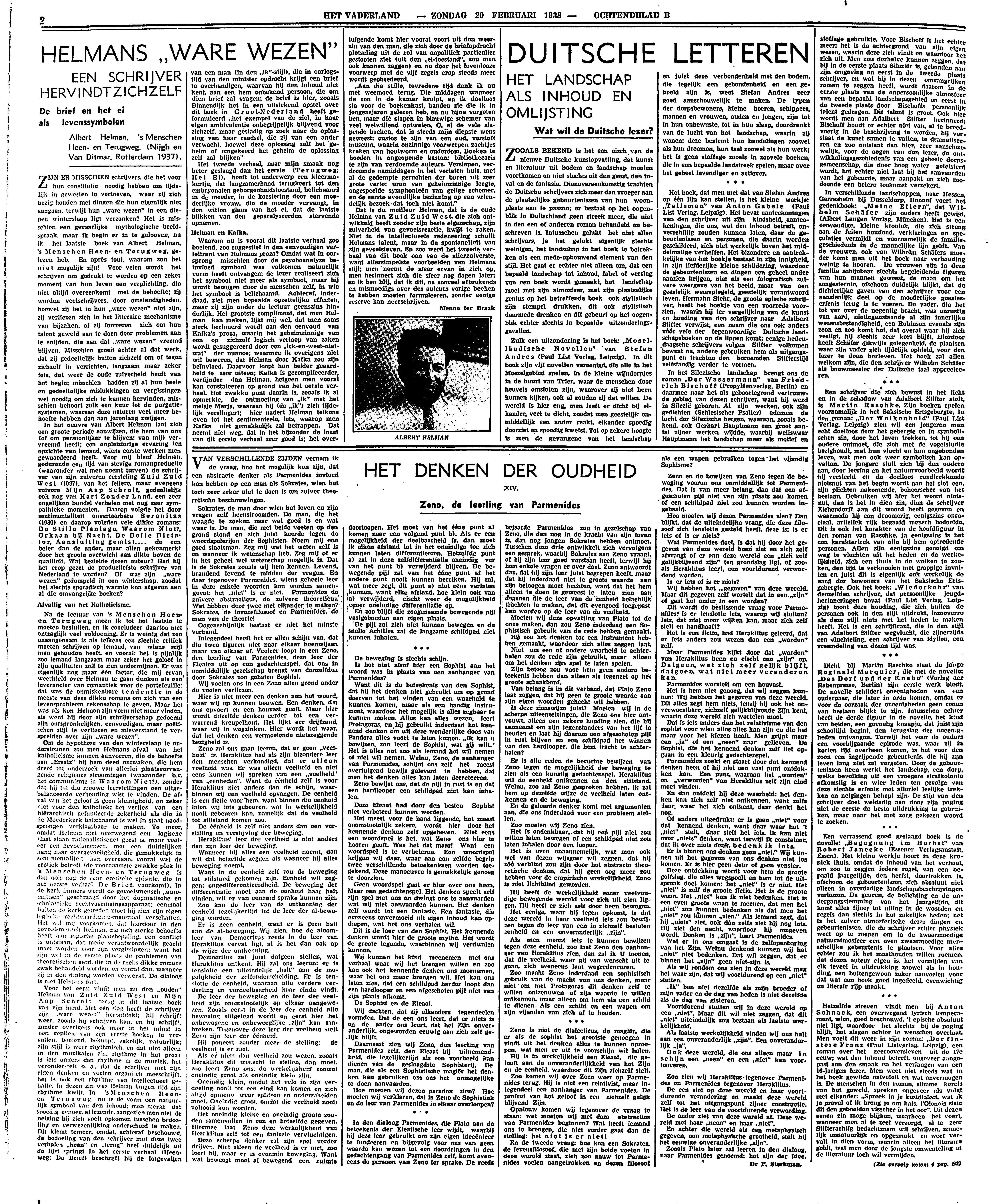 Dat is du meilleur Helman, dat is de oude Helman van Zuid Zuid West, die zich ontwikkeld heeft zonder zijn beste eigenschap, zijn zuiverheid van gevoelsreactie, kwijt te raken. Niet in de intellectuelle redeneering schuilt Helmans talent, maar in de spontaneïteit van zijn gevoelsleven. En zoo werd het tweede verhaal van dit boek een van de allerzuiverste, want allersimpelste voorbeelden van Helmans stijl; men neemt de sfeer ervan in zich op, men herinnert zich die sfeer nog dagen later; en ik ben blij, dat ik dit, na zooveel afbrekends en mismoedigs over des auteurs vorige boeken te hebben moeten formuleeren, zonder eenige reserve kan neerschrijven.