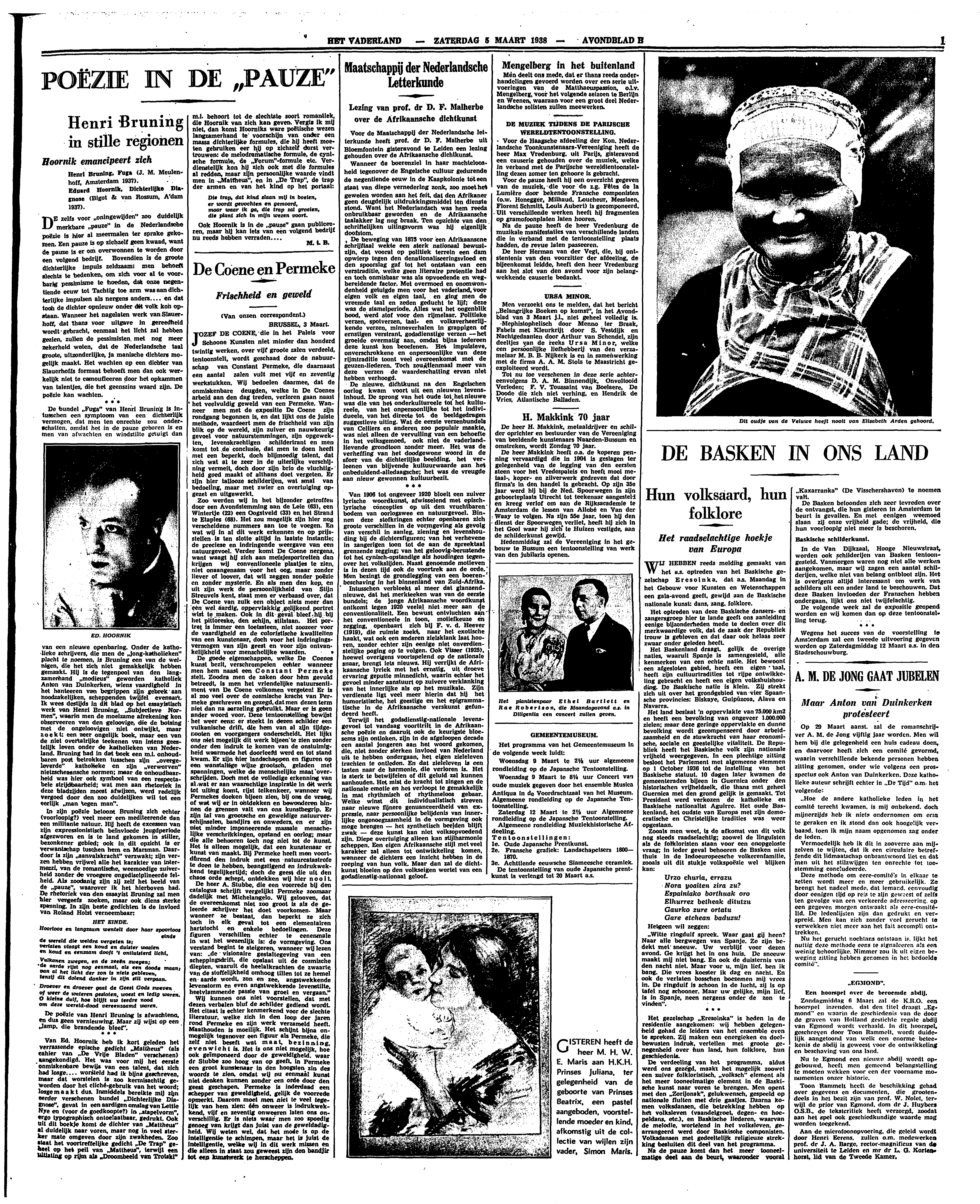 DE zelfs voor ‘oningewijden’ zoo duidelijk merkbare ‘pauze’ in de Nederlandsche poëzie is hier al meermalen ter sprake gekomen. Een pauze is op zichzelf geen kwaad, want de pauze is er om overwonnen te worden door een volgend bedrijf. Bovendien is de groote dichterlijke impuls zeldzaam; men behoeft slechts te bedenken, om zich voor al te voorbarig pessimisme te hoeden, dat onze negentiende eeuw tot Tachtig toe arm was aan dichterlijke impulsen als nergens anders.... en dat toch de dichter opnieuw onder dit volk kon opstaan. Wanneer het nagelaten werk van Slauerhoff, dat thans voor uitgave in gereedheid wordt gebracht, eenmaal het licht zal hebben gezien, zullen de pessimisten met nog meer zekerheid weten, dat de Nederlandsche taal groote, uitzonderlijke, ja manische dichters mogelijk maakt. Het wachten op een dichter van Slauerhoffs formaat behoeft men dan ook werkelijk niet te camoufleeren door het opkammen van talentjes, die het geenszins waard zijn. De poëzie kan wachten.