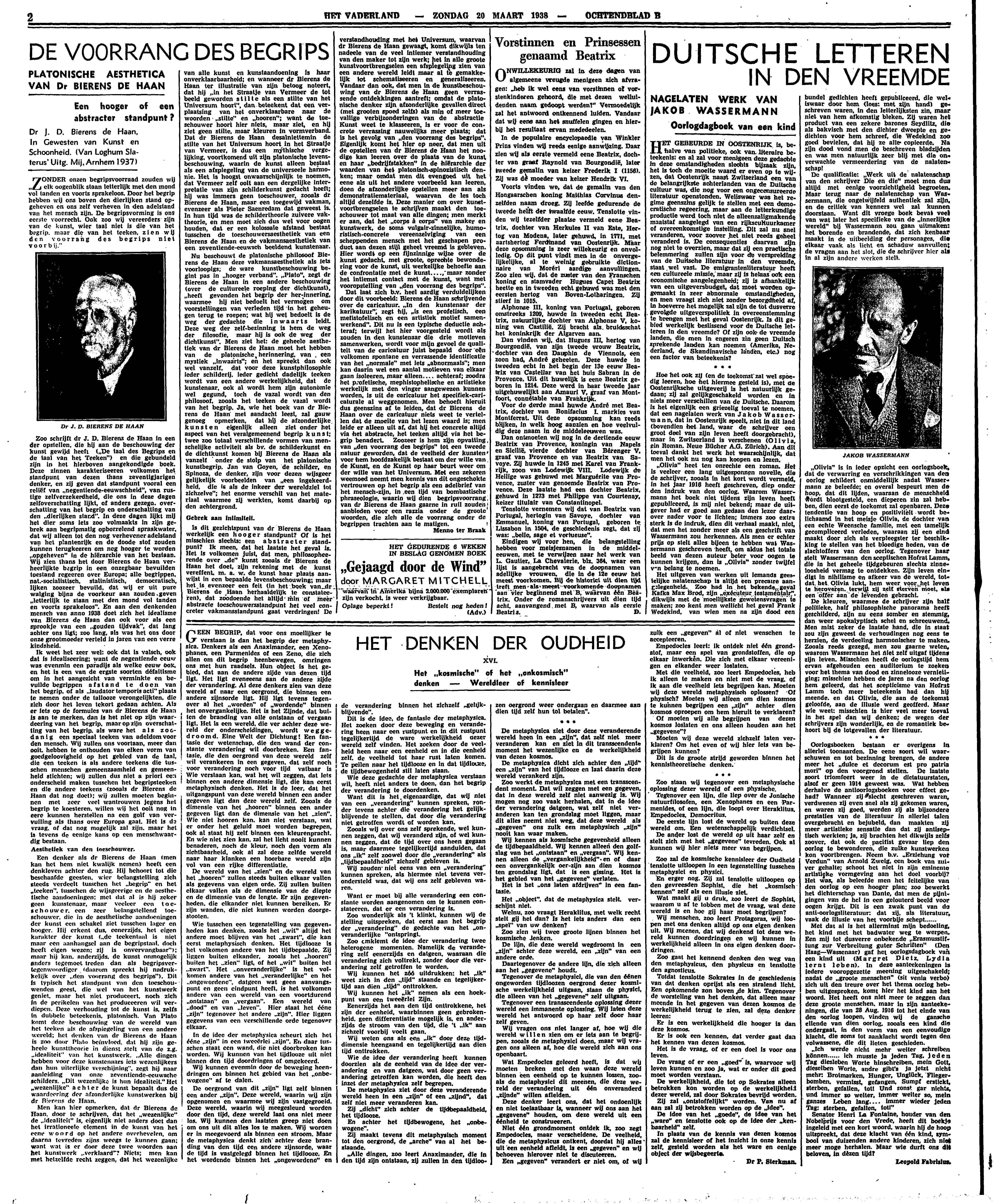 Zoo schrijft dr J.D. Bierens de Haan in een der opstellen, die hij aan de beschouwing der kunst gewijd heeft (‘De taal des Begrips en de taal van het Teeken’) en die gebundeld zijn in het hierboven aangekondigde boek. Deze zinnen karakteriseeren volkomen het standpunt van dezen thans zeventigjarigen denker, en zij geven dat standpunt vooral een reliëf van ‘negentiende-eeuwschheid’, van rustige zelfverzekerdheid, die ons in deze dagen zelfoverschatting lijkt, of anders gezegd, overschatting van het begrip en onderschatting van den ‘dierlijken stand’. In deze dagen lijkt mij het dier soms iets zoo volmaakts in zijn gebrek aan begripmatig opborrelend spraakwater, dat wij alleen tot den nog verhevener adelstand van het plantenrijk en de doode stof zouden kunnen terugkeeren om neg hooger te worden ‘opgeheven’ in de hiërarchie van het bestaan. Wij zien thans het door Bierens de Haan verheerlijkte begrip in een onzegbaar bevuilden toestand regeeren over Europa; alle begrippen, nat.-socialistisch, stalinistisch, democratisch, lijken zoozeer bevuild, dat wij er uit pure walging bijna de voorkeur aan zouden geven ‘letterlijk te staan met den mond vol tanden en voorts sprakeloos’. En aan den denkenden mensch van anno 1938 doet zich het idealisme van Bierens de Haan dan ook voor als een sprookje van een ‘gouden tijdvak’, dat lang achter ons ligt; zoo lang, als was het ons door onze grootmoeder verteld in jaren van een verre kindsheid.