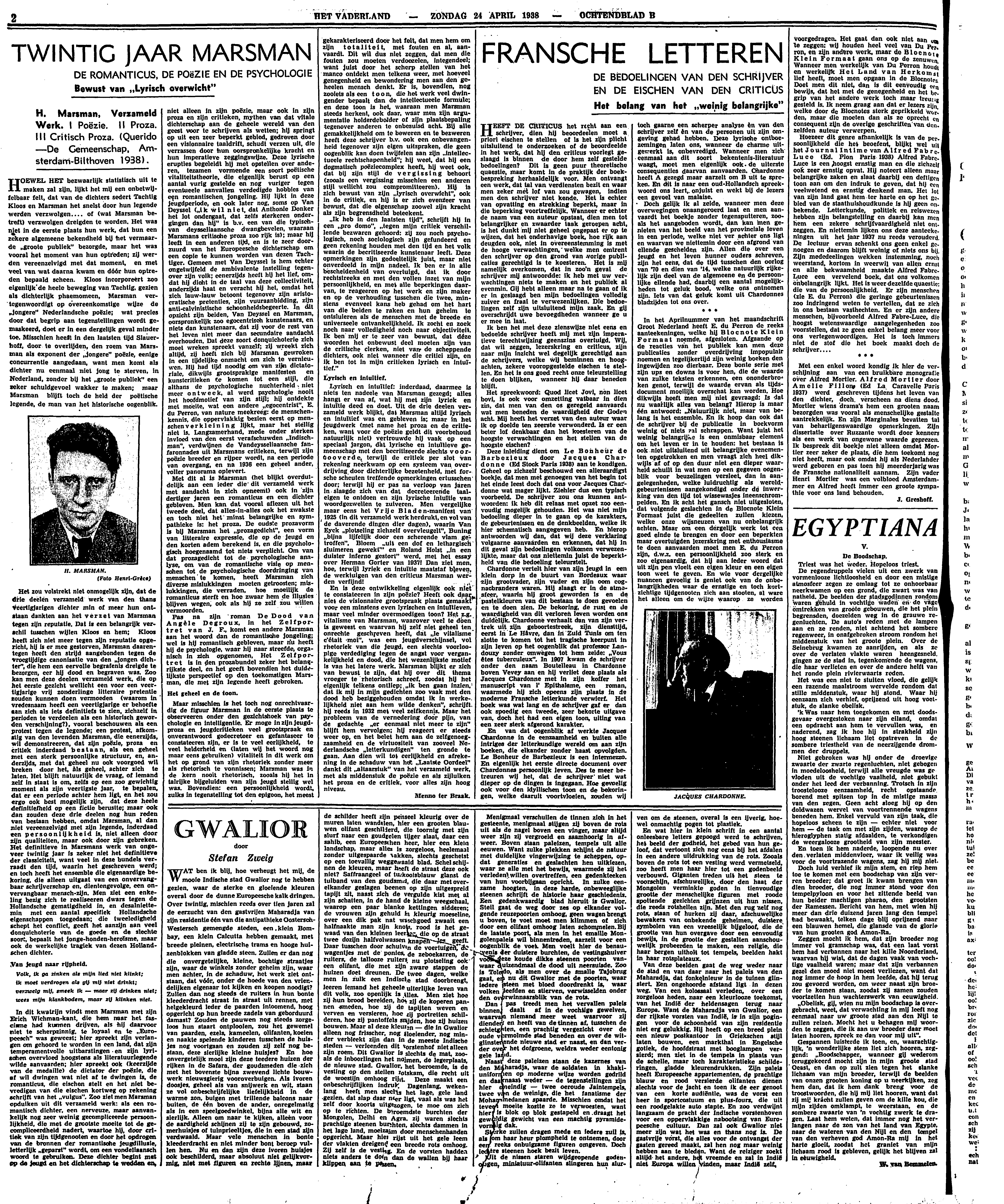 In dit kwatrijn vindt men Marsman met zijn Erich Wichman-kant, die hem naar het fascisme had kunnen drijven, als hij daarvoor niet te scherpzinnig, te loyaal en te ‘Europeesch’ was geweest; hier spreekt zijn verlangen om gehoord te worden in een land, dat zijn temperamentvolle uitbarstingen en zijn lyrischen overvloed hoogstens als literatuurlegende wilde aanvaarden; hier spreekt ook (keerzijde van de medaille) de dictator der poëzie, die af wil dwingen wat niet af te dwingen is, de romanticus, die eischen stelt en het niet bevredigen van die eischen kortweg op rekening schrijft van het ‘vulgus’. Zoo ziet men Marsman opduiken uit dit verzameld werk: als een romantisch dichter, een nerveuze, maar aanvankelijk nog zeer weinig gecompliceerde persoonlijkheid, die met de grootste moeite tot de gecompliceerdheid nadert, waartoe hij, door critiek van zijn tijdgenooten en door het opdrogen van de bronnen der romantische jeugdillusie, letterlijk ‘geparst’ wordt, om een vondeliaansch woord te gebruiken. Deze dichter begint met op de jeugd en het dichterschap te wedden en, niet alleen in zijn poëzie, maar ook in zijn proza en zijn critieken, mythen van dat vitale dichterschap aan de geheele wereld van den geest voor te schrijven als wetten; hij springt op uit een zeer beperkt gebied, gedreven door een visionnaire taaldrift, schudt verzen uit, die verrassen door hun oorspronkelijke kracht en hun imperatieve zeggingswijze. Deze lyrische erupties begeleidt hij met opstellen over anderen, tezamen vormende een soort poëtische vitaliteitstheorie, die eigenlijk berust op een aantal vurig gestelde en nog vuriger tegen eventueele aanvallen verdedigde hobbies van een romantischen jongeling. Hij lijkt in deze jeugdperiode, en ook later nog, soms op Van Deyssel (‘ik wil niet, dat Anthonie Donker het lot ondergaat, dat zelfs sterkeren ondergingen dan hij’ is b.v. een van die typisch- van deysseliaansche dwangbevelen, waaraan Marsmans critische proza zoo rijk is); maar hij leeft in een anderen tijd, en is te zeer door- zuurd van het Europeesche dichterschap om een copie te kunnen worden van dezen Tachtiger. Gemeen met Van Deyssel is hem echter ongetwijfeld de ambivalente instelling tegenover zijn volk; eenerzijds heeft hij het lief, omdat hij dicht in de taal van deze collectiviteit, anderzijds haat en veracht hij het, omdat het zich lauw-lauw betoont tegenover zijn aristocratische pretenties, zijn vuuraanbidding, zijn anti-calvinistische schoonheidsbegeerte. In dit opzicht zijn beiden. Van Deyssel en Marsman, oorspronkelijk zoo egocentrisch kunstenaars, en niets dan kunstenaars, dat zij voor de rest van het leven niet meer dan secundaire aandacht overhouden. Dat deze soort donquichoterie zich moet wreken spreekt vanzelf; zij wreekt zich altijd, zij heeft zich bij Marsman gewroken in een tijdelijke onmacht om zich te vernieuwen. Hij had tijd noodig om van zijn dictatoriale, dikwijls grootsprakige manifesten en kunstcritieken te komen tot een stijl, die althans de psychologische nuchterheid niet meer ontweek, al werd psychologie nooit het hoofdmotief van zijn stijl; hij ontdekte met moeite, wat een andere ‘egocentrist’, E. du Perron, van nature meekreeg: de menschenkennis, die oppervlakkig bezien eerst op menschen verkleining lijkt, maar het stellig niet is. Langzamerhand, mede onder sterken invloed van den eerst verafschuwden ‘Indischman’, verdwijnen de Vandeysseliaansche fanfaronnades uit Marsmans critieken, terwijl zijn poëzie breeder en rijper wordt, na een periode van overgang, en na 1936 een geheel ander, voller panorama oplevert.