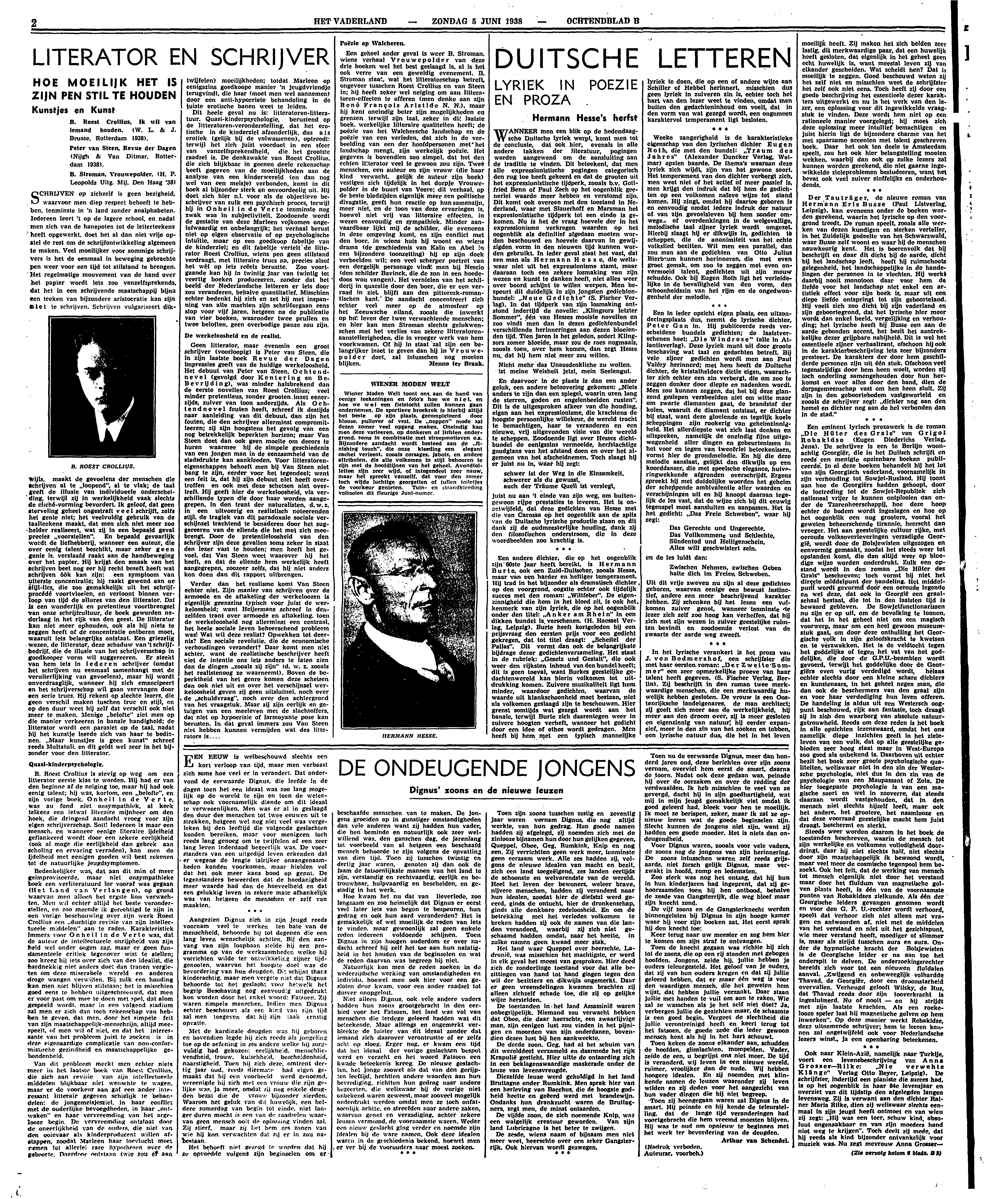 B. Roest Crollius is stevig op weg om een litterator eerste klas te worden. Hij had er van den beginne af de neiging toe, maar hij had ook eenig talent; hij was, kortom, een ‘belofte’, en zijn vorige boek. Onheil in de Verte, was au fond niet onsympathiek, al keek telkens een ietwat literaire mijnheer om den hoek, die dringend aandacht vroeg voor zijn eigen schrijverschap. Soit! Iedereen is maar een mensch, en wanneer eenige literaire ijdelheid geflankeerd wordt door een zekere eerlijkheid (ook al moge die eerlijkheid dan gebrek aan scholing en ervaring verraden), kan men de ijdelheid met eenigen goeden wil best rekenen tot de natuurlijke jeugdsymptomen.