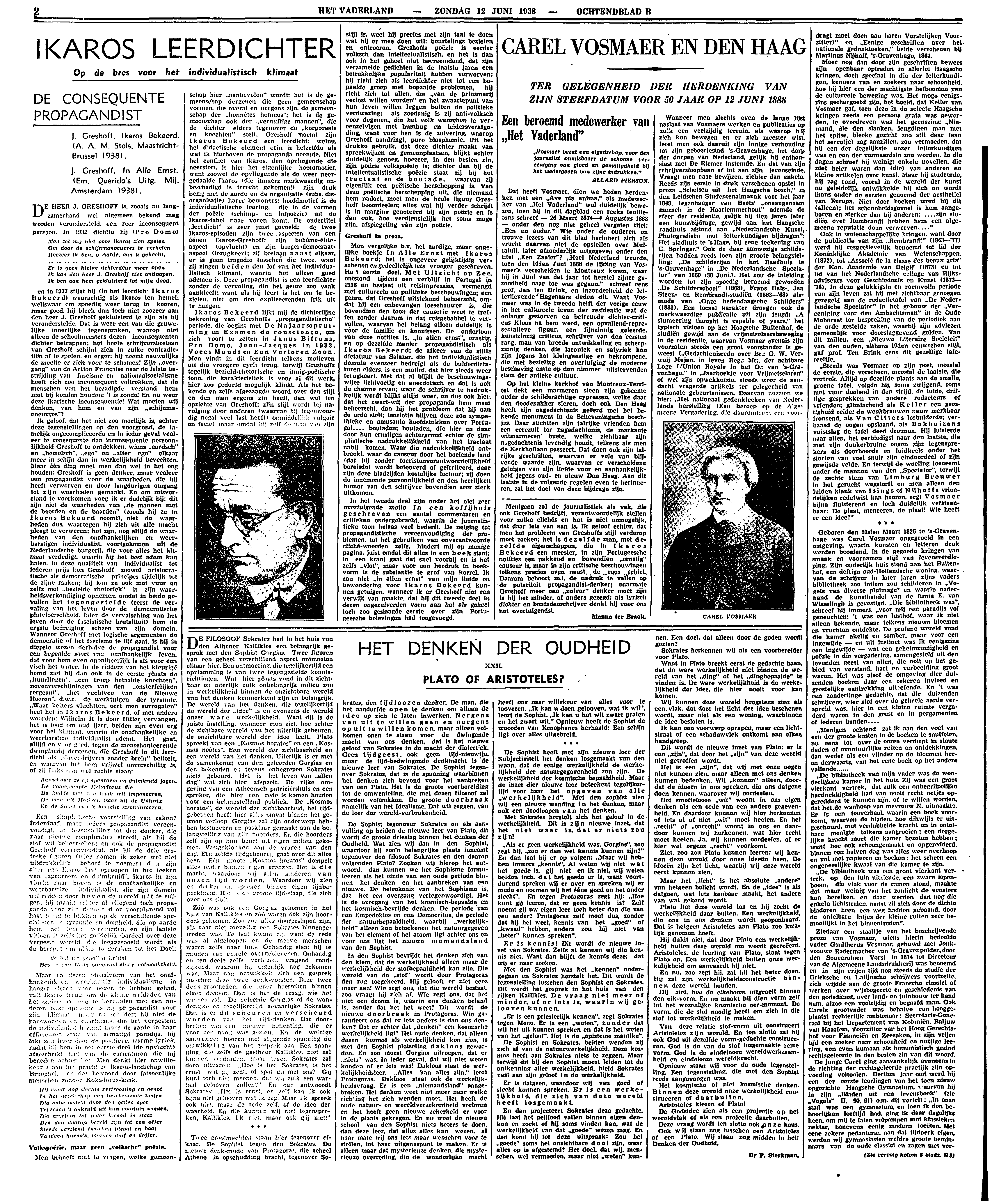 en in 1937 stijgt hij (in het leerdich Ikaros Bekeerd) waarachtig als Ikaros ten hemel: weliswaar om spoedig weer terug te keeren, maar goed, hij bleek dan toch niet zoozeer aan den heer J. Greshoff gekluisterd te zijn als hij veronderstelde. Dat is weer een van die gruwelijke innerlijke tegenspraken, waarop niet alleen de schoolmeesters dezen inconsequenten dichter betrappen: het heele schrijversbestaan van Greshoff schijnt zich in zulke contradictiën af te spelen. en erger: hij neemt nauwelijks de moeite er zich voor te schamen! Zijn ‘overgang’ van de Action Française naar de felste bestrijding van fascisme en nationaalsocialisme heeft zich zoo inconsequent voltrokken, dat de menschen van het bezadigde verstand hem niet bij konden houden: 't is zonde! En nu weer deze ikarische inconsequentie! Wat moeten wij denken, van hem en van zijn ‘schijnmanoeuvres’?