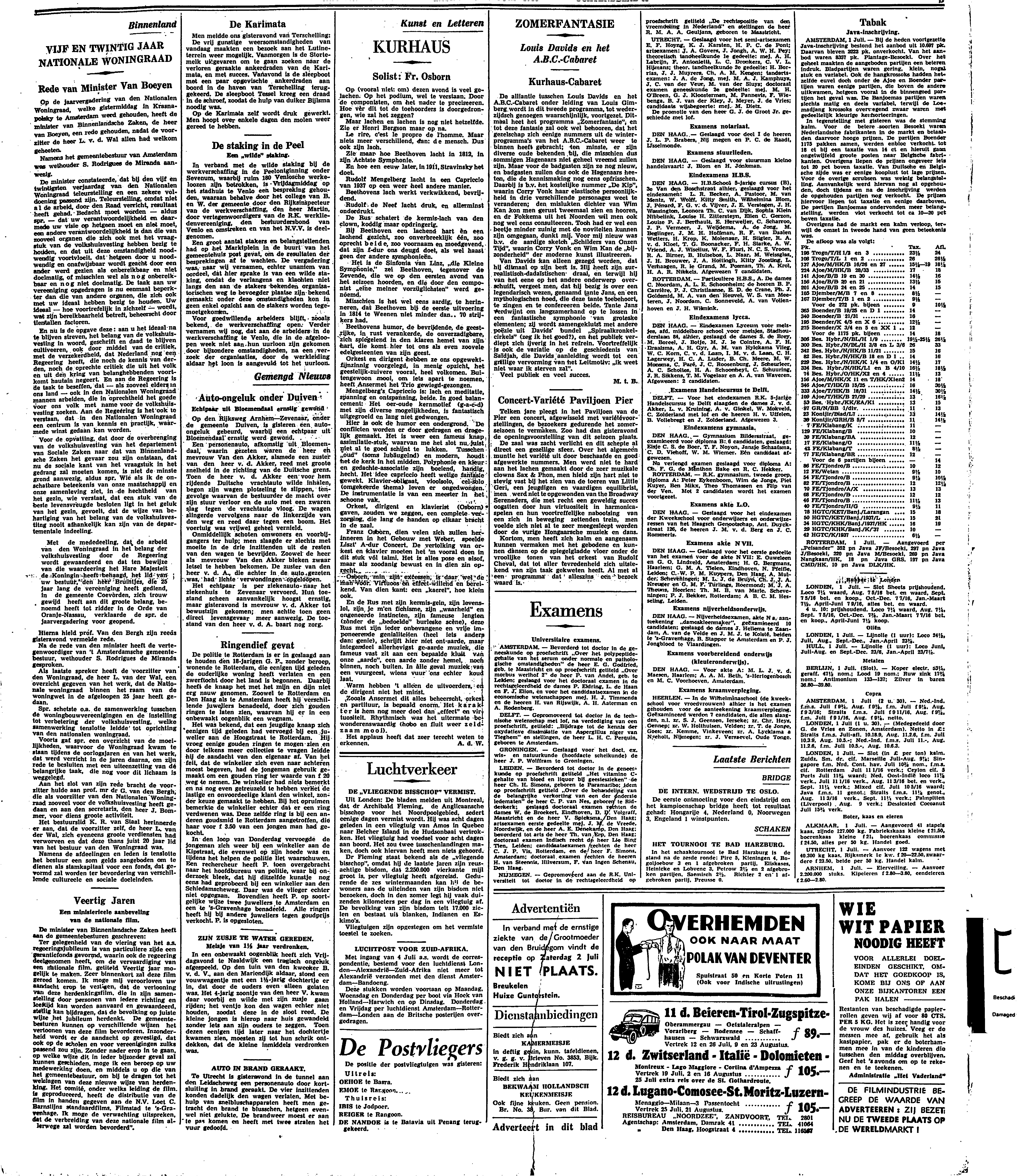 De alliantie tusschen Louis Davids en het A.B.C.-Cabaret onder leiding van Louis Gimberg wordt in dit tweede programma, tot wederzijdsch genoegen waarschijnlijk, voortgezet. Ditmaal heet het programma ‘Zomerfantasie’, en tot deze fantasie zal ook wel behooren, dat het gezelschap zich eenige nummers uit de winterprogramma's van het A.B.C.-Cabaret weer te binnen heeft gebracht; ten minste, er zijn diverse oude bekenden bij, die misschien dus sommigen Hagenaars niet geheel vreemd zullen zijn. Maar voor de badgasten zijn ze nog nieuw, en badgasten zullen dus ook de Hagenaars heeten, die de kennismaking nog eens opfrisschen. Daarbij is b.v. het kostelijke nummer ‘De Kip’, waarin Corry Vonk haar elastische persoonlijkheid in drie verschillende personages weet te veranderen; den mislukten dichter van Wim Kan kon men gerust tweemaal zien en hooren, en dr Fokkema uit het Noorden wil men ook nog wel eens consulteeren. Toch had er wel een beetje minder zuinig met de noviteiten kunnen zijn omgegaan, dunkt mij. Voor mij nieuw was b.v. de aardige sketch ‘Schilders van Onzen Tijd’, waarin Corry Vonk en Wim Kan de ‘bijzonderheid’ der moderne kunst illustreeren.