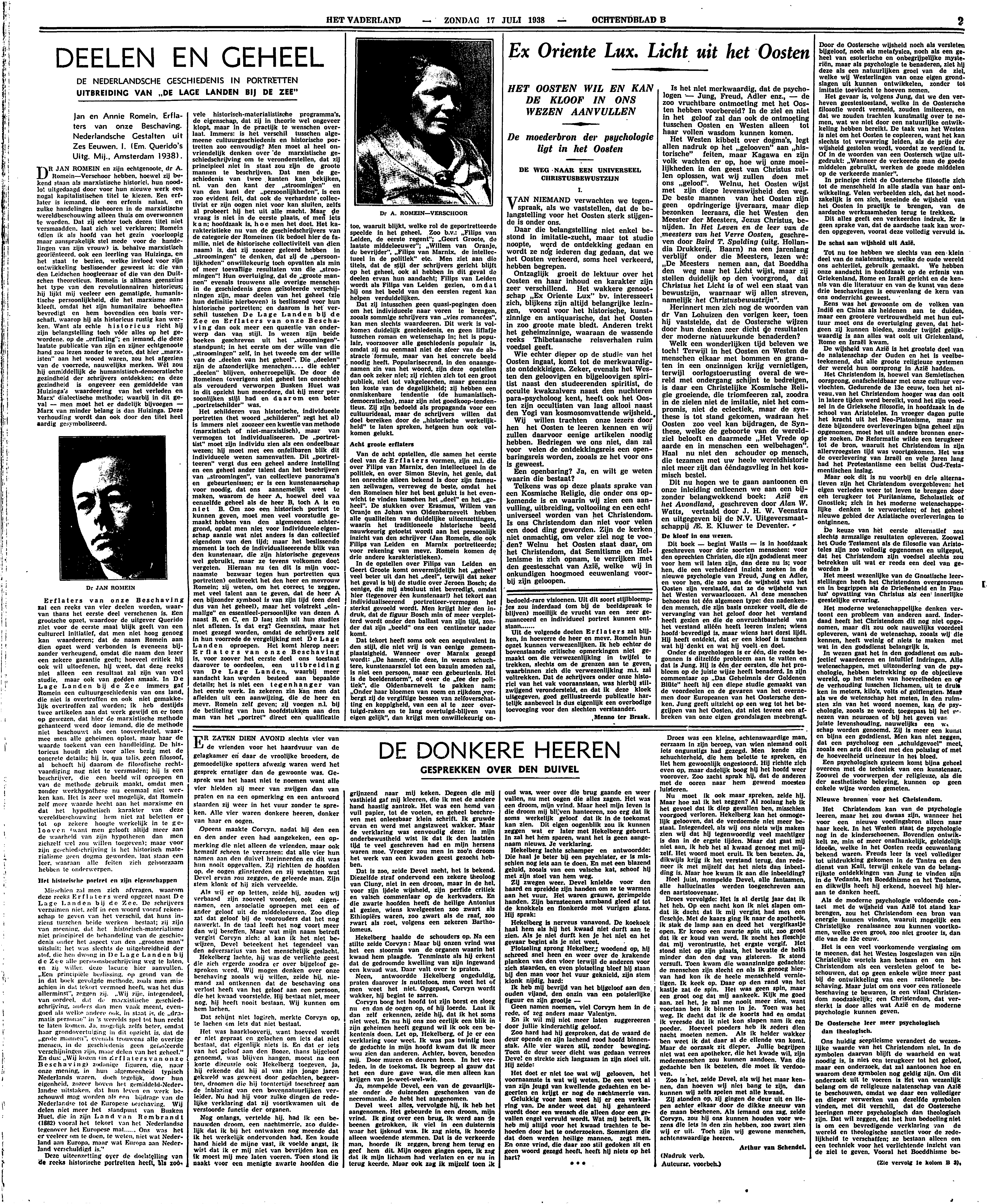 DR JAN ROMEIN en zijn echtgenoote, dr A. Romein - Verschoor hebben, hoewel zij bekend staan als marxistische historici, hun noodlot uitgedaagd door voor hun nieuwe werk een nogal kapitalistischen titel te kiezen. Een erflater is iemand, die een erfenis nalaat, en zulke handelingen behooren in de marxistische wereldbeschouwing alleen thuis om overwonnen te worden. Dat zij echter toch dezen titel niet versmaadden, laat zich wel verklaren: Romein (dien ik als hoofd van het gezin voorloopig maar aansprakelijk stel mede voor de handelingen van zijn vrouw) is, behalve marxistisch georiënteerd, ook een leerling van Huizinga, en het staat te bezien, welke invloed voor zijn ontwikkeling beslissender geweest is: die van den Leidschen hoogleeraar of die van den Duitschen theoreticus. Romein is althans geenszins het type van den revolutionnairen historicus; hij lijkt mij veeleer een gematigde, humanistische persoonlijkheid, die het marxisme aankleeft, omdat het zijn humanitaire behoeften bevredigt en hem bovendien een basis verschaft, waarop hij als historicus rustig kan werken. Want als echte historicus richt hij zijn belangstelling toch vóór alles op het gewordene, op de ‘erflating’; en iemand, die deze laatste publicatie van zijn en zijner echtgenoote hand zou lezen zonder te weten, dat hier ‘marxisten’ aan het woord waren, zou het afgezien van de voorrede, nauwelijks merken. Wèl zou hij onmiddellijk de humanistisch-democratische gezindheid der schrijvers ontdekken: en deze gezindheid is ongeveer een gemiddelde van Huizinga's waardeering van het verleden en Marx' dialectische methode; waarbij in dit geval - men moet het er dadelijk bijvoegen - Marx van minder belang is dan Huizinga. Deze verhouding wordt dan ook door den titel heel aardig gesymboliseerd.