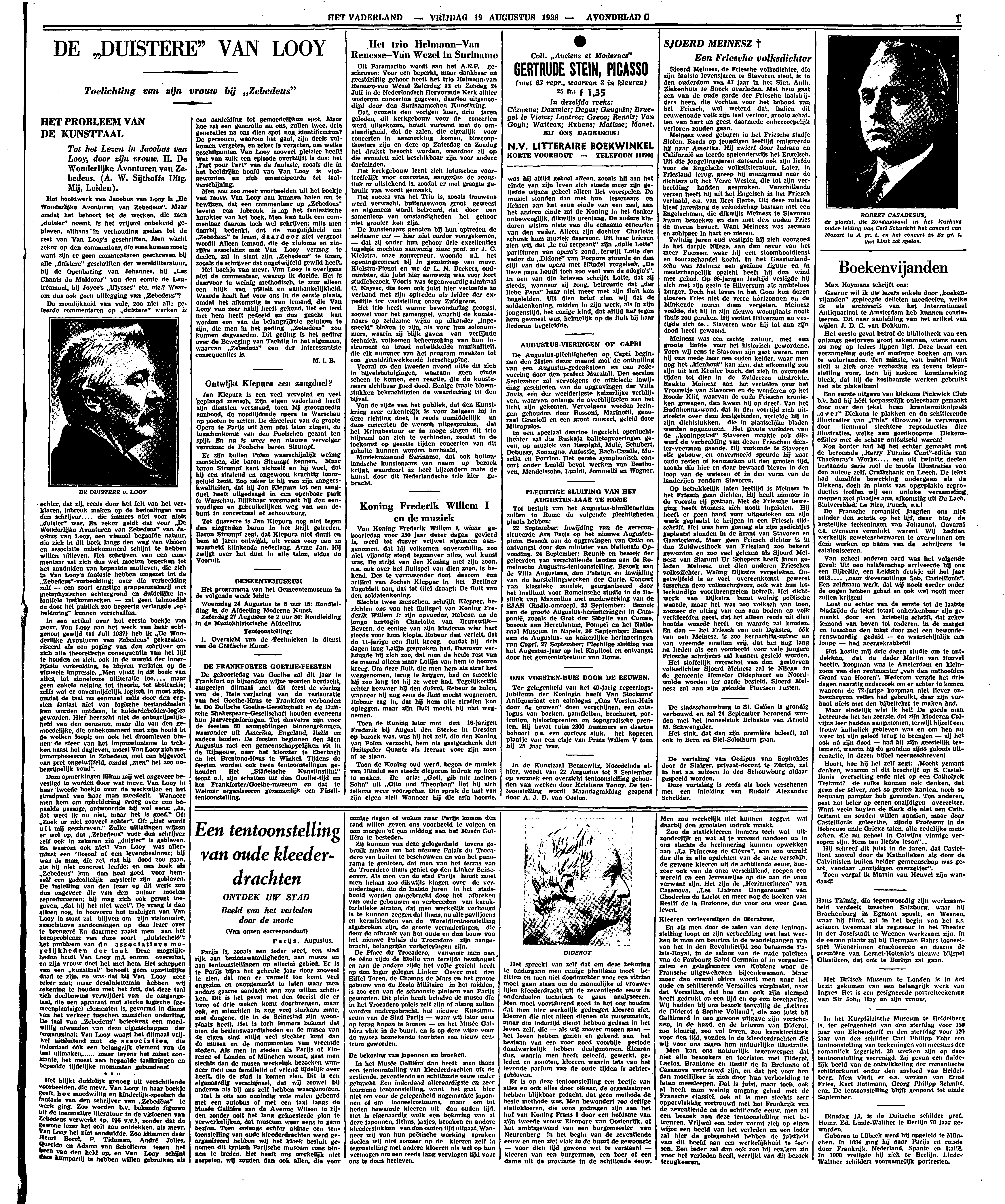 Het hoofdwerk van Jacobus van Looy is ‘De Wonderlijke Avonturen van Zebedeus’. Maar omdat het behoort tot de werken, die men ‘duister’ noemt, is het vrijwel onbekend gebleven, althans in verhouding gezien tot de rest van Van Looy's geschriften. Men wacht zeker op den commentaar, die eens komen moet; want zijn er geen commentaren geschreven bij alle ‘duistere’ geschriften der wereldliteratuur, bij de Openbaring van Johannes, bij ‘Les Chants de Maldoror’ van den comte de Lautréamont, bij Joyce's ‘Ulysses’ etc. etc.? Waarom dus ook geen uitlegging van ‘Zebedeus’?