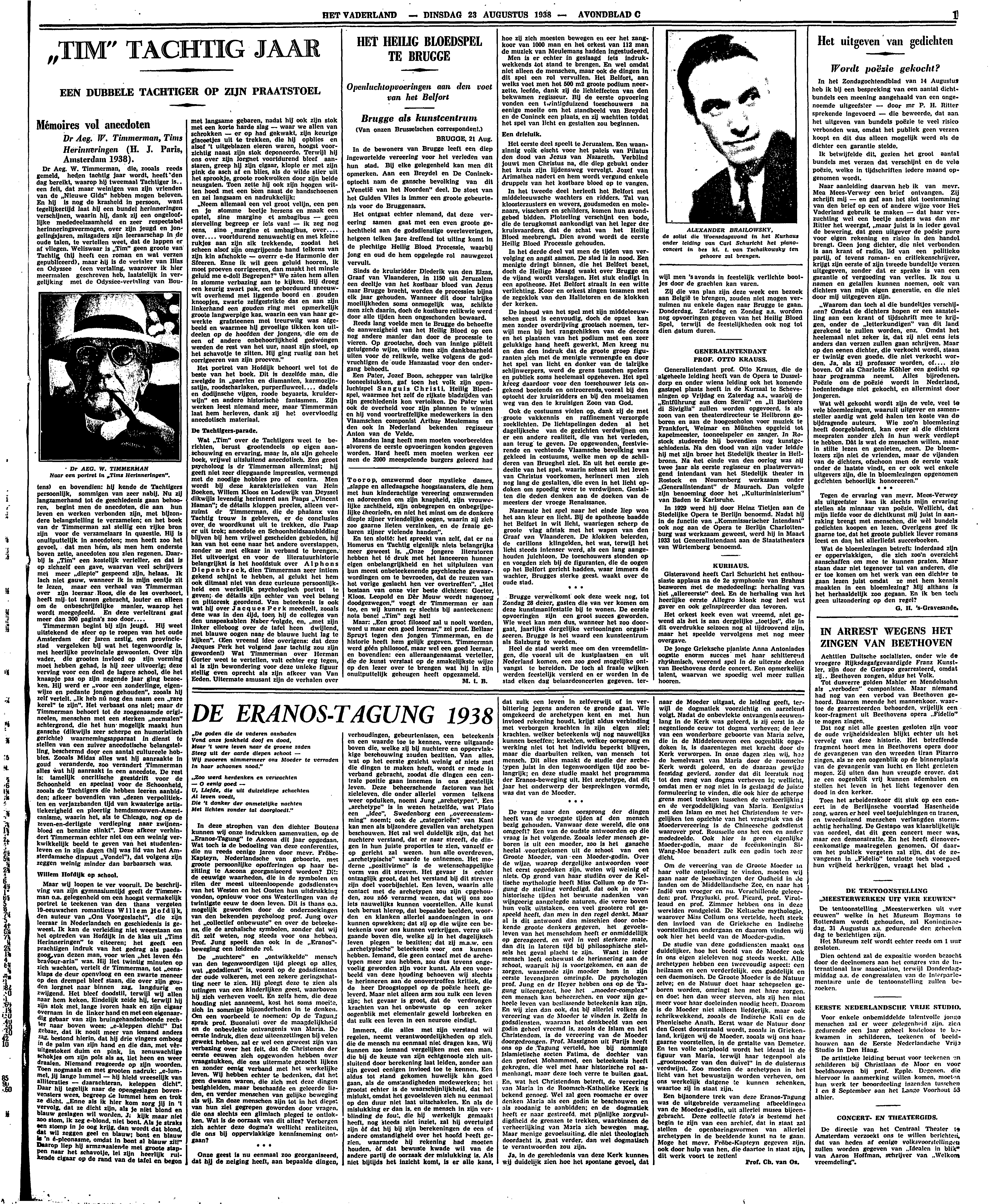 Dr Aeg. W. Timmerman, die, zooals reeds gemeld, heden tachtig jaar wordt, heeft den dag bereikt, waarop hij tweemaal Tachtiger is.. een feit, dat maar weinigen van zijn vrienden van de ‘Nieuwe Gids’ hebben mogen beleven. En hij is nog de krasheid in persoon, want tegelijkertijd laat hij een bundel herinneringen verschijnen, waarin hij, dank zij een ongelooflijke mededeelzaamheid en zeer respectabel herinneringsvermogen, over zijn jeugd en jongelingsjaren, mitsgaders zijn leeraarschap in de oude talen, te vertellen weet, dat de lappen er af vliegen. Weliswaar is ‘Tim’ geen groote van Tachtig (hij heeft een roman en wat verzen gepubliceerd), maar hij is de vertaler van Ilias en Odyssee (een vertaling, waarover ik hier meermalen geschreven heb, laatstelijk in vergelijking met de Odyssee-vertaling van Boutens) en bovendien: hij kende de Tachtigers persoonlijk, sommigen van zeer nabij. Nu zij langzamerhand tot de geschiedenis gaan behooren, begint men de anecdoten, die aan hun leven en werken verbonden zijn, met bijzondere belangstelling te verzamelen; en het boek van dr Timmerman zal stellig een rijke bron zijn voor de verzamelaars in quaestie. Hij is onuitputtelijk in anecdoten; men heeft zoo het gevoel, dat men hem, als men hem onderste boven zette, anecdoten zou zien regenen. Daarbij is ‘Tim’ een kostelijk verteller, en dat is op zichzelf een gave, waarvan veel schrijvers met meer ‘diepte’ gespeend zijn, helaas. Ik lach niet gauw, wanneer ik in mijn eentje zit te lezen, maar een verhaal van Timmerman over zijn leeraar Roos, die de les overhoort, heeft mij tot tranen gebracht, louter en alleen om de onbeschrijfelijke manier, waarop het wordt meegedeeld. En deze verteltrant gaat meer dan 300 pagina's zoo door....