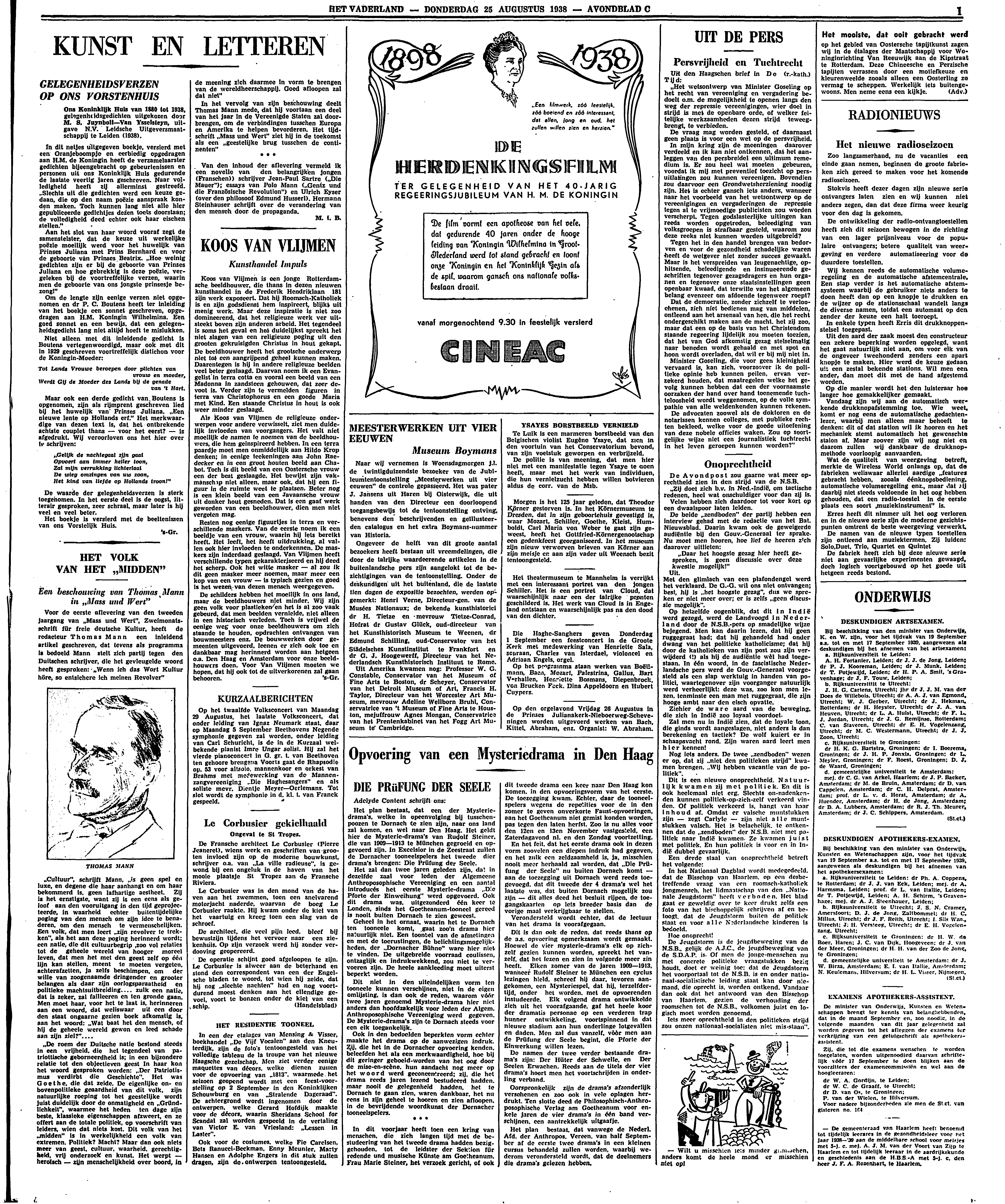 In het vervolg van zijn beschouwing deelt Thomas Mann mede, dat hij voortaan een deel van het jaar in de Vereenigde Staten zal doorbrengen, om de verbindingen tusschen Europa en Amerika te helpen bevorderen. Het tijdschrift ‘Mass und Wert’ ziet hij in de toekomst als een ‘geestelijke brug tusschen de continenten’