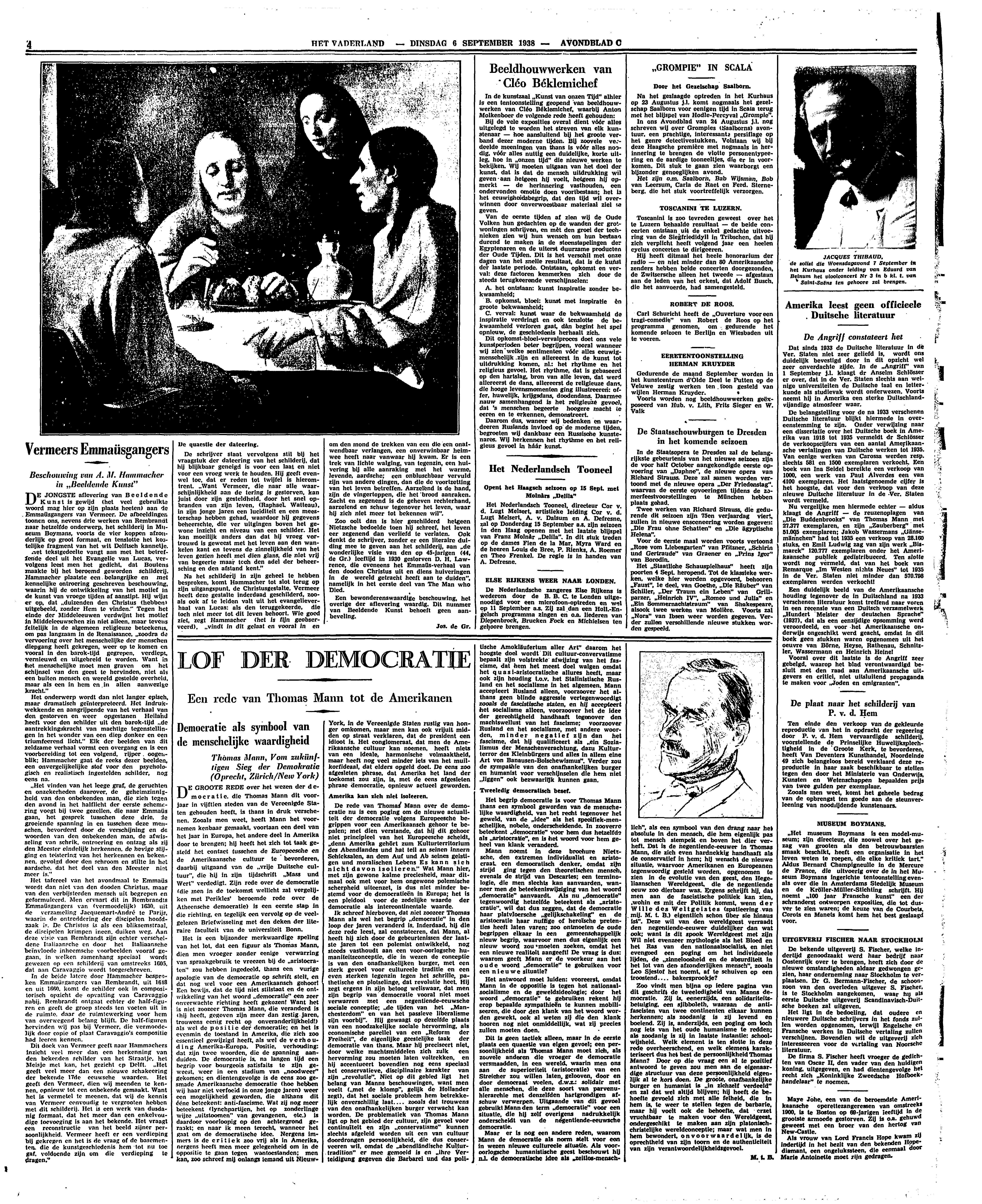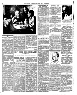DE GROOTE REDE over het wezen der democratie. die Thomas Mann dit voorjaar in vijftien steden van de Vereenigde Staten gehouden heeft, is thans in druk verschenen. Zooals men weet, heeft Mann het voornemen kenbaar gemaakt, voortaan een deel van het jaar in Europa, het andere deel in Amerika door te brengen; hij heeft het zich tot taak gesteld het contact tusschen de Europeesche en de Amerikaansche cultuur te bevorderen, daarbij uitgaand van de ‘vrije Duitsche cultuur’, die hij in zijn tijdschrift ‘Mass und Wert’ verdedigt. Zijn rede over de democratie (die men in de toekomst wellicht zal vergelijken met Perikles' beroemde rede over de Atheensche democratie) is een eerste stap in die richting, en tegelijk een vervolg op de veelgelezen Briefwisseling met den deken der literaire faculteit van de universiteit Bonn.