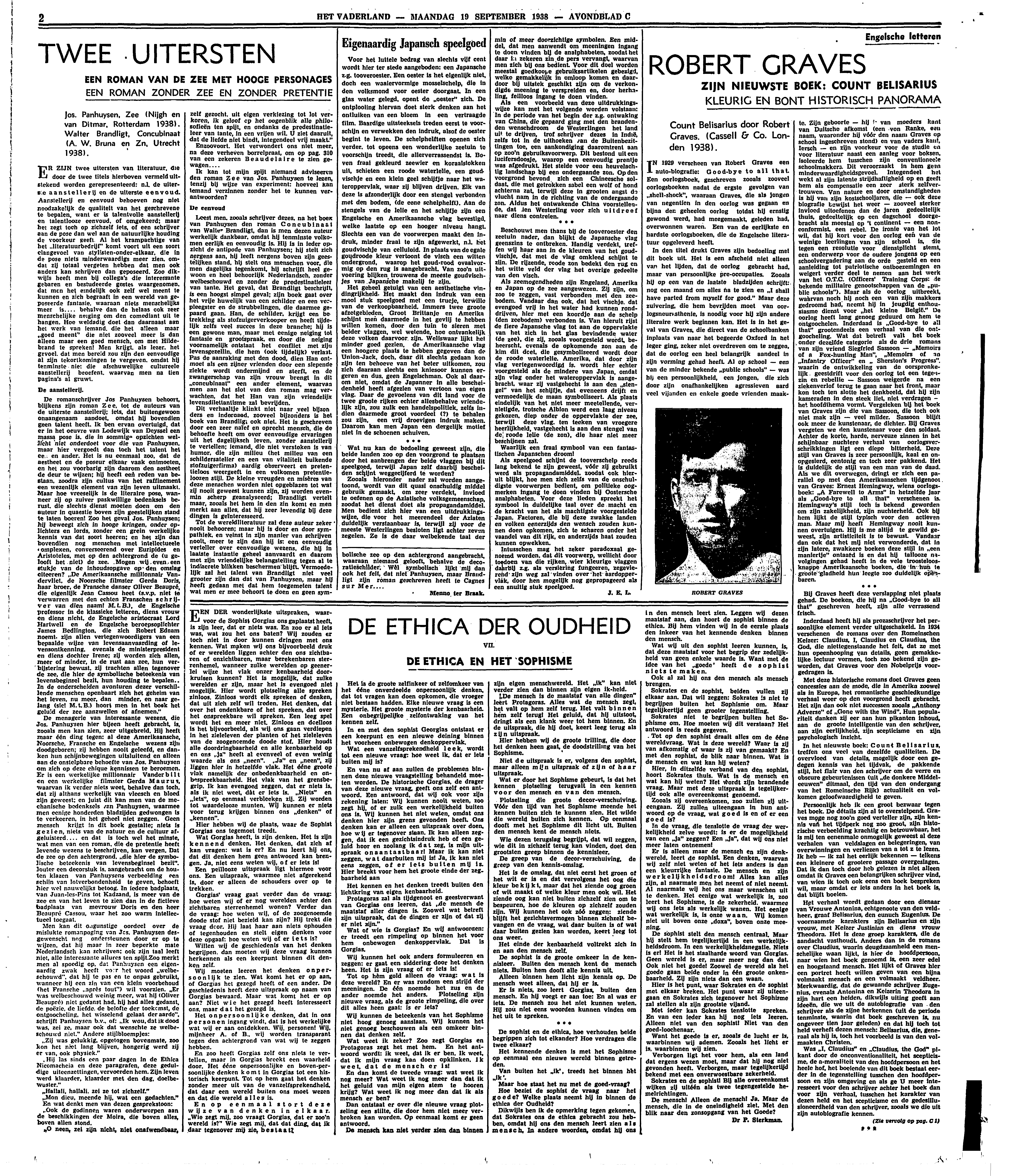 De romanschrijver Jos Panhuysen behoort, blijkens zijn roman Zee, tot de auteurs van de uiterste aanstellerij; iets, dat buitengewoon onaangenaam aandoet, omdat hij bovendien geen talent heeft. Ik ben ervan overtuigd, dat er in het oeuvre van Lodewijk van Deyssel een massa pose is, die in sommige opzichten wellicht niet onderdoet voor die van Panhuysen, maar hier vergoedt dan toch het talent het een en ander. Het is nu eenmaal zoo, dat de aestheet en de poseur elkaar vaak ontmoeten, en het zou voorbarig zijn daarom den aestheet de deur te wijzen; hij heeft een reden van bestaan, zoodra zijn cultus van het raffinement een wezenlijk element van zijn leven uitmaakt. Maar hoe vreeselijk is de literaire pose, wanneer zij op zuiver paskwillige bedenksels berust, die slechts dienst moeten doen om den auteur in quaestie boven zijn geestelijken stand te laten boeren! Zoo het geval Jos. Panhuysen; hij beweegt zich in hooge kringen, onder oplichters en lords, zonder een grein werkelijke kennis van dat soort heeren; en het zijn dan bovendien nog menschen met intellectueele complexen, converseerend over Euripides en Aristoteles, met op den achtergrond de (u gelooft het niet) de zee. Mogen wij even een stukje van de inhoudsopgave op den omslag citeeren? ‘De Amerikaansche millionnair Vandervliet, de Noorsche filmster Gerda Doris, haar broer, de Fransche danser Oliver Beaupré, die eigenlijk Jean Cassou heet (s.v.p. niet te verwarren met den echten Franschen schrijver van dien naam! M.t.B.), de Engelsche professor in de klassieke letteren, diens vrouw en diens nicht, de Engelsche aristocraat Lord Hartwell en de Engelsche beroepsoplichter James Bedlington, die zich Robert Ednam noemt, zijn allen vertegenwoordigers van een bepaalde wijze van levensaanvaarding of levensontkenning, evenals de ministerpresident en diens dochter Irene; zij worden zich allen, meer of minder, in de rust aan zee, hun verbijstering bewust, zij trachten allen tegenover de zee, die hier de symbolische beteeken is van levensbeginsel bezit, hun houding te bepalen.. In de onderscheiden avonturen dezer verschillende menschen openbaart zich het geheim van het leven, nu meer, dan minder, en naar gelang (sic! M.t.B.) hoort men in het boek het geluid der zee aanzwellen of afnemen.’