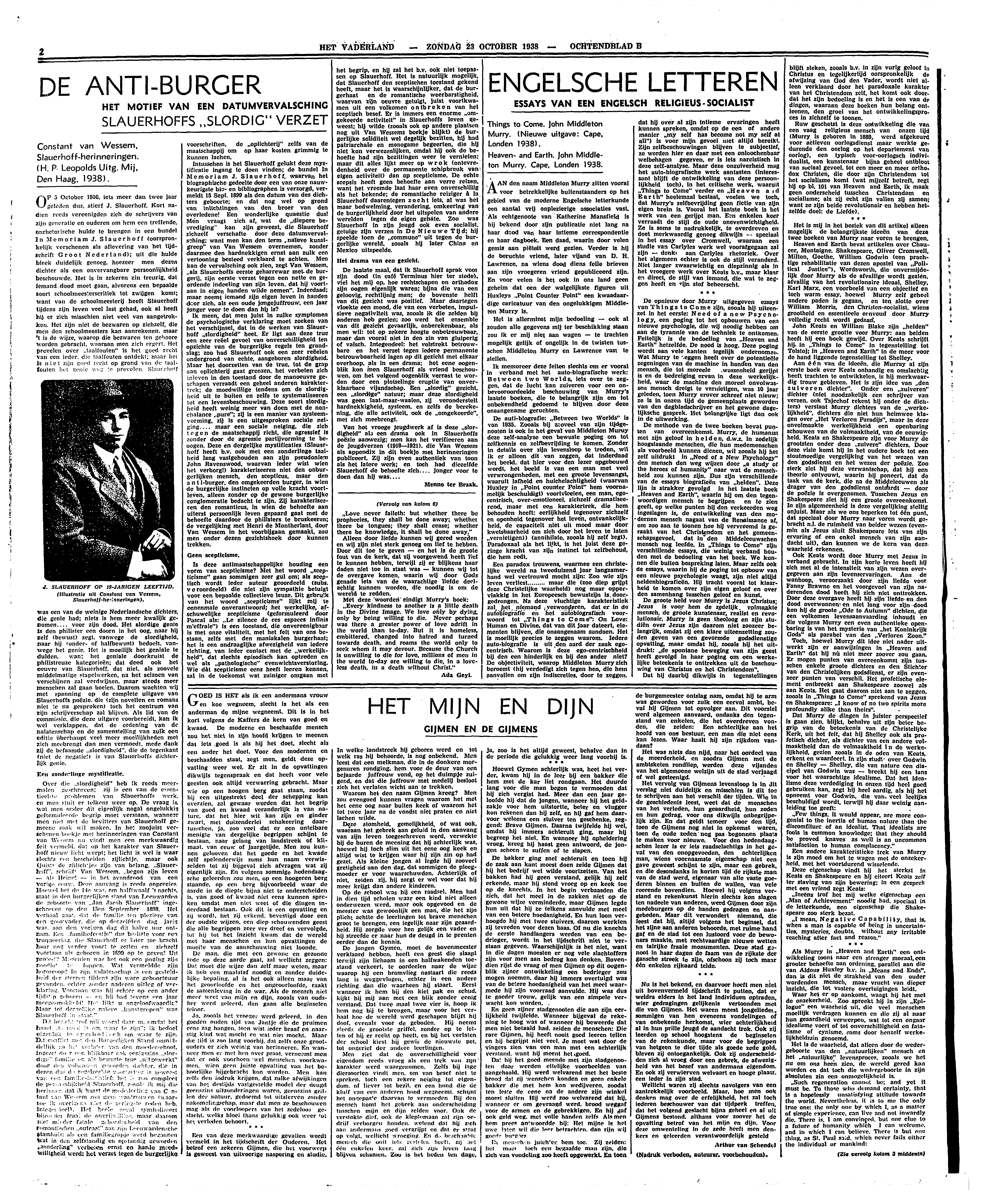 OP 5 October 1936, iets meer dan twee jaar geleden dus, stierf J. Slauerhoff. Kort nadien reeds vereenigden zich de schrijvers van zijn generatie en ouderen om hem een treffende, onrhetorische hulde te brengen in een bundel In Memoriam J. Slauerhoff (oorspronkelijk verschenen als aflevering van het tijdschrift Groot Nederland); uit die hulde bleek duidelijk genoeg, hoezeer men dezen dichter als een onvervangbare persoonlijkheid beschouwde. Het is in zekeren zin treurig, dat iemand dood moet gaan, alvorens een bepaalde soort schoolmeesterscritiek tot zwijgen komt; want van de schoolmeesterij heeft Slauerhoff tijdens zijn leven veel last gehad, ook al heeft hij er zich misschien niet veel van aangetrokken. Het zijn niet de bezwaren op zichzelf, die men den schoolmeesters kan aanrekenen, maar 't is de wijze, waarop die bezwaren ten gehoore worden gebracht, waaraan men zich ergert. Het prevelen over ‘taalfouten’ is het goed recht van een ieder, die taalfouten ontdekt; maar het is niet zijn goed recht op grond van de taalfouten het genie weg te prevelen. Slauerhoff was een van de weinige Nederlandsche dichters, die genie had; niets is hem meer kwalijk genomen.... voor zijn dood. Het slordige genie is den philister een doorn in het oog, naar hij zelf (bewust) zegt, vanwege de slordigheid, naar hij (onder- of halfbewust) bedoelt, vanwege het genie. Het is moeilijk het geniale te dulden, want het geniale doorkruist de philistreuze kategorieën; dat deed ook het oeuvre van Slauerhoff, dat niet, als zoovele middelmatige stapelwerken, na het seizoen van verschijnen zal verdwijnen, maar steeds meer menschen zal gaan boeien. Daarom wachten wij met spanning op de complete uitgave van Slauerhoffs poëzie, die (zijn novellen en romans niet te na gesproken) toch het centrum van zijn schrijverschap zal blijven. Als lid van de commissie, die deze uitgave voorbereidt, kan ik wel verklappen, dat de ordening van de nalatenschap en de samenstelling van zulk een editie überhaupt veel meer moeilijkheden met zich meebrengt dan men vermoedt, mede dank zij de befaamde ‘slordigheid’, die de tegenkant (niet de negatie!) is van Slauerhoffs dichterlijk genie.