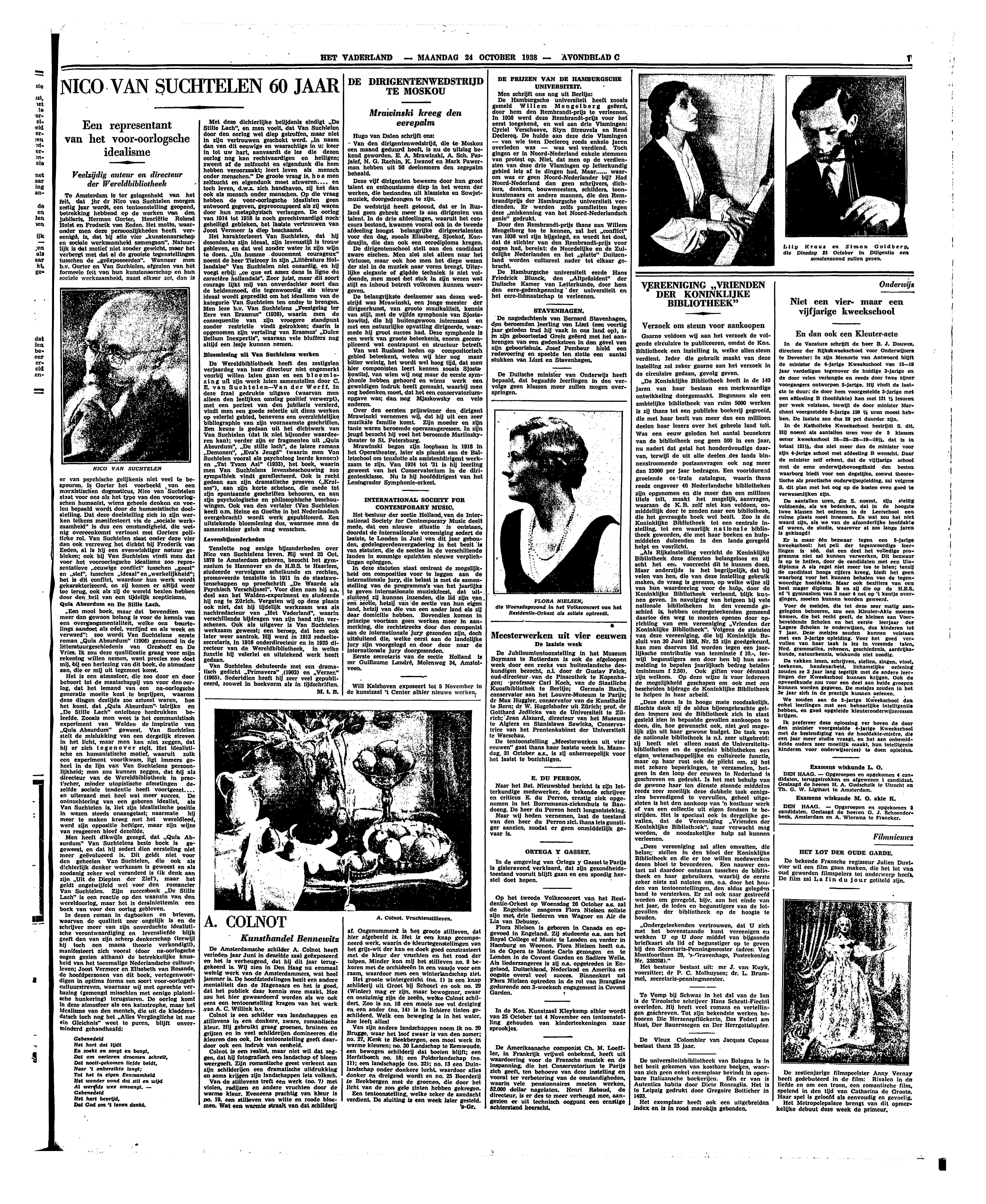 Te Amsterdam is ter gelegenheid van het feit, dat jhr dr Nico van Suchtelen morgen zestig jaar wordt, een tentoonstelling geopend, betrekking hebbend op de werken van den jubilaris, Herman Gorter, Henriëtte Roland Holst en Frederik van Eeden. Het motto, waaronder men deze persoonlijkheden heeft vereenigd, is, dat bij alle vier ‘kunstenaarschap en sociale werkzaamheid samengaan’. Natuurlijk is dat motief niet zonder gewicht, maar het verbergt met dat al de grootste tegenstellingen tusschen de ‘geëxposeerden’. Wanneer men b.v. Gorter en Van Suchtelen, afgezien van het formeele feit van hun kunstenaarschap en hun sociale werkzaamheid, naast elkaar zet, dan is er van psychische gelijkenis niet veel te bespeuren. Is Gorter het voorbeeld van een marxistischen dogmaticus, Nico van Suchtelen staat voor ons als het type van den vooroorlogschen humanist, wiens geheele denken en voelen bepaald wordt door de humanistische doelstelling. Dat deze doelstelling zich in zijn werken telkens manifesteert via de ‘sociale werkzaamheid’ is dus een omstandigheid, die weinig overeenkomst vertoont met Gorters politieke rol. Van Suchtelen staat onder deze vier dan ook verreweg het dichtst bij Frederik van Eeden, al is hij een evenwichtiger natuur gebleken; ook bij Van Suchtelen vindt men dat voor het vooroorlogsche idealisme zoo representatieve ‘eeuwige conflict’ tusschen ‘geest’ en ‘stof’, tusschen ‘ideaal’ en ‘werkelijkheid’; het is dit conflict, waardoor hun werk wordt gekarakteriseerd, en zij komen er altijd weer toe terug, ook als zij de wereld bezien hebben door den bril van een tijdelijk scepticisme.